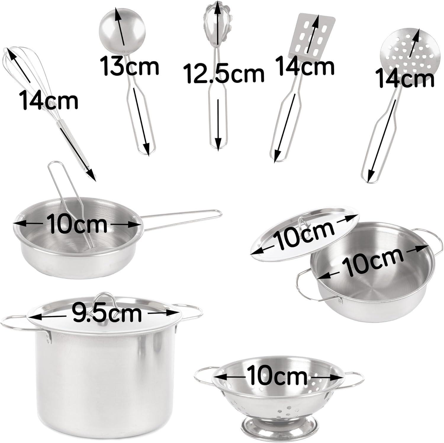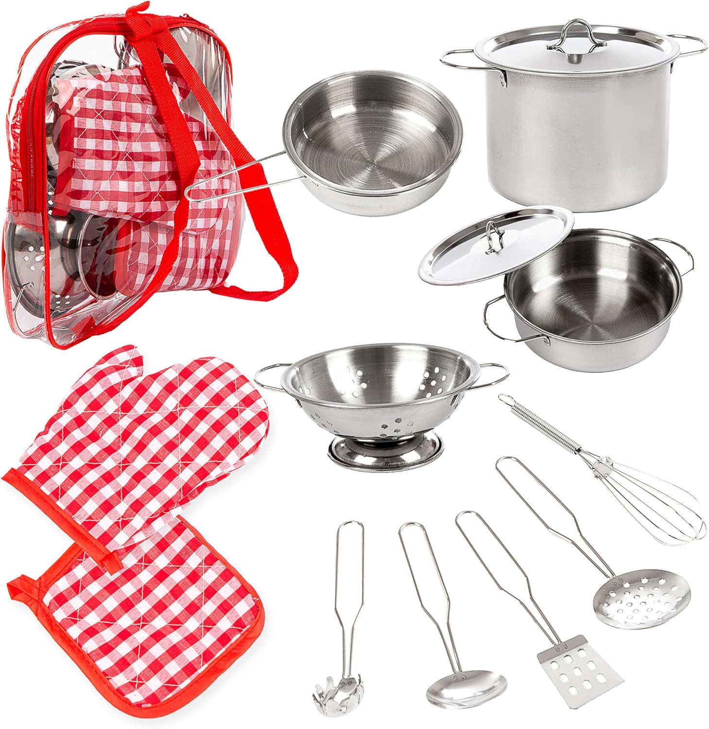 DIVERTIMENTO IN CUCINA REALISTICO => L'acciaio inossidabile di alta qualità con bordi arrotondati e dimensioni adatte ai bambini garantisce un vero aspetto da pentola: durevole e stabile per il gioco quotidiano. VALORE AGGIUNTO EDUCATIVO => Promuove le capacità motorie, la creatività e le abilità sociali; ideale per giochi di ruolo da soli o insieme. Rafforza la coordinazione occhio-mano e lo sviluppo del linguaggio. OVUNQUE => Facile da trasportare in uno zaino chiudibile a chiave (22 x 4,5 x 22 cm). Pulire diventa facile: perfetto quando sei in viaggio, in vacanza, con gli amici o all'asilo. SET AMPIO => 12 pezzi: pentola grande, pentola piccola, padella, coperchio universale, scolapasta, mestolo, spatola, frusta, schiumarola, cucchiaio per pasta, guanto da forno, panno. ROBUSTO E FACILE DA MANUTENERE => Adatto per cucine da gioco e cucine in fango: resistente, veloce da pulire e facile da pulire. Consigliato dai 36 mesi.