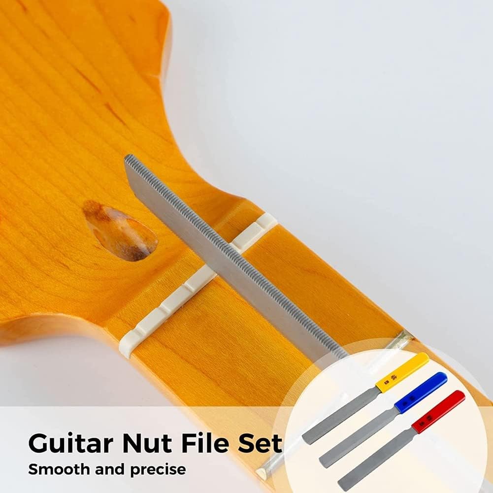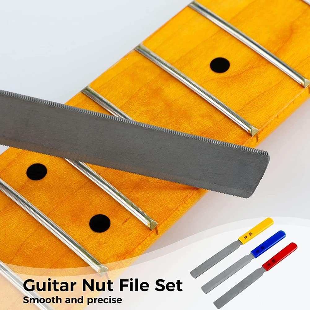 Facile da usare: produzione accurata, scala precisa con micro-errore, tagliente affilato e superficie di archiviazione lunga per una facile realizzazione di scanalature e l'impugnatura in gomma è comoda da usare. Set di per per chitarra: assicurati che le tue corde si trovino correttamente nel ronzii, questa temperata con taglio del bordo produce fessure a fondo tondo per e selle. I file professionali sono un must per gli appassionati di chitarra. Economico e pratico: risparmia il fastidio di la tua chitarra in un negozio più volte all'anno. La riparazione di base di una chitarra è un processo abbastanza semplice. È un'abilità preziosa che ogni chitarrista dovrebbe imparare in quanto ti farà risparmiare un sacco di tempo e denaro. Costruito per durare: realizzato in acciaio al carbonio con impugnatura ergonomica in gomma, antiscivolo e da usare. Viene fornito con 3 file con 6 diverse dimensioni, .045 pollici / .065 pollici / .075 pollici / .085 pollici / .105 pollici / .130 pollici per soddisfare le diverse esigenze. Ampiamente usato: questo set di per per chitarra è stato creato appositamente per aiutare a completare le riparazioni e le regolazioni più comuni come chitarra elettrica, chitarra acustica, basso, ukulele, banjo, ecc.