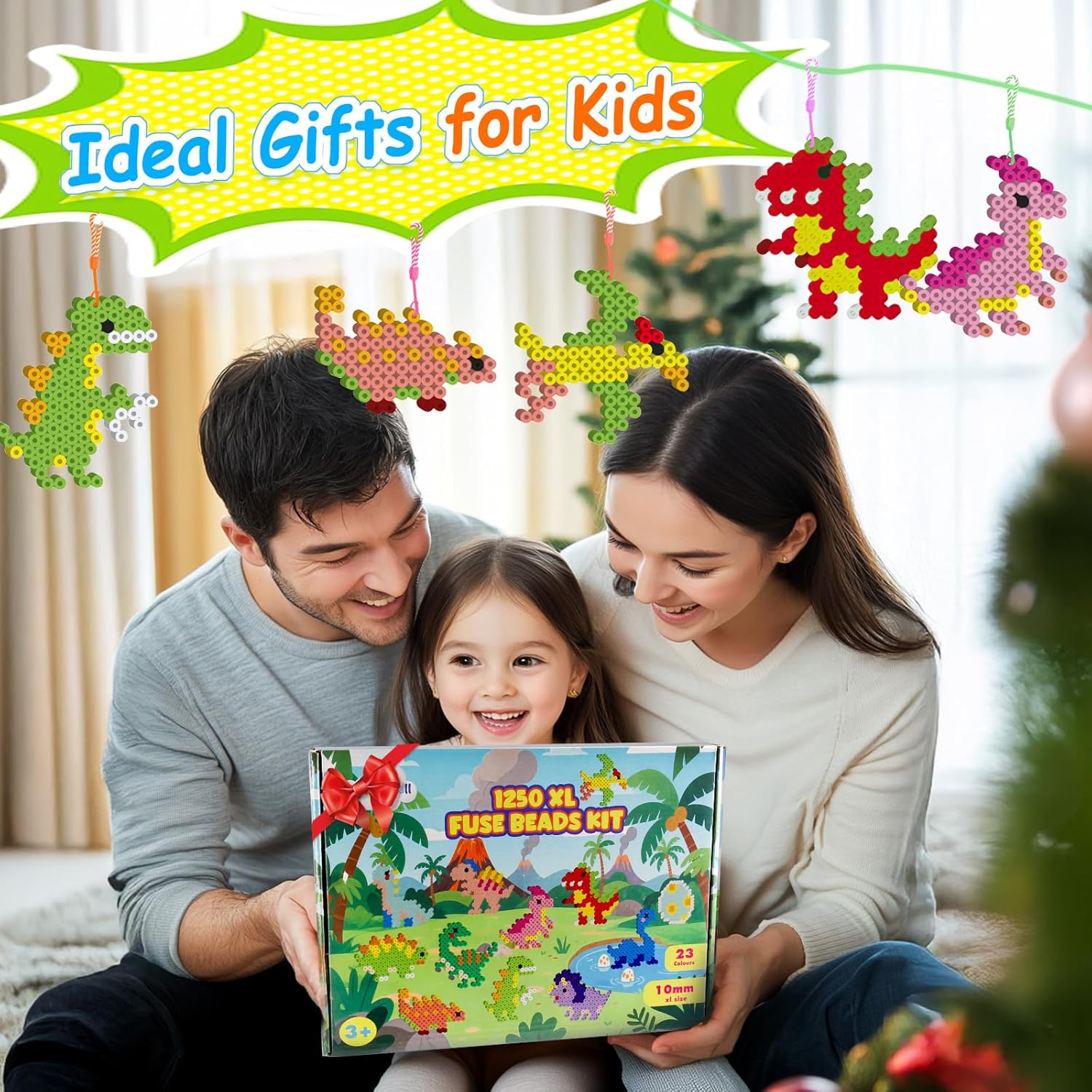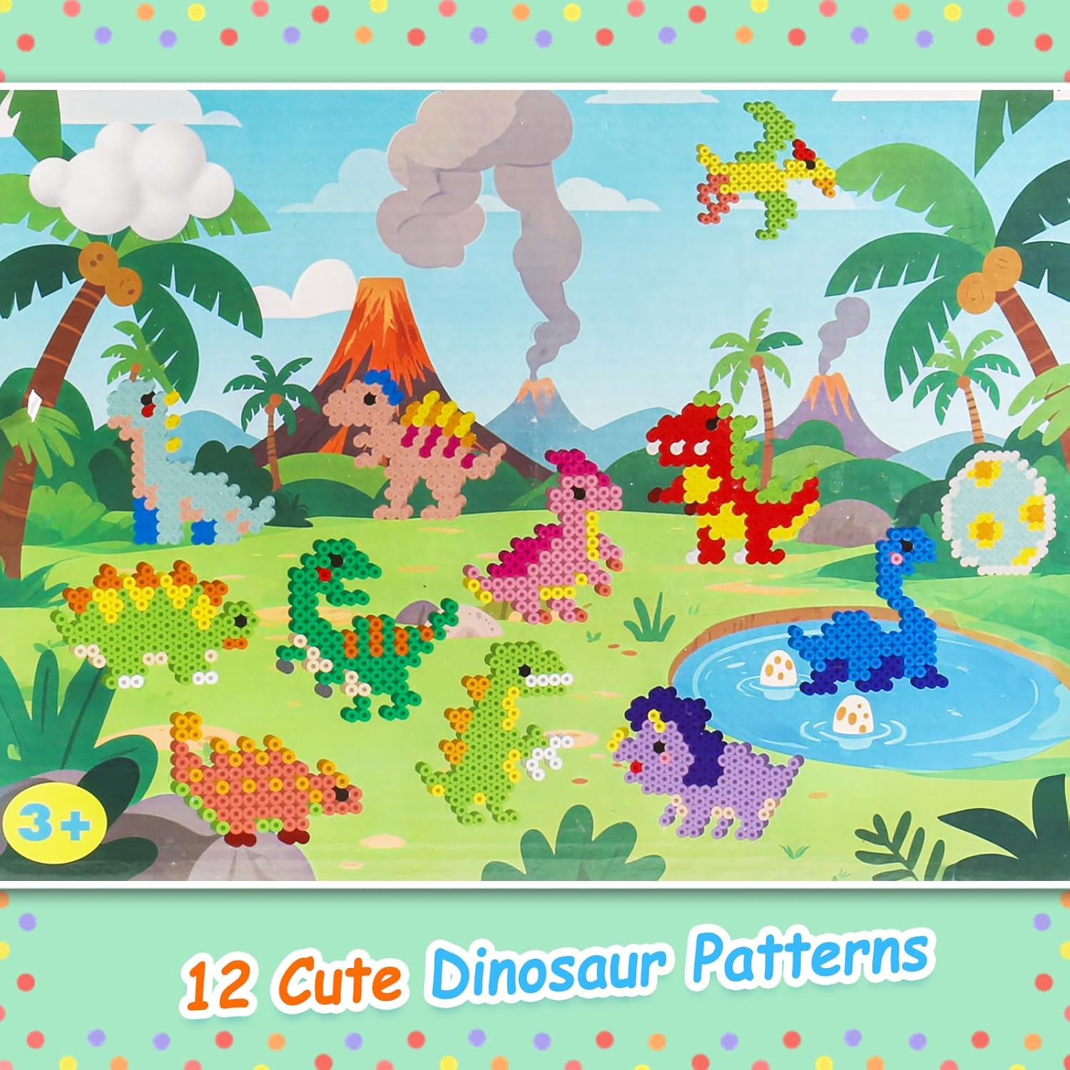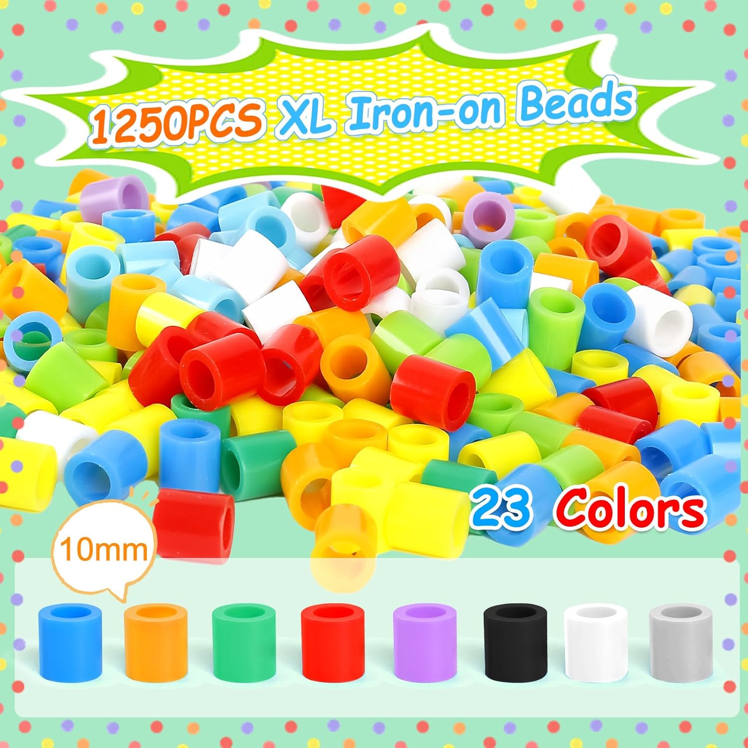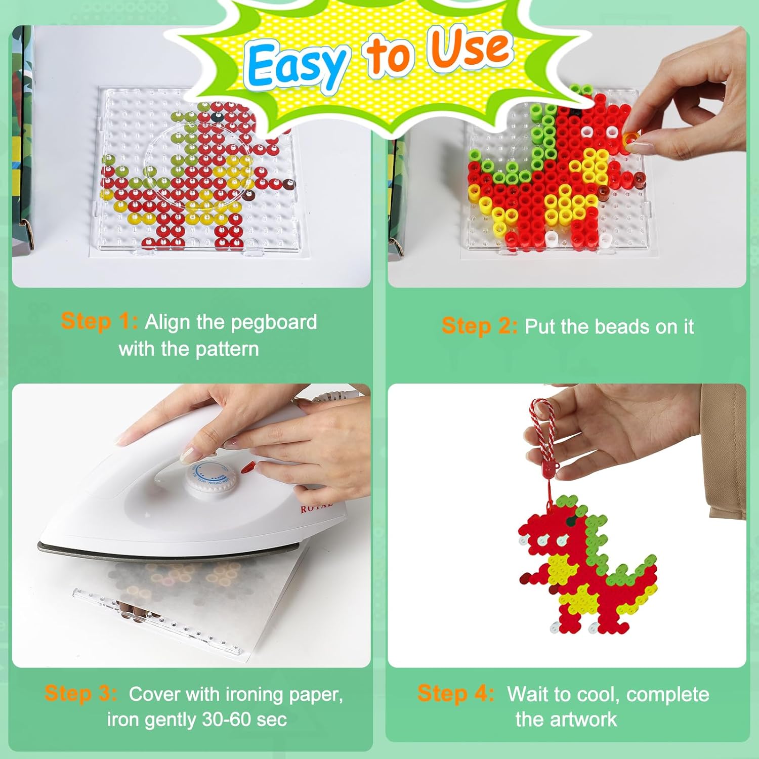 Per bambini dai 3 anni in su: questo set di perline in polietilene ecologico di alta qualità è perfetto per bambini dai 3 anni in su. Le perle sono prive di sostanze chimiche nocive e offrono un ambiente di gioco a basso rischio grazie alla loro natura sicura e atossica. Grazie al formato XL, le perline sono facili da impugnare anche per le mani piccole e favoriscono le abilità motorie e la coordinazione occhio-mano. Tema di 12 animali marini: il set di perline da stirare da 10 mm contiene 12 fantastici motivi dinosauri, tra cui Tyrannosaurus Rex, Velociraptor, Stegosauro, pterosauro, Mosasaurier, triceratopo, ecc. I bambini possono creare i propri schemi di traffico sviluppando creatività, concentrazione e immaginazione. Ideale per promuovere l'espressione artistica e il lavoro di squadra durante le attività di gruppo. Set di 1250 perline da stirare: con 1250 perline di alta qualità da 10 mm in 23 colori vivaci (ad esempio bianco, blu, viola, giallo) i bambini possono dare libero sfogo alla loro immaginazione e creare diversi design e modelli. Le perline consentono ai bambini di creare opere d'arte sia semplici che complesse, stimolando la pazienza e le capacità di risoluzione dei problemi. Versatile: sia per un gioco creativo, una festa di compleanno, a scuola o a casa, questo set di perline è perfetto per le attività di gruppo. È una scelta perfetta per ambienti sociali ed educativi e consente ai bambini di lavorare in team, condividere le loro idee creative e imparare a creare qualcosa insieme. Facile da usare con pratici accessori: il set di perline XL viene fornito con tutto il necessario per iniziare subito: un tagliere, carta da stiro, 8 corde per appendere, un filo colorato lungo 2 metri e istruzioni dettagliate (lingua italiana non garantita). Il processo di stiratura è semplice e sicuro, con le istruzioni che spiegano l'applicazione corretta per ottenere i migliori risultati. Con l'aiuto del riscaldamento, le perle possono essere sciolte nella forma desiderata. Istruzioni per la stiratura: coprire le perline con carta da stiro e preriscaldare il ferro da stiro a livello medio. Stirare con movimenti circolari per 30-60 secondi fino a quando le perline si fondono. Dopo un leggero raffreddamento, rimuovere il modello dalla breadboard e premere con un peso per 2 minuti per evitare deformazioni. Nota importante: stirare solo sotto la supervisione di un adulto per evitare scottature