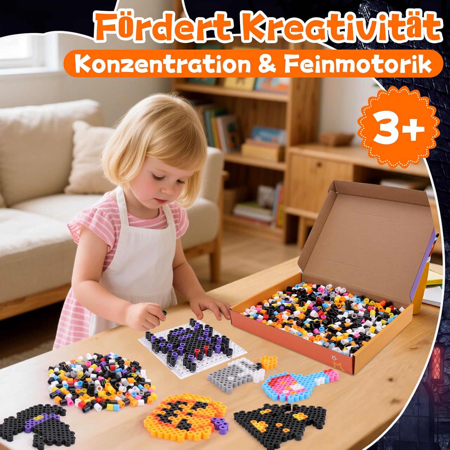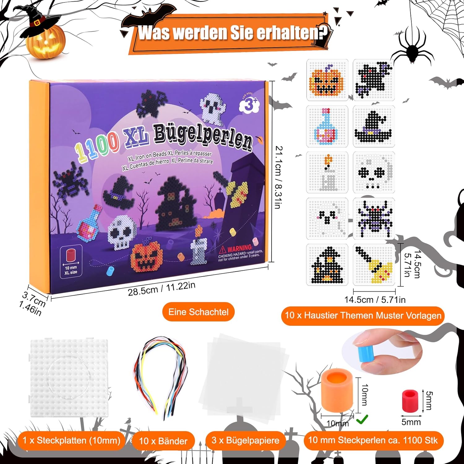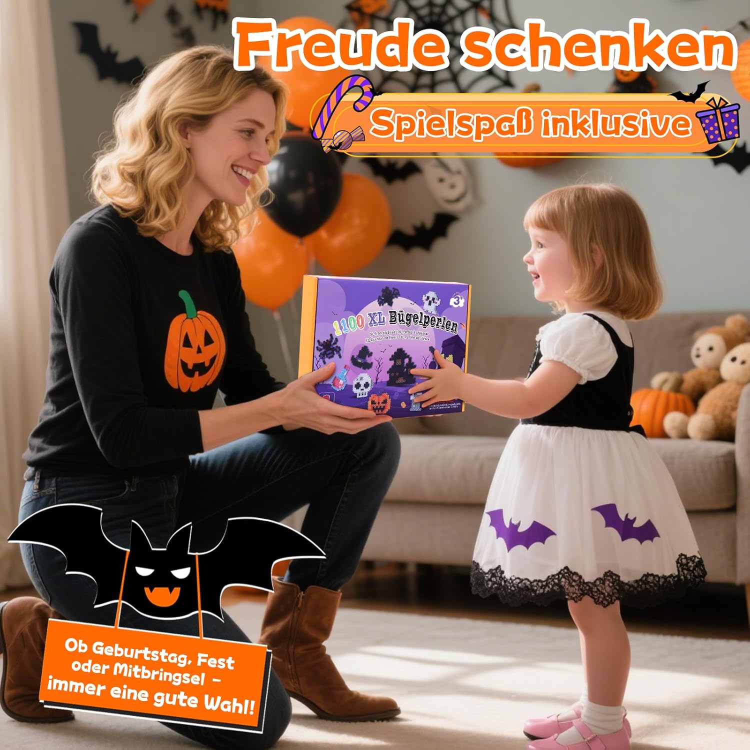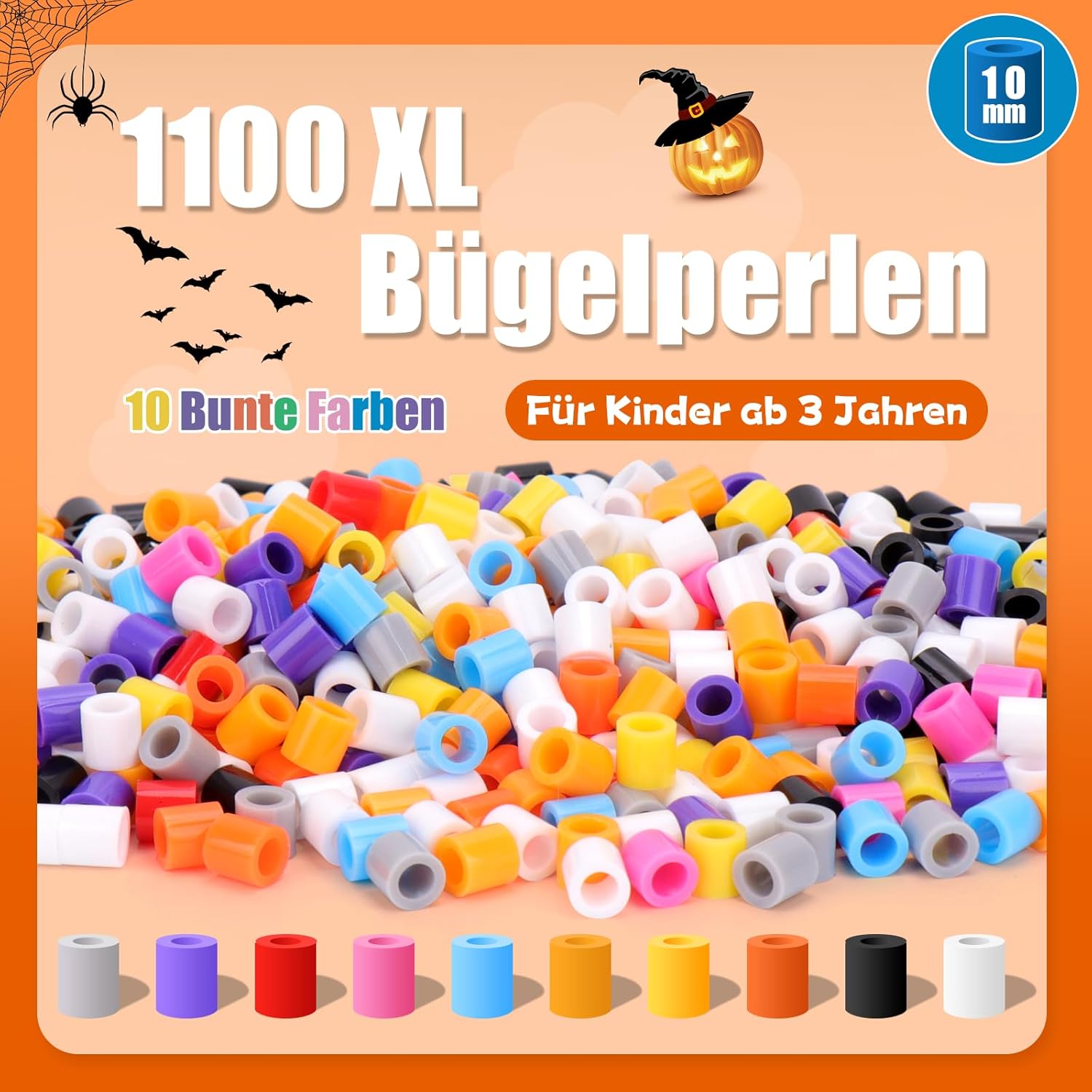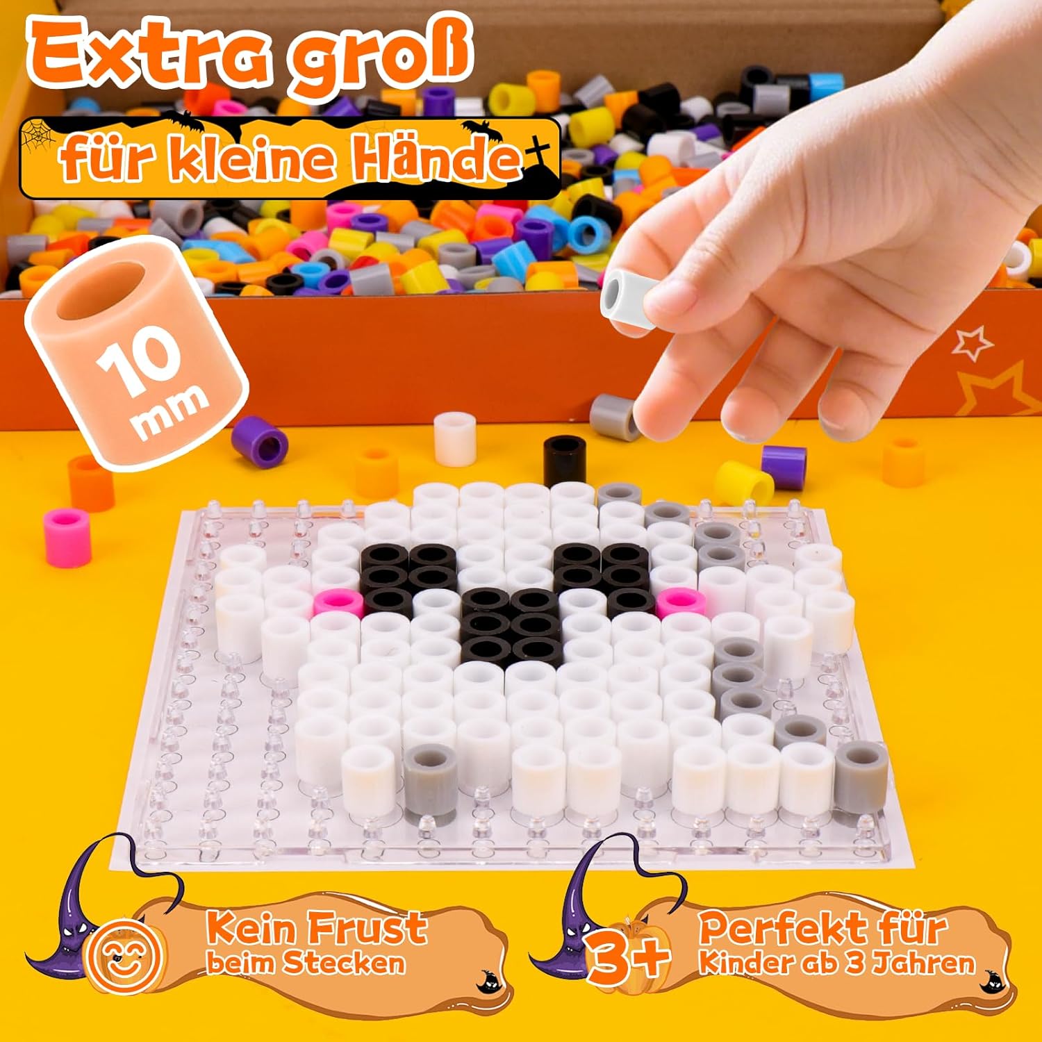 Sicure per bambini dai 3 anni in su: perline da stirare da 10 mm in plastica priva di BPA e ftalati. Le perle extra grandi riducono al minimo i rischi di ingestione e garantiscono un gioco sicuro a casa, in kita o in viaggio. Ampio set fai da te per Halloween: circa 1100 Maxi perline da stirare (10 mm) in 10 colori, 10 motivi di Halloween, 1 piastra trasparente, 3 fogli e 10 nastri. Tutto incluso per l'artigianato creativo. Decorazione per Halloween e idea regalo: per creare zucche, fantasmi, teschi, pipistrelli, cappelli da strega, scope e molto altro ancora. Perfetto come divertimento fai da te per bambini e come regalo per Halloween. Dimensioni XXL e alta stabilità: le perle grandi (10 mm) sono facili da afferrare e posizionare. Robusto, non stinge e non si deforma, anche dopo aver stirato ripetutamente. Stirare solo da adulti. ️ Stimola le capacità motorie e la creatività: la posa delle perle allena le abilità motorie, la concentrazione e la pazienza. Ideale per i genitori che vogliono combinare giochi educativi e divertimento.