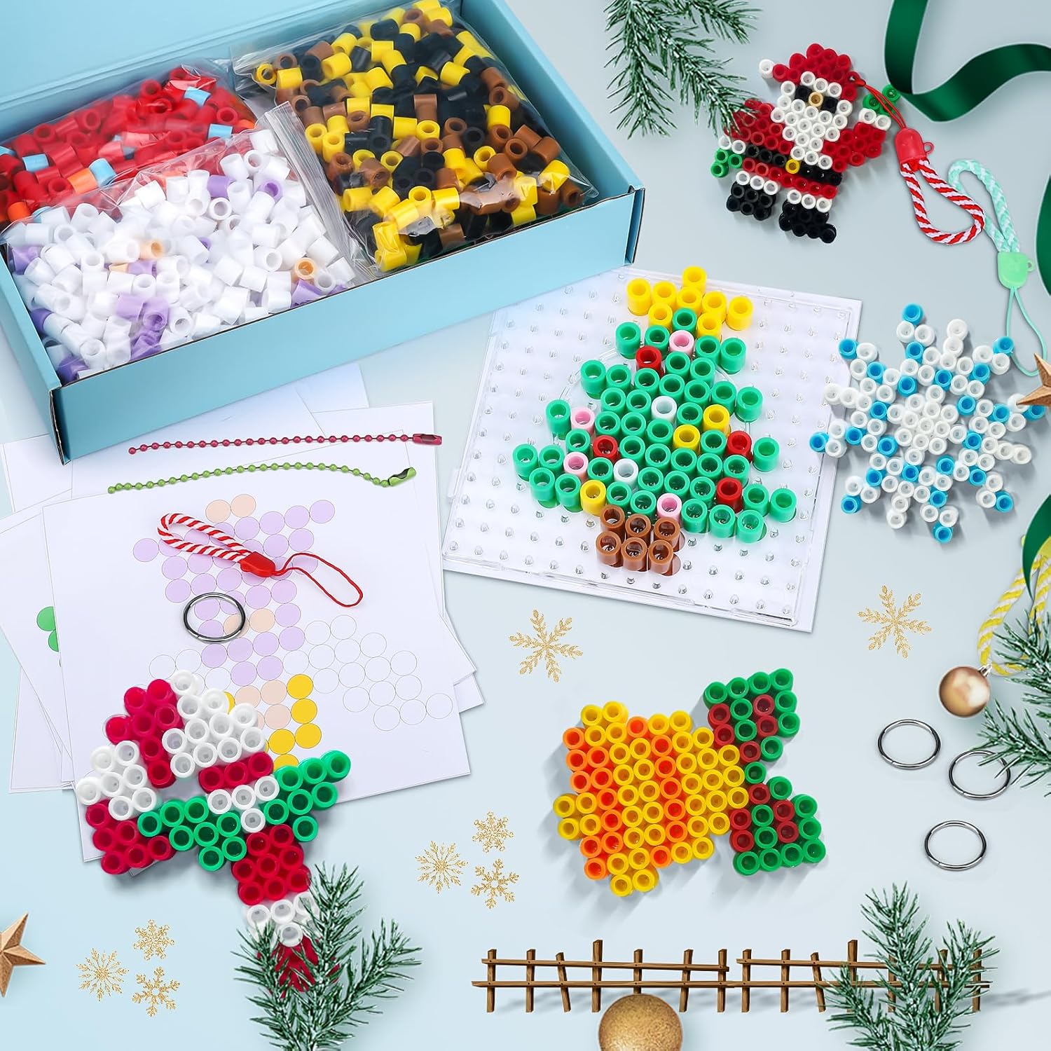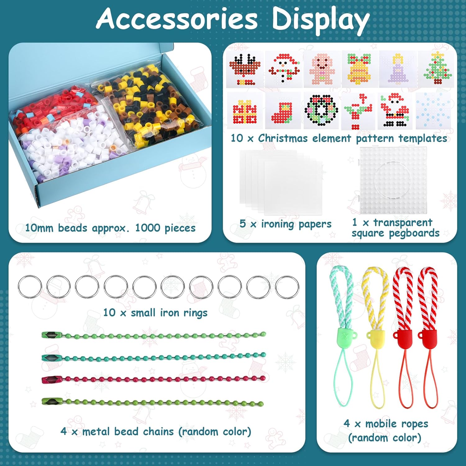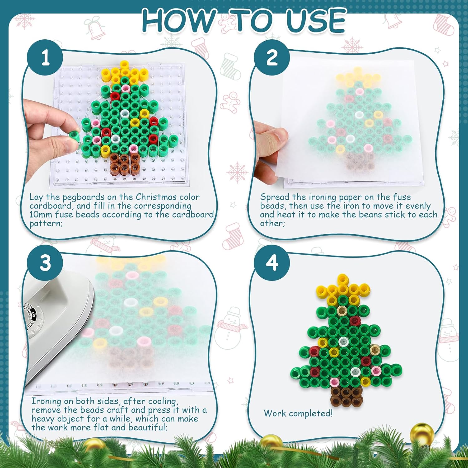 🎄【Set di perline termoadesive grandi da 10 mm】Set di perline termoadesive natalizie maxi con una varietà di accessori: circa 1000 perline termoadesive (10 mm) in 14 colori. Il numero di perline termoadesive dipende dai requisiti del modello, quindi il numero di singoli colori varia. Le perline termoadesive natalizie sono realizzate in materiale EVA ecologico che non produce odori sgradevoli durante la stiratura, consentendo ai bambini di creare i loro lavoretti preferiti in modo sicuro e protetto 🎅【Temi natalizi】Decorazioni uniche per l'albero di Natale che hai realizzato tu stesso, come Babbo Natale, campane, pupazzi di neve, fiocchi di neve, alci, slitte, omini di pan di zenzero, alberi di Natale, ecc. I tuoi bambini possono creare creazioni fai da te sui modelli quadrati di perline termoadesive utilizzando questi cartoncini colorati. Numerosi accessori e una varietà di colori offrono maggiori possibilità creative, rendendolo il modo perfetto per trascorrere del tempo insieme 🔔【Giocattolo educativo】Questo set di modelli di perline termoadesive natalizie può facilmente distrarre l'attenzione dei bambini dai prodotti elettronici, migliorando le loro capacità manuali e il riconoscimento dei colori. È adatto a molti bambini per creare insieme, comunicare e provare diverse gioie, migliorando le loro abilità manuali. Crea opere d'arte natalizie con i tuoi bambini durante il periodo natalizio per esprimere i tuoi migliori auguri per Natale 🎅【Facile da usare】Questo set di perline termoadesive decorative natalizie è incredibilmente facile da usare. Basta posizionare le perline del colore corrispondente sulla tavola secondo il modello, quindi posizionare la carta da stiro sopra le perline e stirare delicatamente con un ferro da stiro fino a quando le perline si fondono. Quindi stirare l'altro lato e attendere che si raffreddino per completare l'opera d'arte 🎁【Regalo perfetto】Questo set di perline termoadesive natalizie è un regalo di Natale ideale per i bambini che amano i lavoretti manuali. È particolarmente adatto ai bambini che usano questo lavoretto per creazioni fai da te durante feste, compleanni e altre attività. Il prodotto finito con perline termoadesive può essere utilizzato come portachiavi, ciondolo per cellulare o incollato al frigorifero come decorazione, ecc. Può essere utilizzato come premio per famiglie, scuole e campeggi, il che lo rende un regalo perfetto