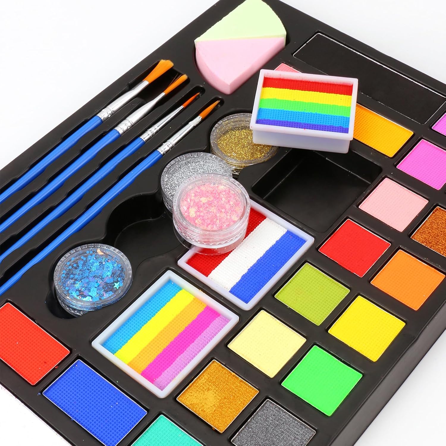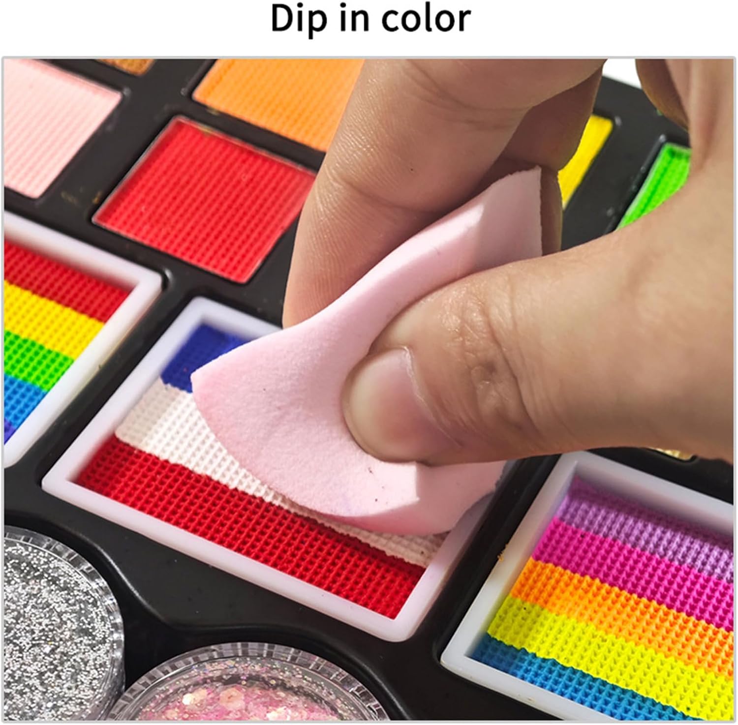 Lascia correre la tua immaginazione e inventa momenti favolosi per le feste, portando più momenti di divertimento La pittura del viso può essere facilmente rimossa utilizzando acqua o un panno umido Adatto per scuola, eventi sportivi, eventi comunitari, Halloween o altri festival La consistenza è leggera e traspirante e non aggiunge peso alla pelle Mescolare alcune gocce d'acqua nella vernice e mescolare bene con un pennello per disegnare uno splendido motivo colorato