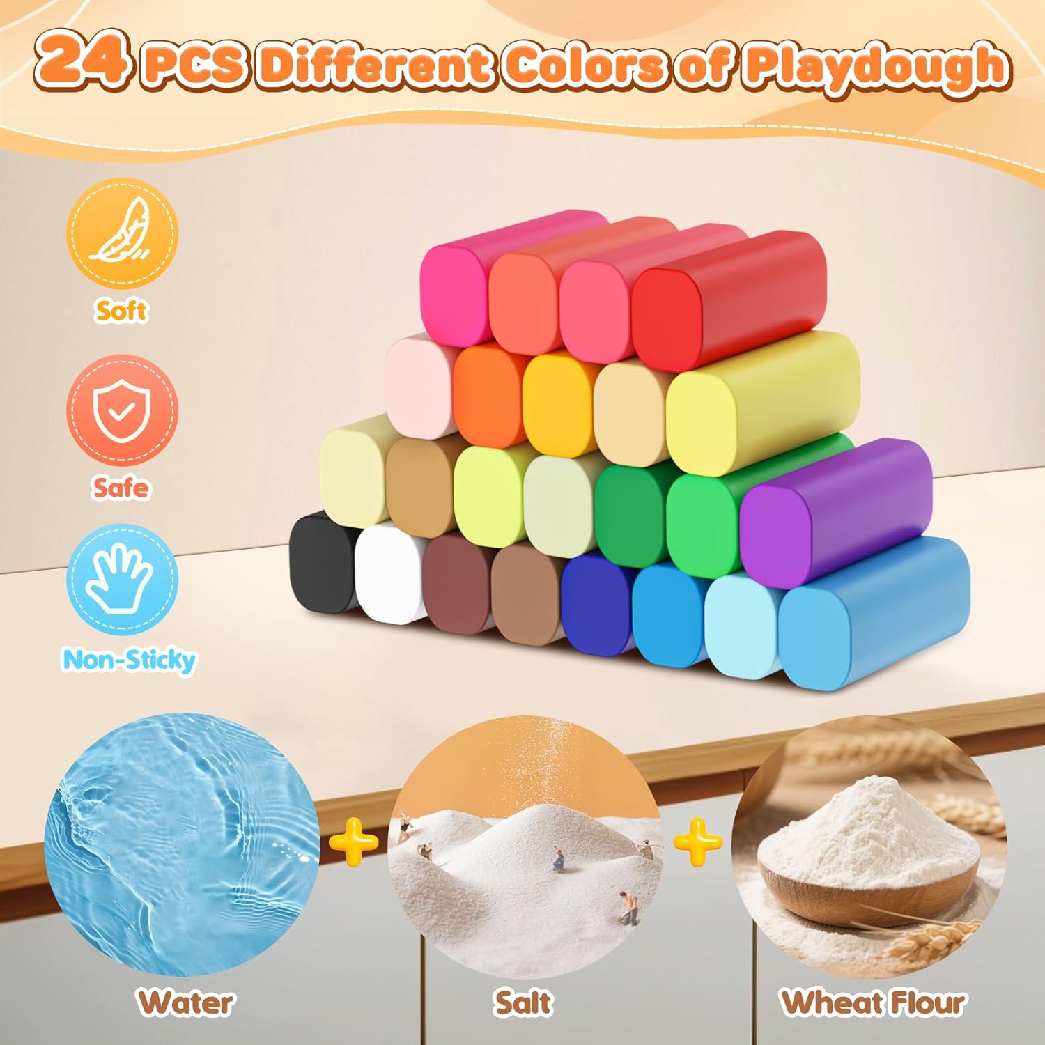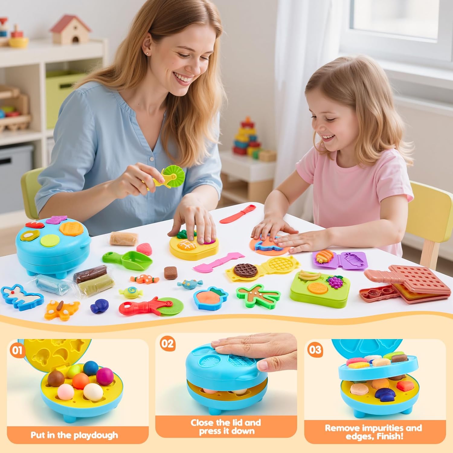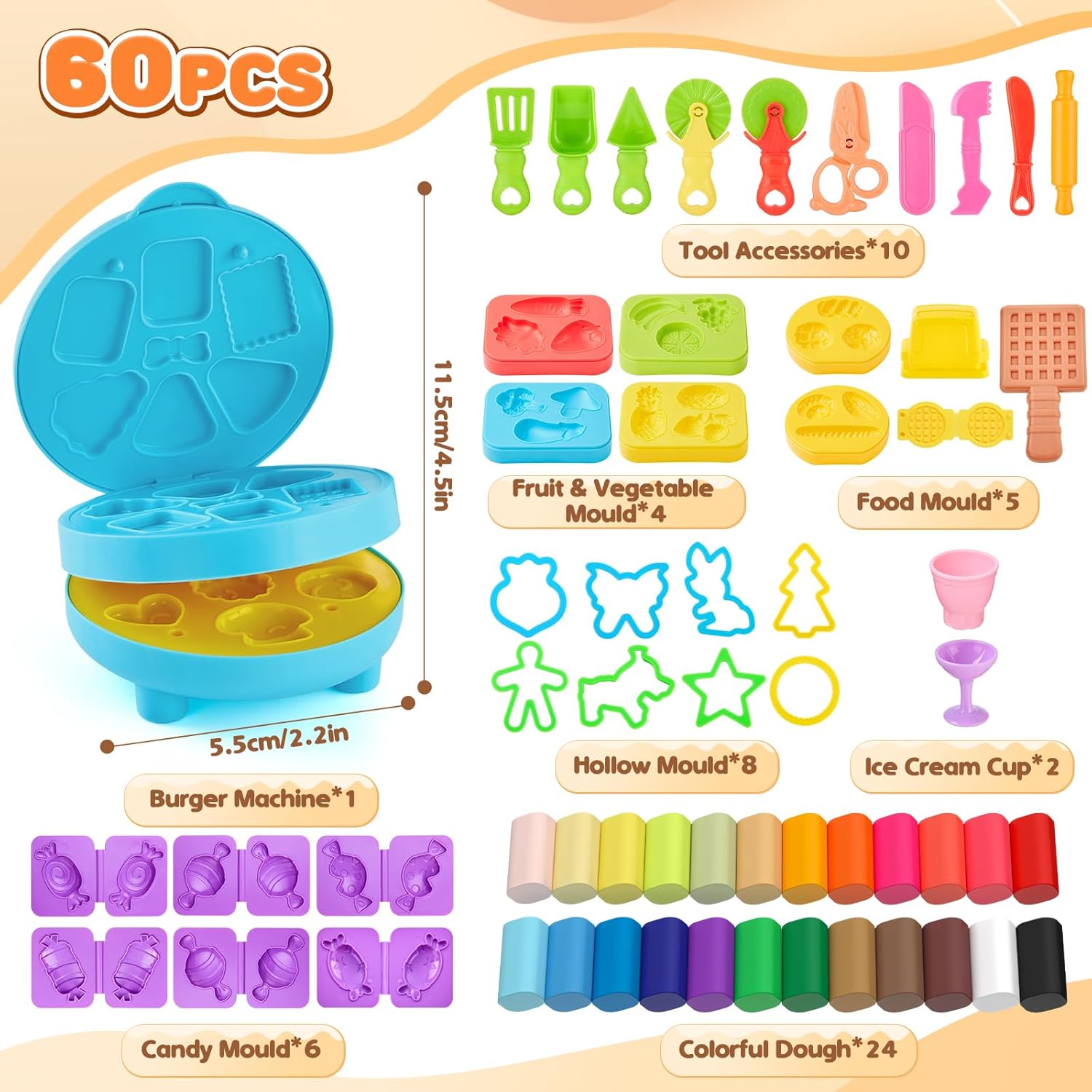 Set di 60 pezzi di plastilina: questo set completo di impasti contiene 36 stampi e strumenti, tra cui una pressa per hamburger a tre livelli, diverse forme alimentari, forme cave, stampi per caramelle, mattarelli, formine per biscotti e altri accessori per impastare. In combinazione con 24 pezzi colorati di plastilina, questo set completo consente ai bambini di creare liberamente il proprio mondo culinario. Materiali sicuri e durevoli: tutti gli strumenti e gli accessori sono realizzati in plastica ABS di alta qualità e hanno bordi lisci e arrotondati per una presa confortevole. La pasta da modellare è realizzata con farina di grano naturale ed è facile da modellare senza attaccarsi alle mani. I bambini possono mescolare diversi colori e creare nuove tonalità utilizzando la tabella dei colori. Stimola la creatività: le molteplici possibilità di gioco liberano la fantasia illimitata dei bambini e consentono ai più piccoli di creare liberamente le proprie forme. Questo favorisce le capacità motorie, la pazienza e l'osservazione e allo stesso tempo allena il riconoscimento del colore. I genitori possono partecipare a momenti di artigianato congiunti che promuovono lo sviluppo libero e aiutano i bambini a un'infanzia colorata e allegra. Gioco versatile: gli strumenti di modellazione colorati e le varie forme consentono di creare facilmente qualsiasi forma. Include utensili da taglio, modellatura e rotolamento della dimensione perfetta per le mani piccole. I bambini possono giocare con gli amici come cuochi junior, progettare le proprie attrezzature da cucina e dare libero sfogo alla loro creatività illimitata a casa o a scuola. Il regalo perfetto: questo set di giocattoli fai da te in pasta modellabile ti farà piacere giocando comodamente. Questo regalo divertente e allo stesso tempo educativo è ideale per bambini a partire dai 3 anni ed è ideale per compleanni, festa dei bambini, Natale, Halloween o altre feste.