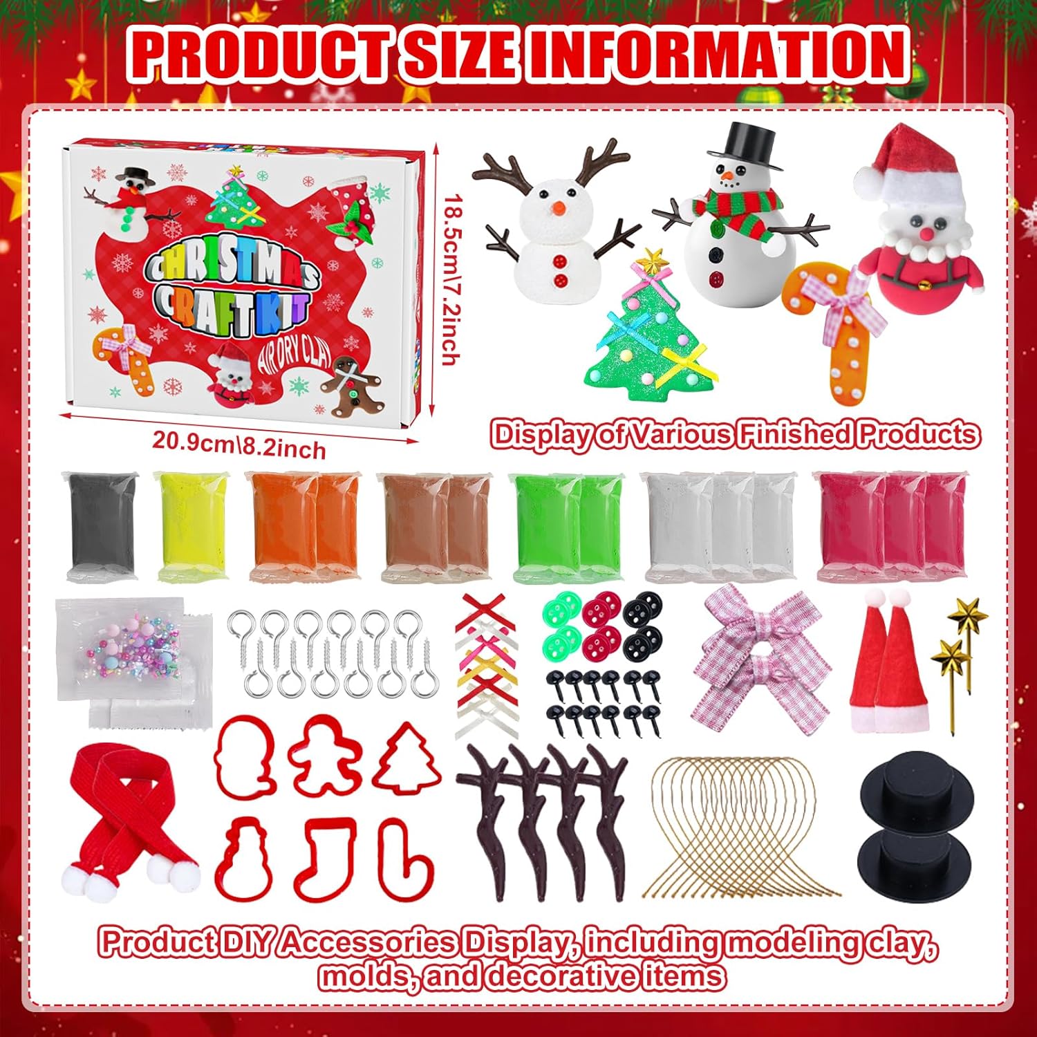 Kit fai da te natalizio per bambini: il nostro set di pasta modellabile natalizio contiene tutto ciò di cui hai bisogno, tra cui 14 confezioni di pasta modellabile (rosso, bianco, giallo, verde, arancione, marrone, nero), 6 forme natalizie, 12 corde per appendere e 2 confezioni di accessori decorativi. Questo set ben attrezzato e ben progettato è facile da usare per chiunque. Kit fai da te per bambini: questo set di pasta modellabile fai da te risveglia la creatività senza limiti e offre un'esperienza sensoriale colorata ed emozionante. Grazie a questa pratica attività, i bambini migliorano la coordinazione occhio-mano e la loro espressione artistica divertendosi. Facile da usare: la morbida pasta modellabile ad asciugatura all'aria è facile da lavorare e perfetta per le mani piccole. Crea le tue decorazioni natalizie personalizzate con la pasta modellabile, decorale con gli accessori in dotazione e decora il tuo albero di Natale. L'argilla da modellare si asciuga completamente all'aria entro 24 ore, permettendoti di godere delle tue creazioni per molti anni. Kit fai da te per pupazzo di neve, perfetto per occasioni come feste di Natale, lezioni, progetti di classe, feste invernali o feste di famiglia. Condividi la gioia del fai da te e della decorazione con i tuoi cari e rendi questo Natale un momento indimenticabile, pieno di divertimento e creatività. Regalo squisito: il nostro set di pupazzo di neve in pasta modellabile è un regalo fai da te educativo e divertente. Questo set splendidamente confezionato è il regalo perfetto per compleanno, Natale o piccolo regalo per bambini dai 3 anni in su. Serve sia come giocattolo creativo che come decorazione festiva, con il pezzo finito ideale da posizionare su un tavolo!