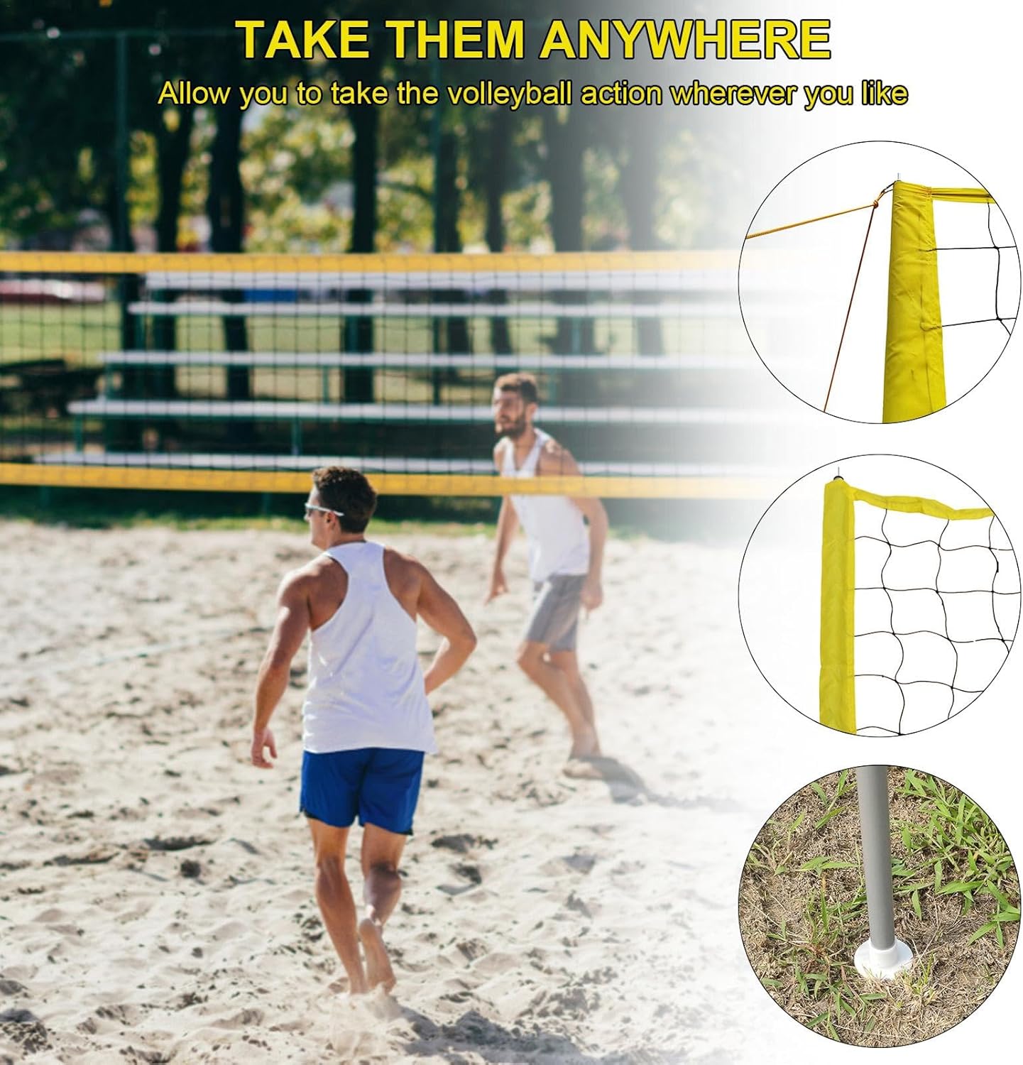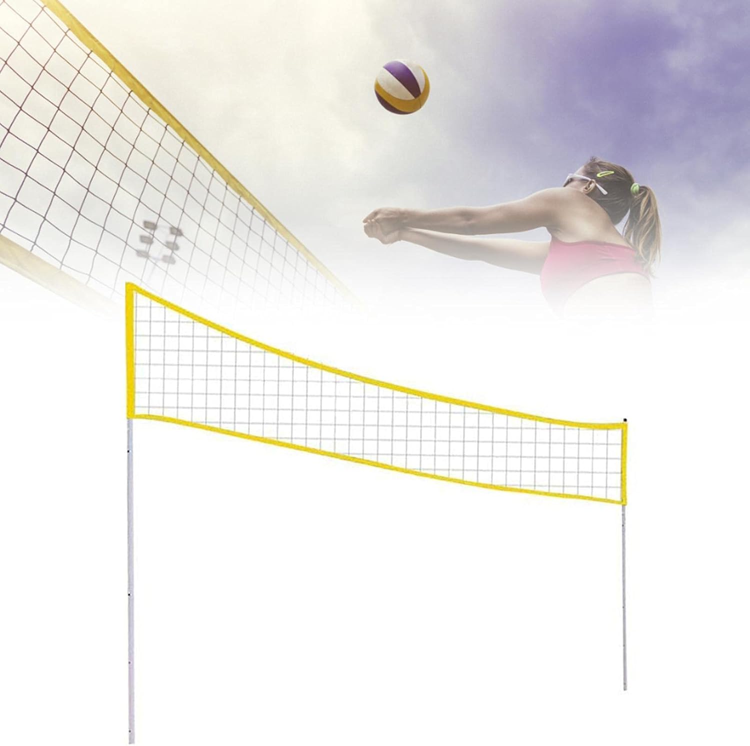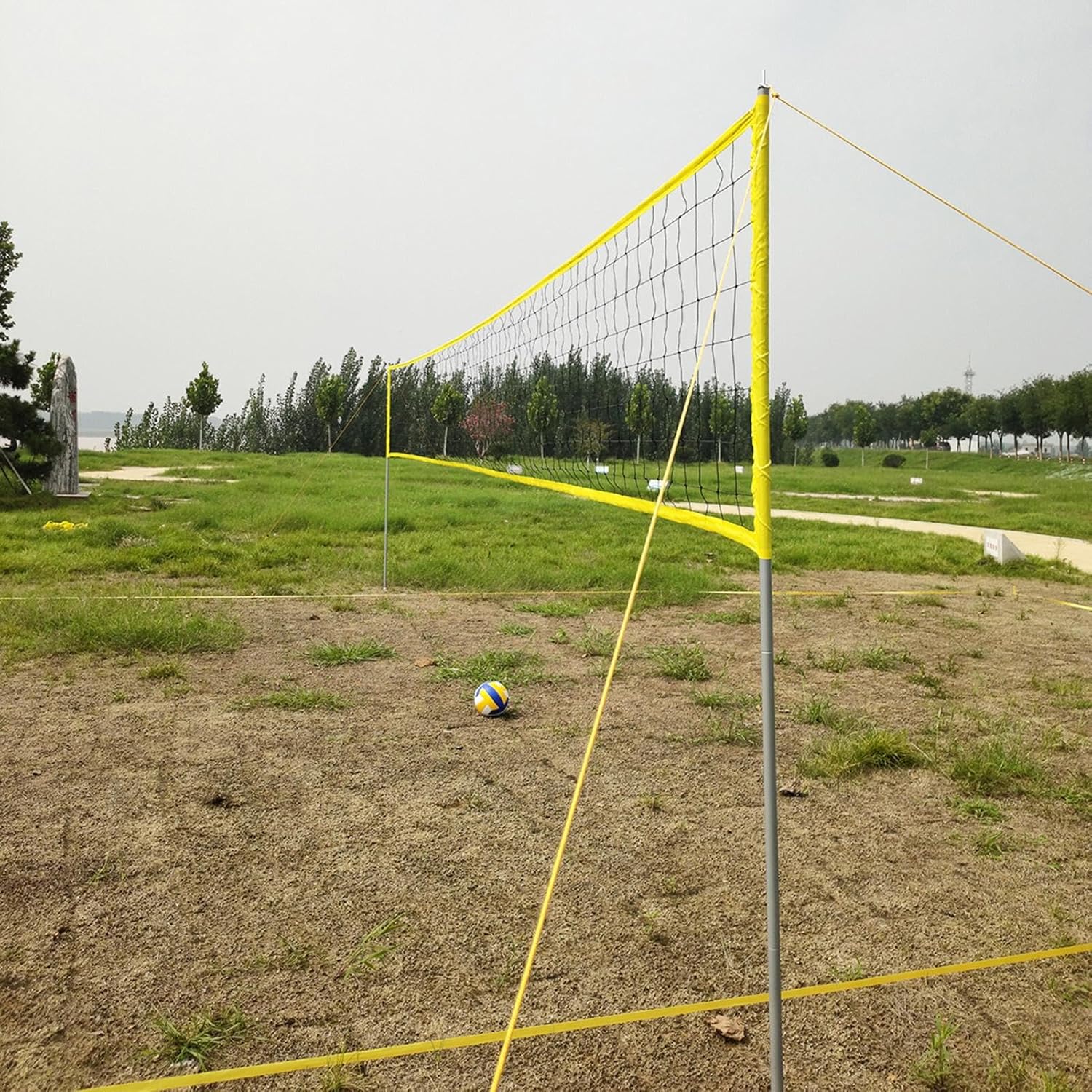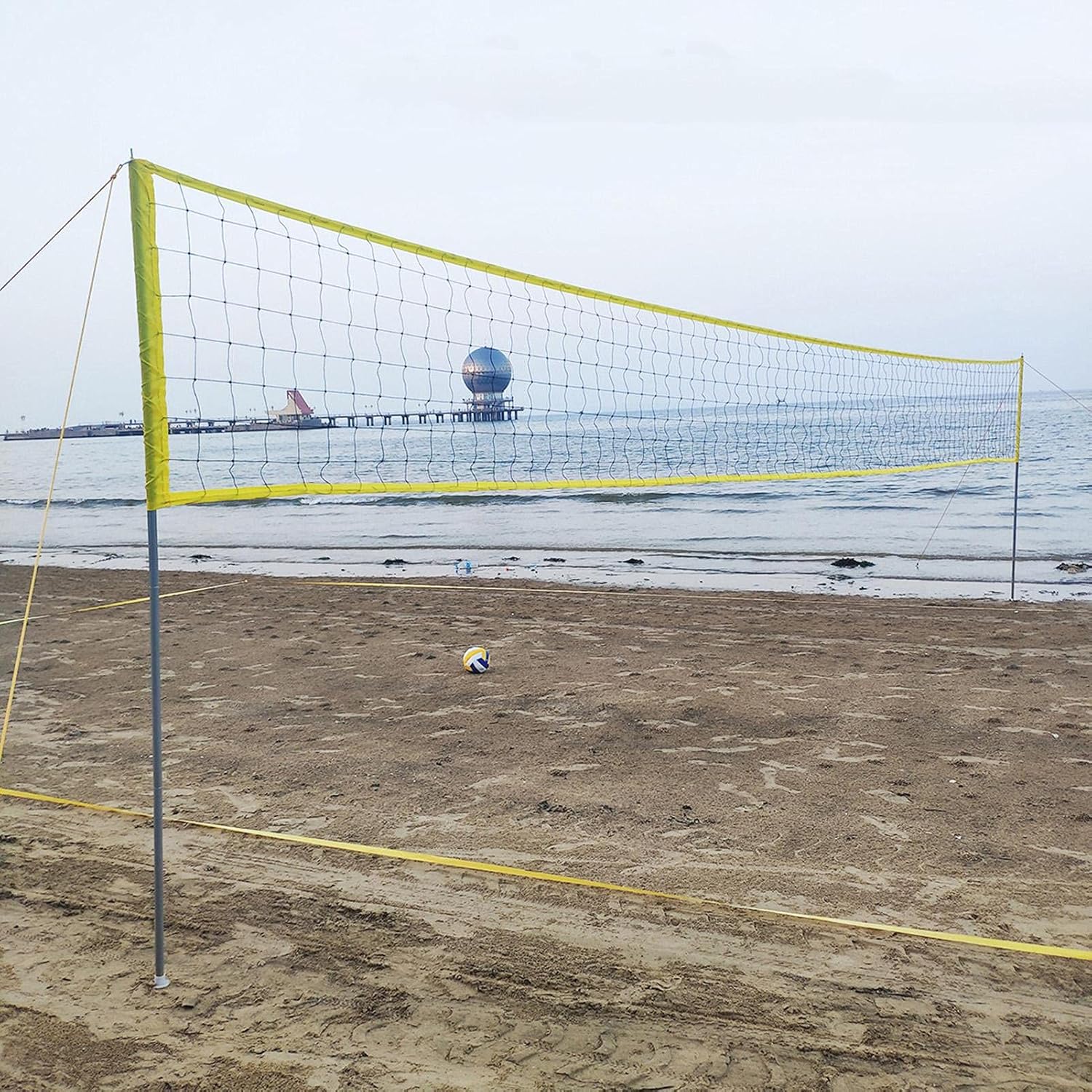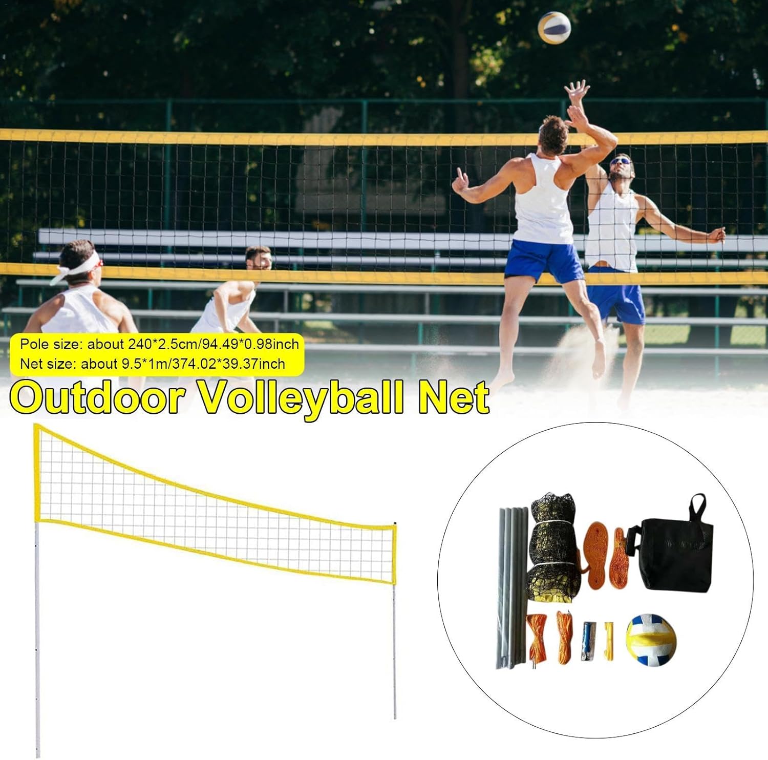 Set di reti da pallavolo da spiaggia: il set da pallavolo da spiaggia viene fornito con una rete da pallavolo lunga circa 31 piedi x 3,2 piedi di larghezza. Il set ha anche una treccia di linea di demarcazione professionale, che consente di segnare una dimensione reale di 52 piedi x 26 piedi ovunque. Linea di demarcazione (52 ft x 26 ft) e kit di ancoraggio a sabbia per garantire un'eccellente stabilità sulla spiaggia. Rete professionale: questa rete è lunga circa 31 piedi ed è realizzata in fibra di poliestere di alta qualità. È e robusto e può essere utilizzato per molti anni. È rinforzato con nastro in vinile impermeabile giallo per aiutare a mantenere la rete stabile e ridurre al minimo il cedimento. Facile da usare: imposta il tuo terreno con una striscia di delimitazione di 1,5 pollici di diametro per migliorare la visibilità. Le linee guida con 4 picchetti in metallo possono garantire la stabilità della rete nei giochi difficili. Questo set di reti da pallavolo professionale e portatile è perfetto per tutte le attività all'aria aperta, come riunioni di famiglia, giardino, spiaggia, parco, campeggio e altro ancora. Facile da trasportare: questo set è leggero e facile da montare e viene fornito con una robusta borsa da trasporto per un facile trasporto, permettendoti di giocare a pallavolo in qualsiasi momento e in qualsiasi luogo. Set completo: 2 x 3 pali in alluminio, 1 x rete da pallavolo in poliestere, 1 x pallavolo di alta qualità, 1 x pompa, 2 x linee guida con 4 picchetti metallici, 1 x striscia di delimitazione 1 x borsa per il trasporto. Facile da riporre e trasportare.