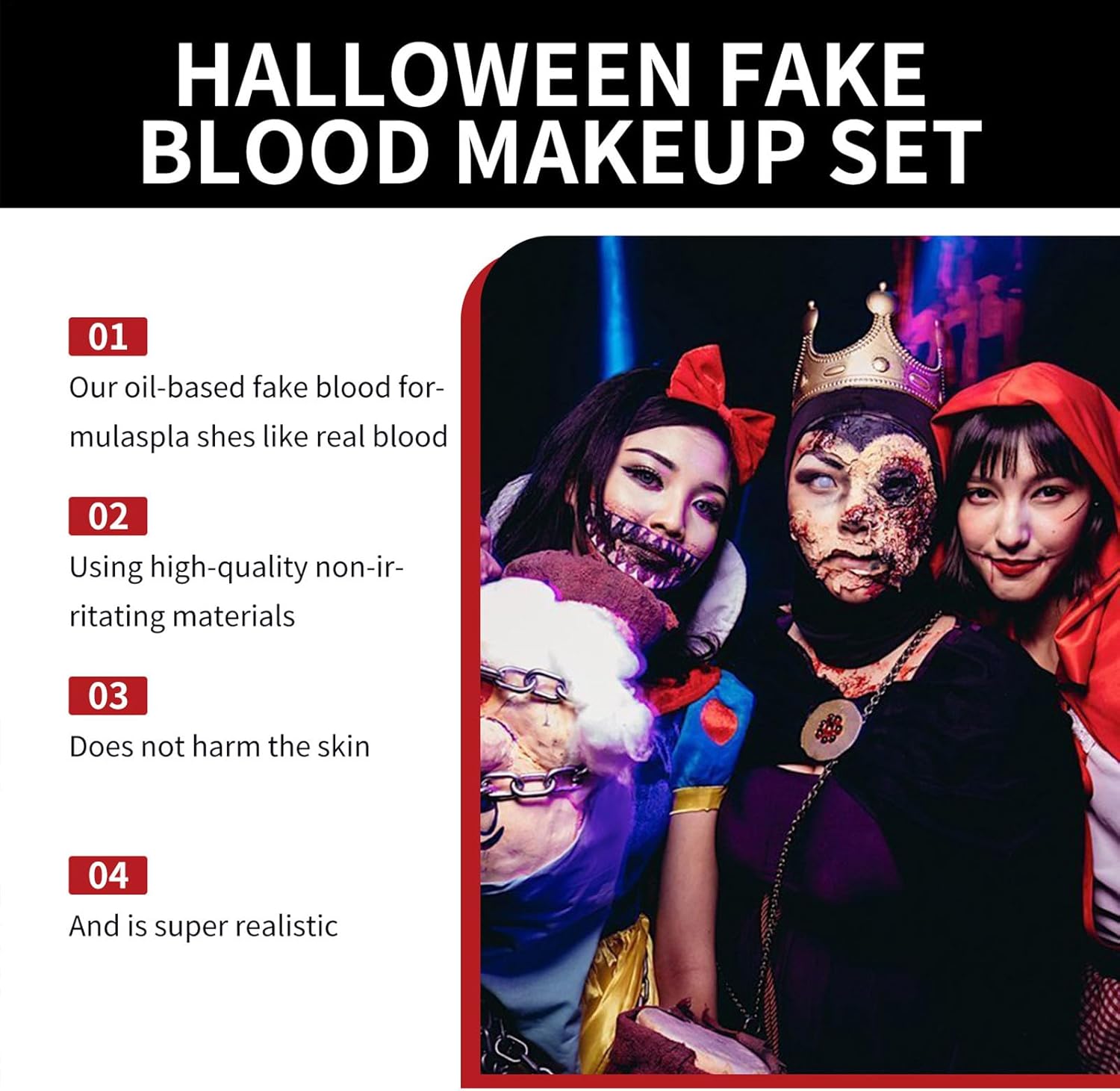 Assicurati di un utilizzo sicuro: con proprietà adatte alla pelle, questo falso prodotto di sangue utilizza un ingrediente innocuo per assicurarsi che il comfort degli utenti, rendendolo ideale per raggiungere un aspetto convincente in modo sicuro, limitato agli adulti Effetti del sangue realistici: vivide caratteristiche del sangue falso caratteristiche realistiche, fluide e coagulate, con effetti schizzi per scene creative e drammatiche Ampio ambito di applicazione: creare vividi dettagli sanguinanti per abiti da zombi e temi inquietanti, adatti per divertimento di Halloween o scherzi a con miscelazione senza soluzione di continuità e risultati audaci Rimozione delle macchie senza sforzo: ottenere un'efficace rimozione delle macchie mentre risciacqua con acqua calda, applicando il rimozione del trucco per eliminare il sangue falso in modo sicuro e tenendolo lontano dagli occhi Formula per la pelle: questa formula delicata non garantisce disagio, si adatta a tutti i tipi di pelle e migliora la protezione della pelle senza compromettere la sicurezza o l'usabilità