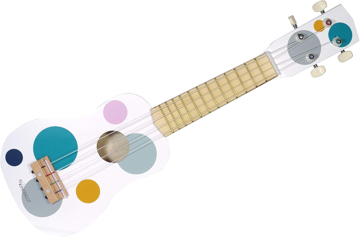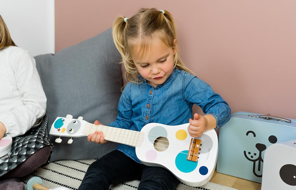 Set di strumenti musicali in legno Contiene una chitarra per bambini a quattro corde, due sonagli e un tamburello con campanelli Sviluppa giocosamente il piacere della musica Materiali adatti ai bambini Splendidamente confezionato nel design Kindsgut