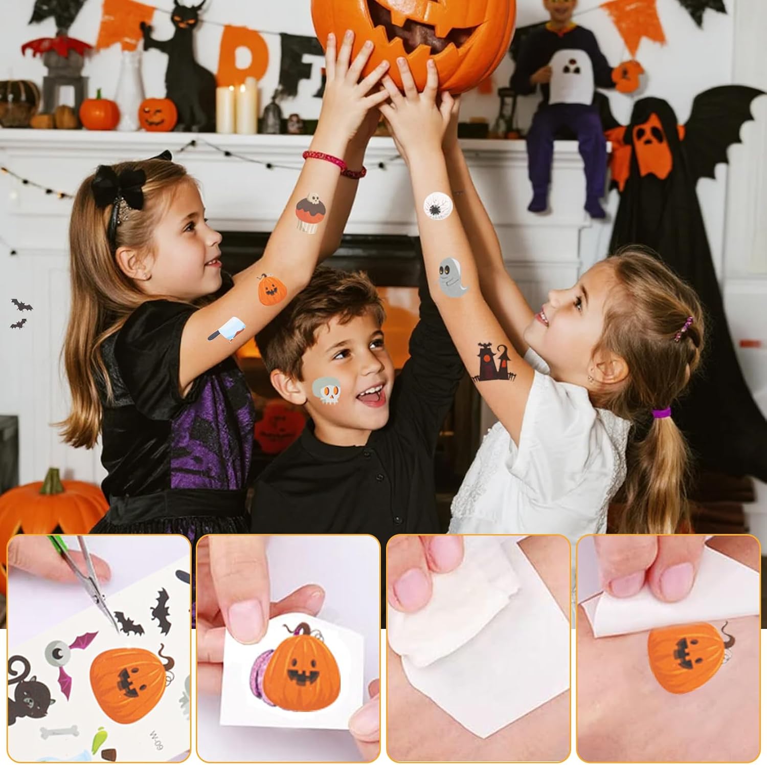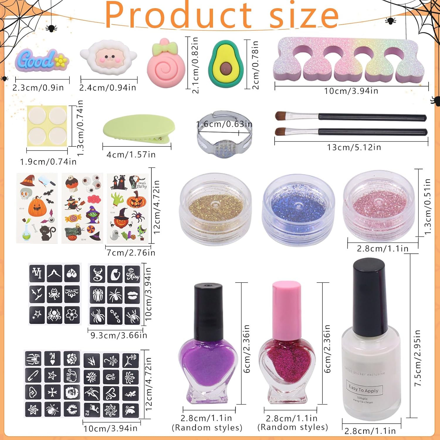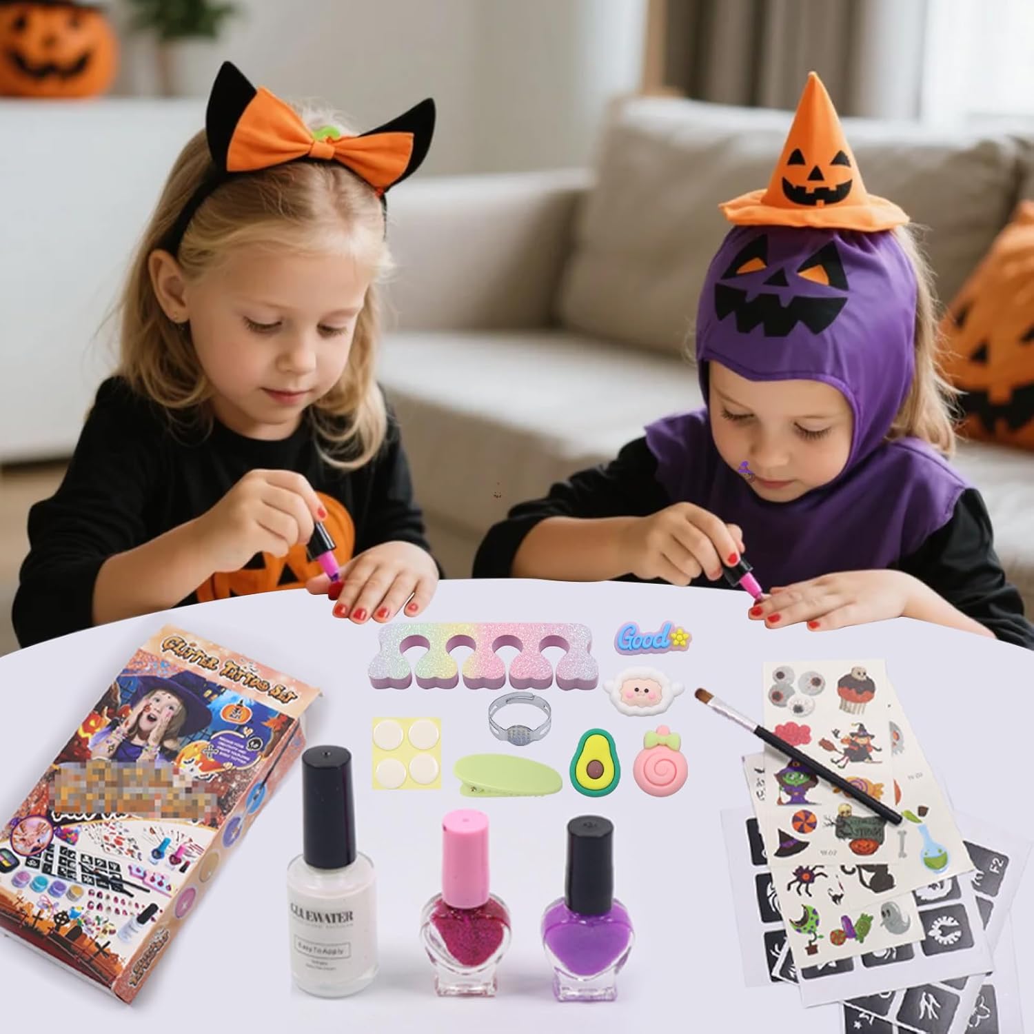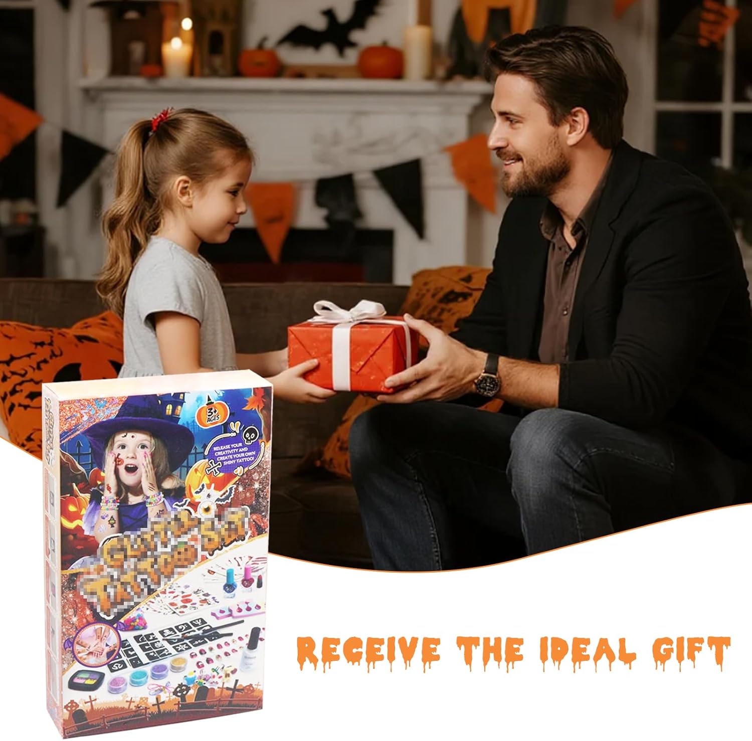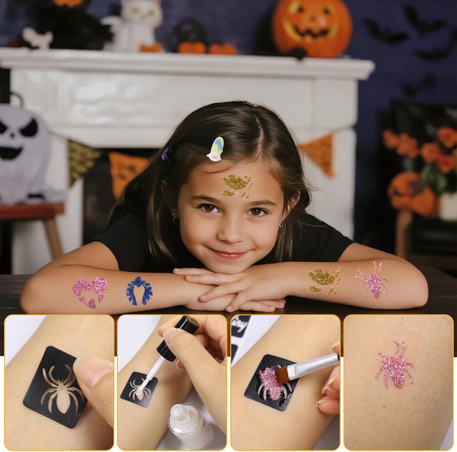 Set di tatuaggi glitterati per bambini: questo set di tatuaggi glitter include 3 adesivi per tatuaggi, 4 stencil per tatuaggi, 3 glitter, 2 bottiglie di smalto, 1 pennello di alta qualità, 1 bottiglia di colla, 1 fermaglio per capelli, un anello e un separatore per dita per nail art. È un regalo ideale per donne e ragazze che amano la creatività e l'arte. Tatuaggi per bambini: questo adesivo glitterato per tatuaggi di Halloween renderà il tuo look di Halloween ancora più speciale. Il design del tatuaggio mette in risalto il tuo stile e la tua personalità ineguagliabili. Set di tatuaggi glitterati per bambini: scegli prima il tuo stencil preferito e incollalo sul punto che vuoi tatuare. Quindi applicare la colla speciale fornita da noi. Attendere che la colla diventi chiara, quindi rimuovere delicatamente lo stencil e applicare la polvere glitterata di tua scelta con un pennello grande per completare il tuo esclusivo tatuaggio glitterato. Il tatuaggio è impermeabile e dura tra 3 – 7 giorni. Si rimuove facilmente con acqua calda. Set di tatuaggi glitterati per Halloween: questo set di tatuaggi glitterati non è solo splendidamente decorato e completo di accessori, ma offre anche un'esperienza unica che lo rende un regalo perfetto per i bambini. È adatto per Halloween, carnevale e tutti i tipi di feste, giochi di ruolo, se vuoi divertirti e essere creativo con amici e familiari. Adesivo glitterato per tatuaggi di Halloween: questo materiale adesivo è stato sottoposto a rigorosi test di qualità ed è delicato sulla pelle e adatto a tutti i tipi di pelle. Prima del primo utilizzo, si consiglia un test cutaneo sul dorso della mano per assicurarsi che voi e il vostro bambino possiate tranquillamente utilizzare i nostri prodotti durante il processo creativo.