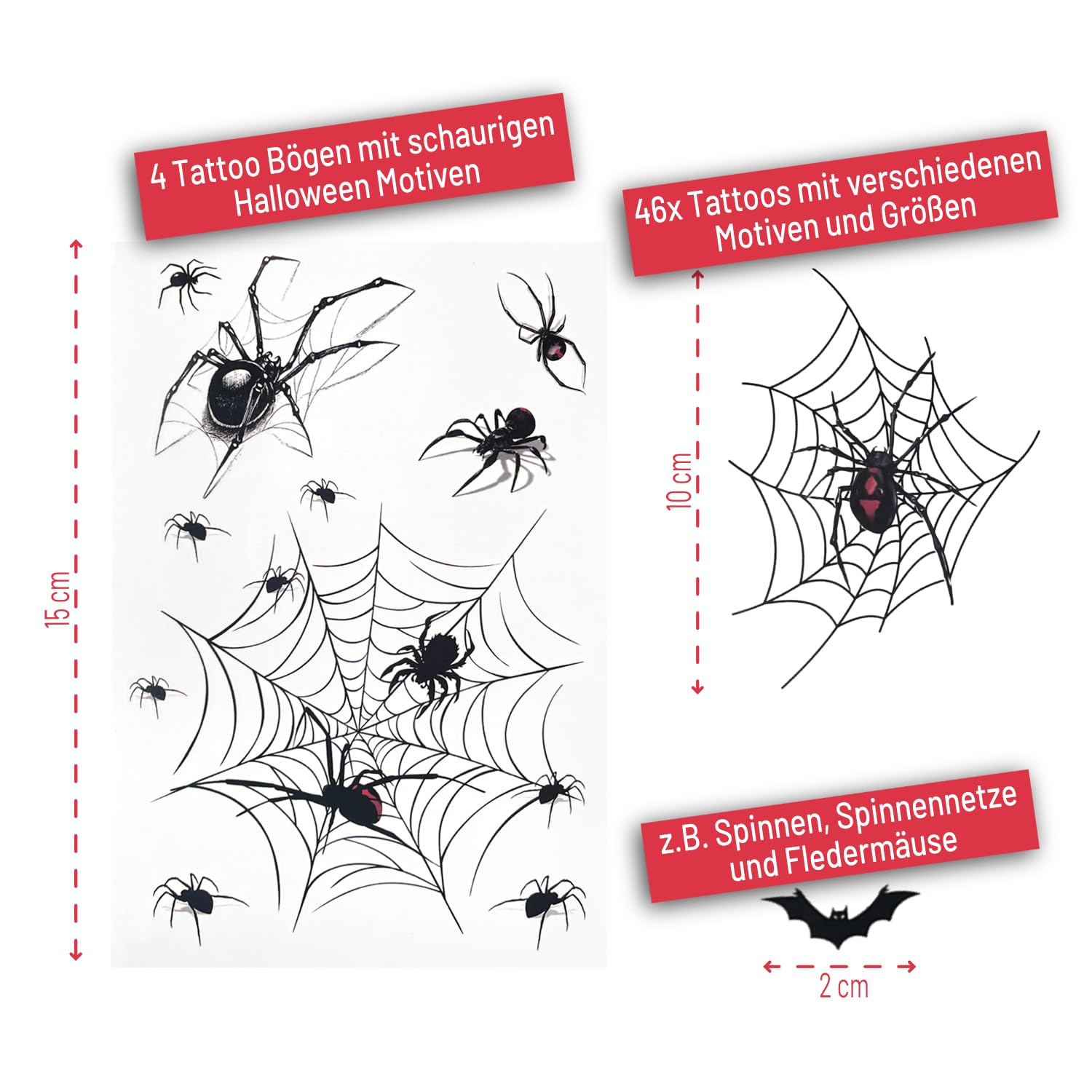 Quantità: include 4 fogli (46 in totale) di tatuaggi temporanei tra cui ragni spaventosi, affascinanti ragnatele e pipistrelli misteriosi - ideali per Halloween, feste horror o progetti di decorazione fai-da-te. Materiale e colore: i tatuaggi in nero elegante con accenti rossi sorprendenti creano un look inquietante ma accattivante che sicuramente attirerà l'attenzione. Materiale: plastica Dimensioni: varie dimensioni da 1 cm a 10 cm offrono flessibilità durante la decorazione o lo styling del costume. Uso versatile: perfetti per Halloween, feste a tema, compleanni per bambini o come decorazione creativa fai-da-te: facili da applicare con acqua e veloci da rimuovere rendono questi tatuaggi ideali per qualsiasi atmosfera spettrale!