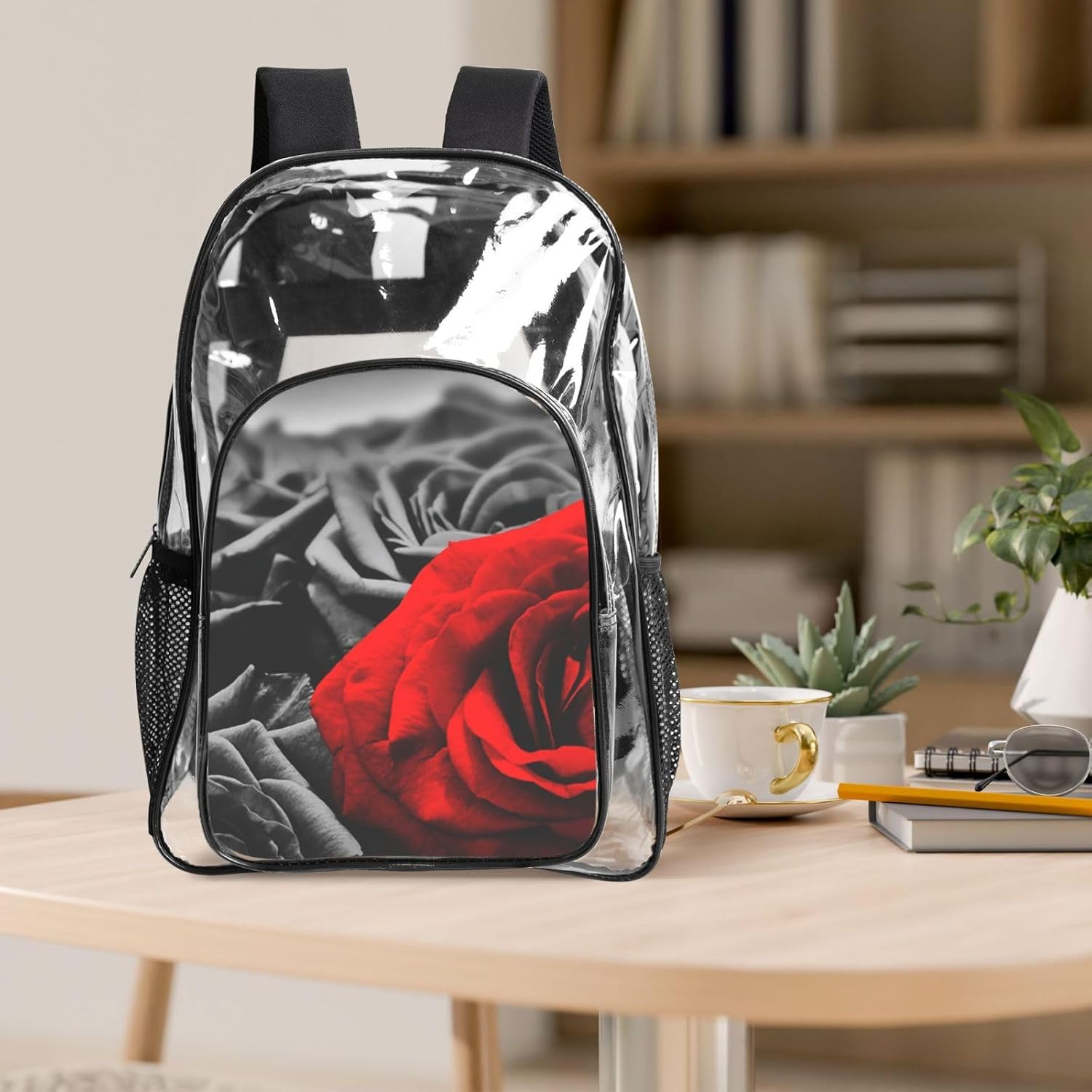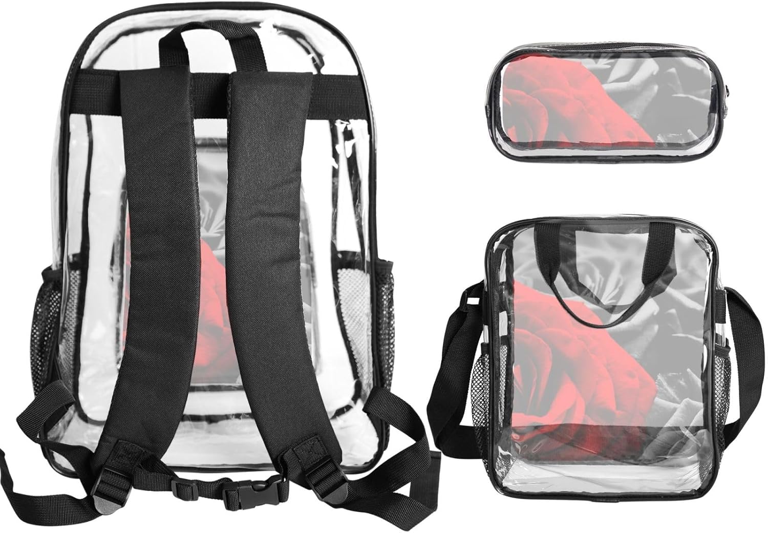 Borsa con stampa di rose nere bianche e rosse + astuccio + borsa per il pranzo Set combinato. Dimensioni: lo zaino è di circa 43 x 31 x 13 cm; la scatola per il pranzo è di circa 26 x 21 x 10 cm; dimensioni dell'astuccio è di circa 22 x 10,5 x 4 cm