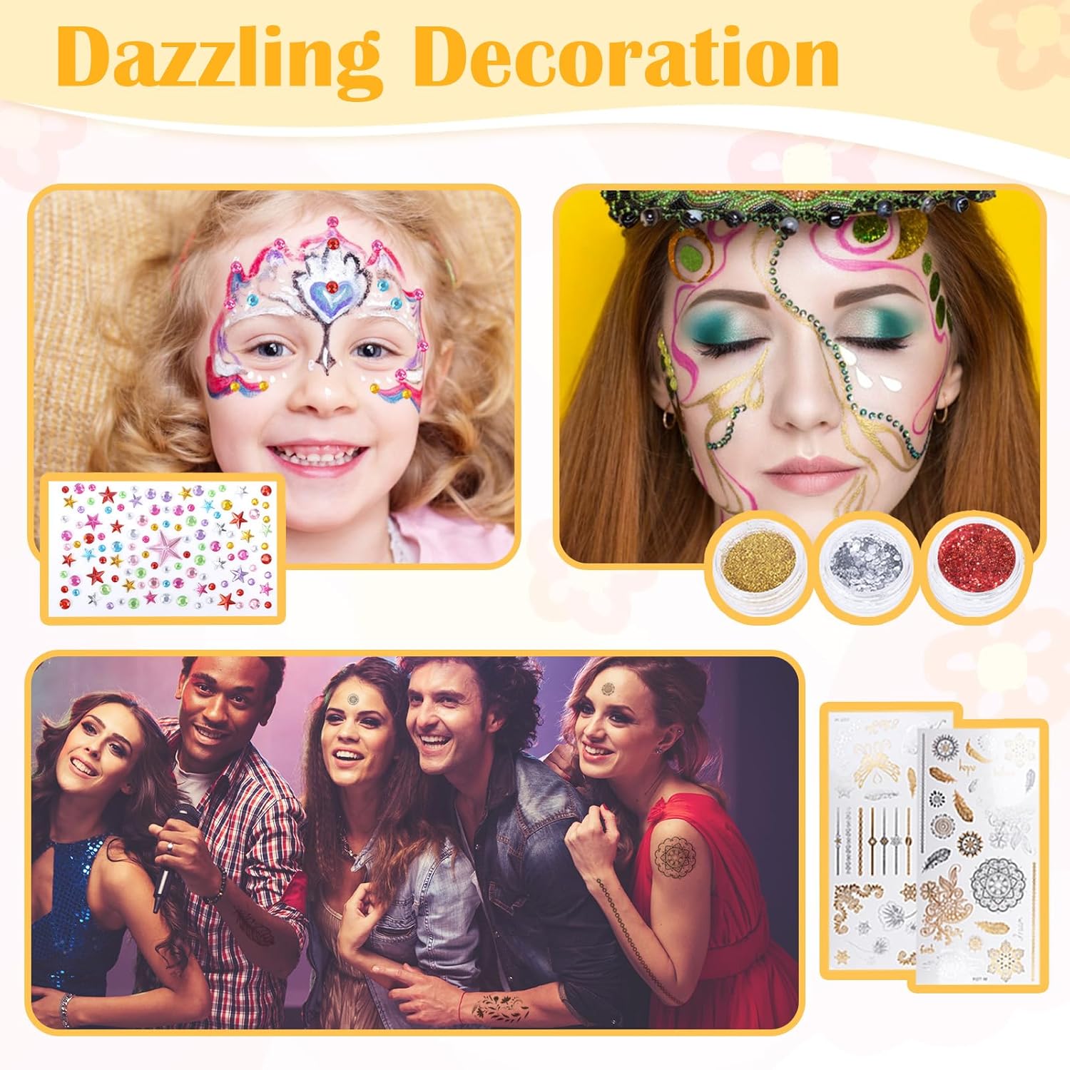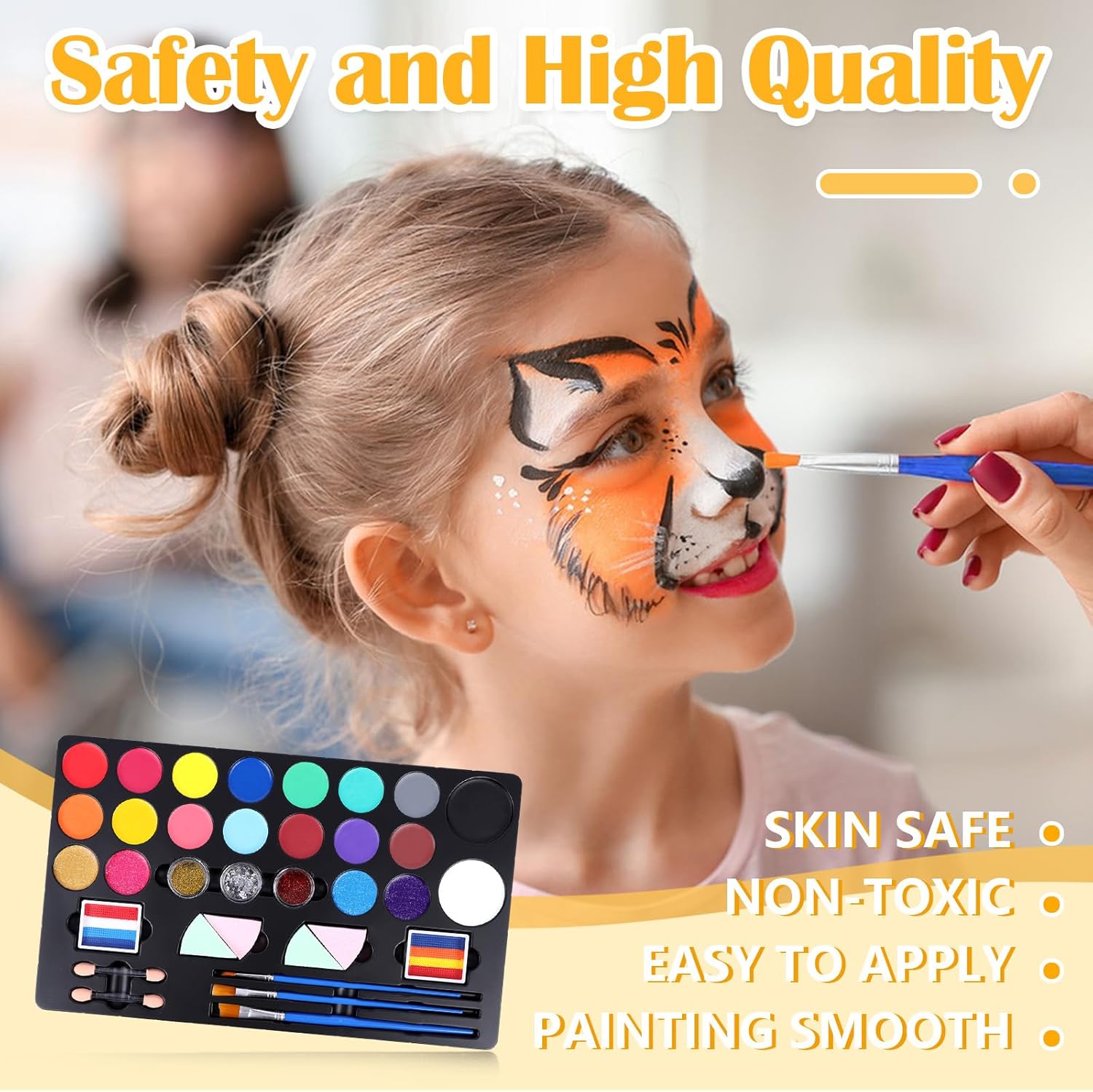 Set lussuoso: il set per il trucco per bambini include 20 colori per il viso, 2 strisce arcobaleno, 3 polveri glitterate, 34 stencil, 2 adesivi con strass, 2 adesivi per tatuaggi, 4 spugne, 2 penne in spugna, 3 pennelli e 1 manuale di istruzioni per la pittura. Che si tratti di trucco quotidiano, trucco per feste, trucco per bambini per un evento Pride o spettacoli sul palcoscenico, il set di colori per il viso copre tutte le vostre esigenze di trucco Sicuro: il nostro trucco per bambini è facile da usare. Il nostro set di trucco per bambini utilizza una formula sicura, di alta qualità, ipoallergenica, solubile in acqua, atossica e delicata. È adatto per bambini e adulti sensibili alla pelle. Poiché ogni pelle è diversa, si consiglia di testare prima il colore del tatuaggio su una piccola area Facile da usare e da pulire: questo prodotto è una vernice bodypainting a base d'acqua. Basta inumidire il pennello o versare un po 'd'acqua sulla vernice necessaria per trasformare la superficie in una pasta. Applicare il colore del tatuaggio sul viso per creare il trucco desiderato. Per la pulizia basta pulire con acqua e sapone o un panno umido Regalo creativo: il set di colori per il viso a 20 colori è colorato e vivace, ben confezionato e dotato di vari strumenti per la pittura. È sicuro e non tossico e popolare in diverse occasioni. È perfetto come regalo di compleanno, regalo di festa o regalo a sorpresa Adatto per diverse occasioni: colore viso di alta qualità per un'intensità di colore di lunga durata, perfetto per trucchi di carnevale, trucco per bambini o trucco per bambini con glitter. Il nostro set di trucchi per bambini ti rende una star in carnevale, Halloween, feste di compleanno, eventi scolastici, Natale, Pasqua, cosplay o trucco teatrale