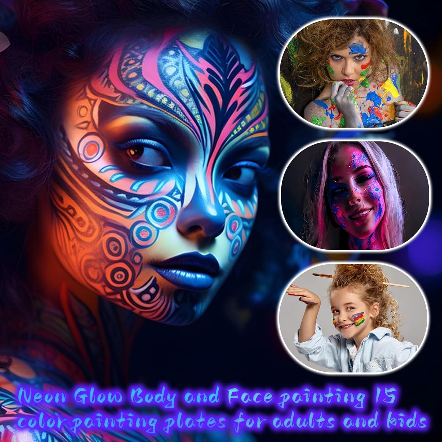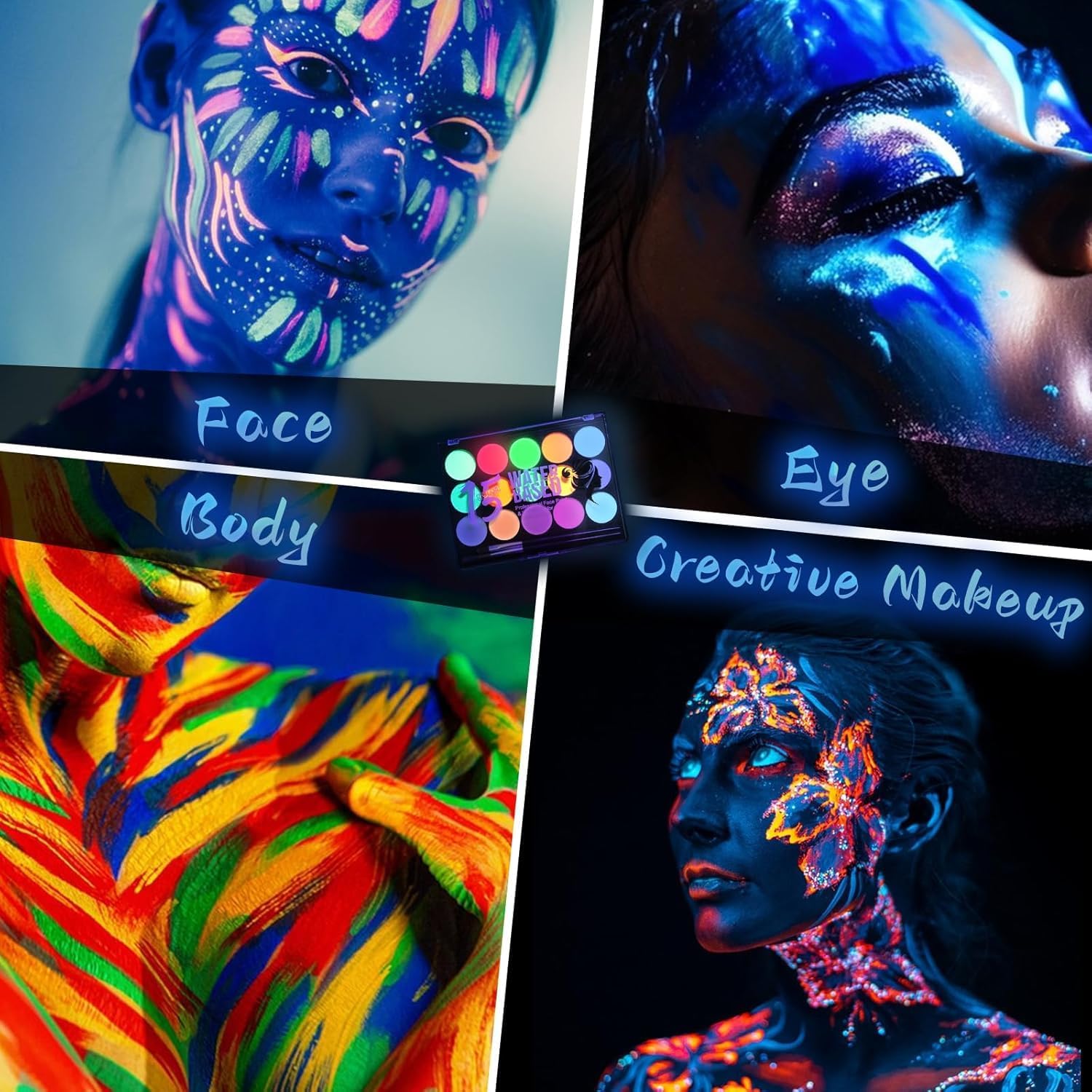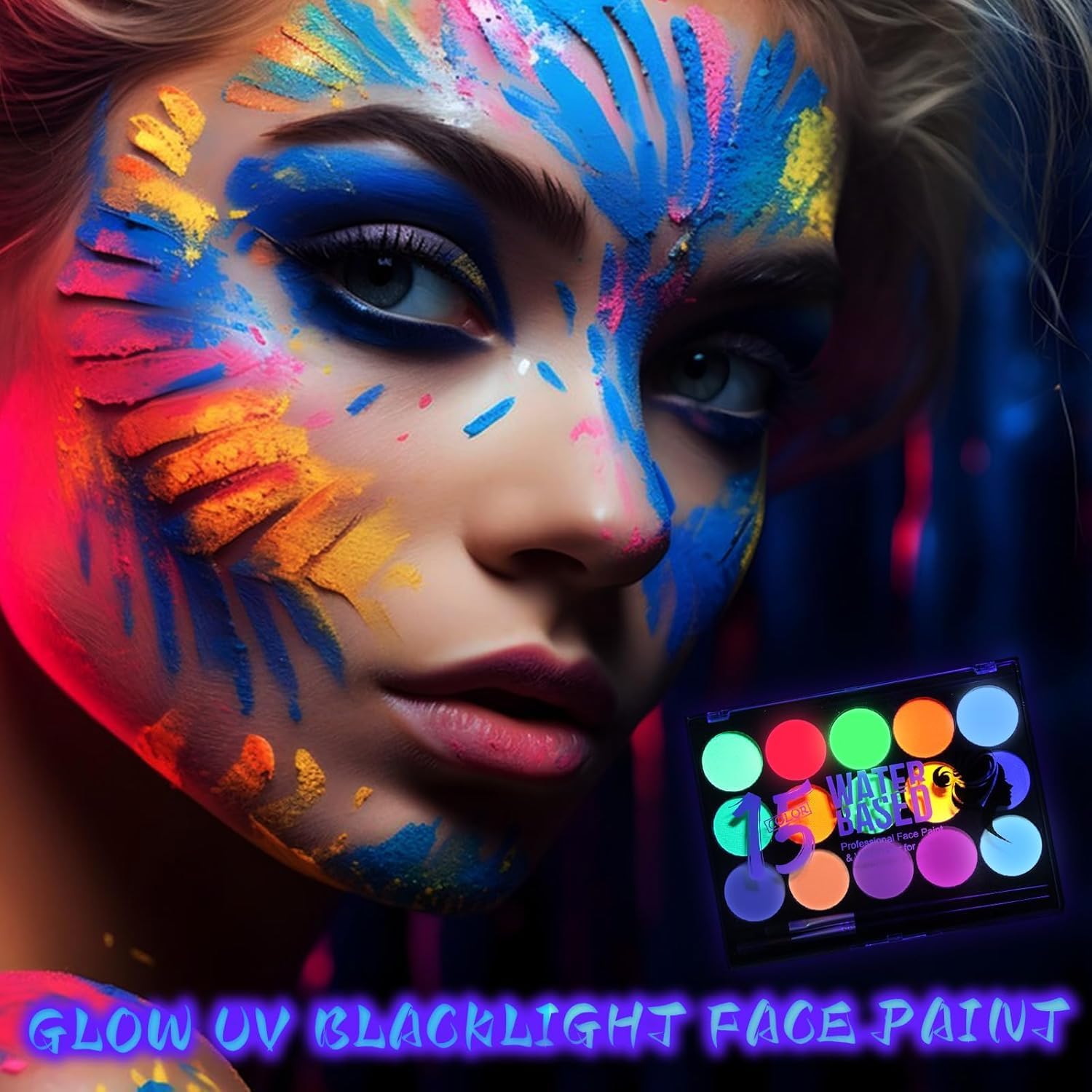 Perfect Face Painting Set: ci sono 15 colori per viso e corpo a base d'acqua, 2 pennelli e 18 diversi stencil. Se mescoli due o più colori diversi, sarai piacevolmente sorpreso di ottenere un nuovo colore. 【Una parola di cautela: le paste oleose non si asciugano rapidamente dopo l'applicazione e possono scolorire sul trucco. Per un'asciugatura rapida, utilizzare una polvere di fissaggio prima di applicare il trucco Glow sotto la luce UV: sotto la luce UV, questi trucchi per bambini vi stupiranno con il loro bagliore glamour. Applica il trucco per bambini sul tuo viso e ti distinguerai sicuramente dalla folla e sarai al centro dell'attenzione. Questo prodotto è vernice idrosolubile. Basta aggiungere acqua per impostare la concentrazione desiderata. Si prega di notare: si illumina sotto la luce UV, non si illumina al buio. SICURO E TOSSICO: questo kit di pittura per il viso è un trucco professionale di altissima qualità cosmetica adatto a qualsiasi bambino o adulto con pelle sensibile. Ipoallergenico, delicato sulla pelle e non provoca prurito o irrita la pelle. Sicuro e delicato per le pelli sensibili. Facile da usare e da pulire: mescolare con acqua prima dell'uso. Aggiungere alcune gocce d'acqua al colore desiderato per rendere la superficie pastosa e applicare uniformemente sulla superficie della pelle con un pennello. Asciugatura rapida e facile da rimuovere con acqua calda e sapone o salviette. Uso versatile: utilizzato per feste a tema divertenti, feste in costume, performance di bodypainting, lezioni di pittura per make-up per balli in costume, spettacoli artistici, feste di matrimonio, feste di compleanno, pittura di festival, ecc.