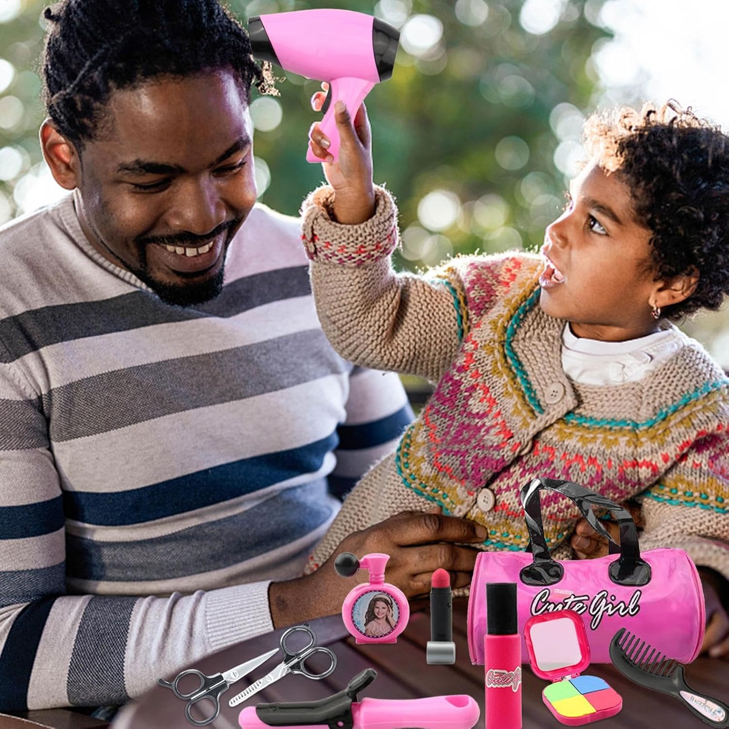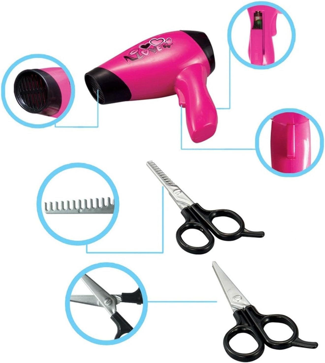 Facilità d'uso: delizia la tua piccola diva con un gioco fantasioso con il nostro kit di trucco fantasy. Dispone di un asciugacapelli, vari stili di ferri arricciacapelli, 2 paia di forbici, uno specchio e un contenitore per una facile pulizia; funziona facilmente con il pettine incluso. Design a batteria: ottieni il set di trucco realistico che include tutti gli strumenti necessari per le ragazze per svolgere il ruolo di una principessa. L'asciugacapelli a batteria richiede due batterie AA da 1,5 V non incluse, perfetto per giochi fantasiosi che attirano il pubblico di destinazione. SERVIZIO DUREVOLE Il tuo bambino può avere più tempo di gioco con il nostro set di trucco finto, realizzato in materiale ABS per una durata e un uso sicuro. Questo set di lunga durata è un must per qualsiasi aspirante truccatore. Affina le abilità motorie fini: questo finto set di trucco, che immerge i bambini in un divertente gioco di ruolo creativo, insegna loro le basi del parrucchiere e allo stesso tempo promuove il miglioramento delle capacità motorie. Guarda come vola lo sviluppo di tuo figlio. Regalo delicato: scatena il lato creativo dei tuoi bambini con questo set di trucco fantasy. Un regalo perfetto per ragazze dai 3 anni in su, ideale per compleanni, vacanze o eventi in classe, questo set porta più divertimento e immaginazione.