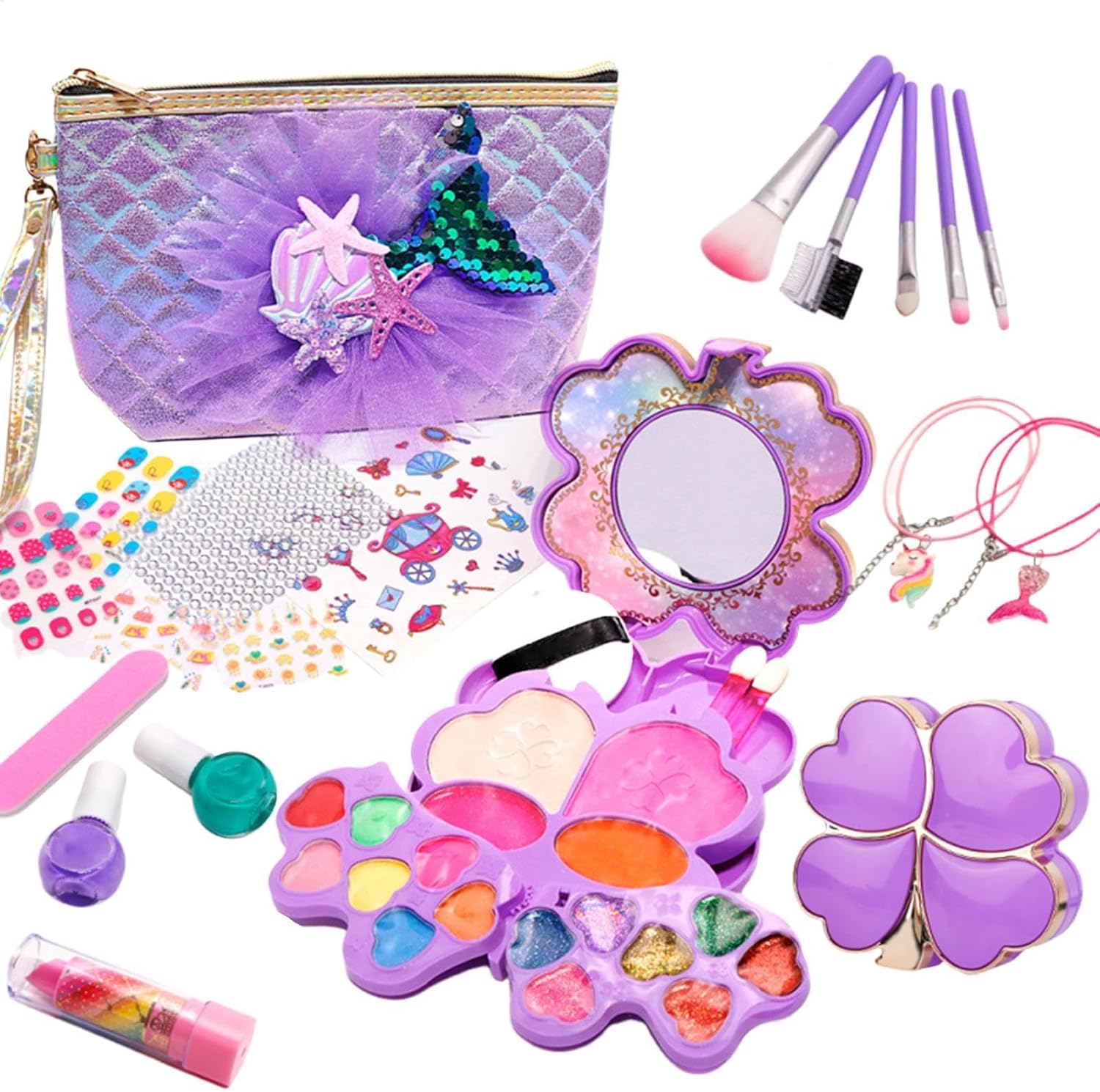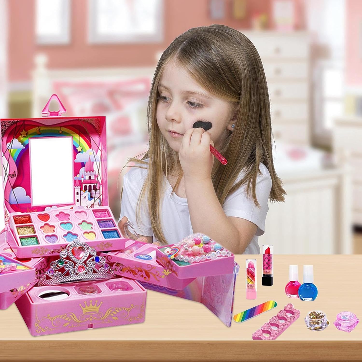 Giocattoli pittoreschi per bambini: con questo set di trucco, i tuoi bambini si divertiranno più a giocare con il set di trucchi, set di strumenti e accessori per unghie, fornendo ore di gioco di gioco fantasioso Sicuro e sicuro: realizzato con materiali solubili in acqua che sono sicuri, morbidi e adatti alla pelle, questo kit di trucco per le ragazze può essere facilmente lavato con acqua e sapone, garantendo un gioco sicuro Conveniente e portatile: la tua bambina può mantenere i suoi accessori per il trucco in ordine con questo kit di trucco finta. Con una maniglia e più scomparti, questo kit compatto e portatile semplifica la presa all'aria aperta, perfetta per gite in auto o vacanze. E dopo l'uso, può facilmente conservarlo, mantenendolo ordinato e organizzato Educativo e intellettuale: ogni tonalità di trucco e smalto in questo kit apre più possibilità. Incoraggiando la creatività, questo set consente ai bambini di sperimentare un aspetto diverso ed esprimersi attraverso il trucco, raddoppiando anche come un divertente arte e attività artigianale Bellissimo regalo: lascia che questo bambino fa finta il kit di trucco sia il modo per esprimere il tuo amore e la tua cura con il suo design unico e il suo aspetto adorabile, rendendolo un regalo ideale per la tua famiglia e i tuoi amici