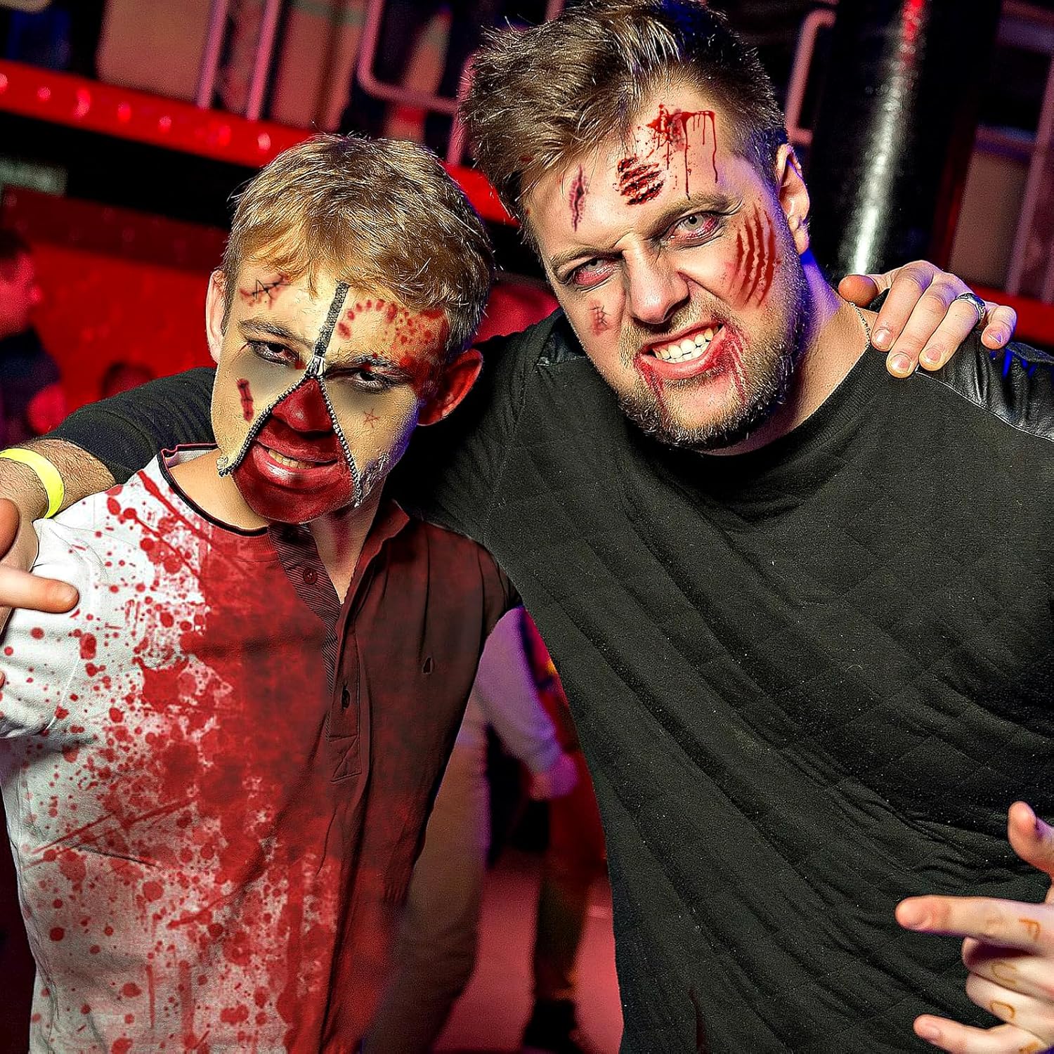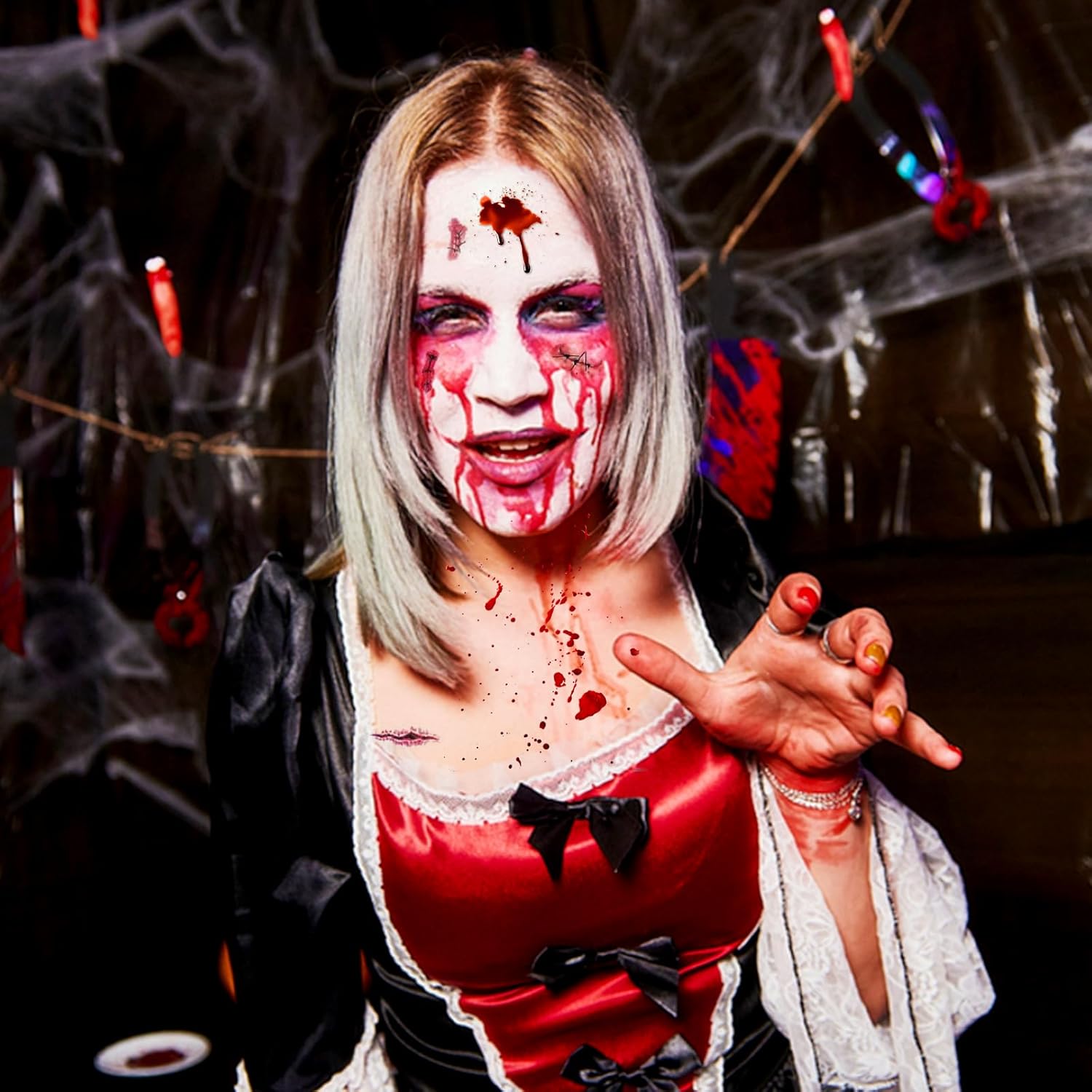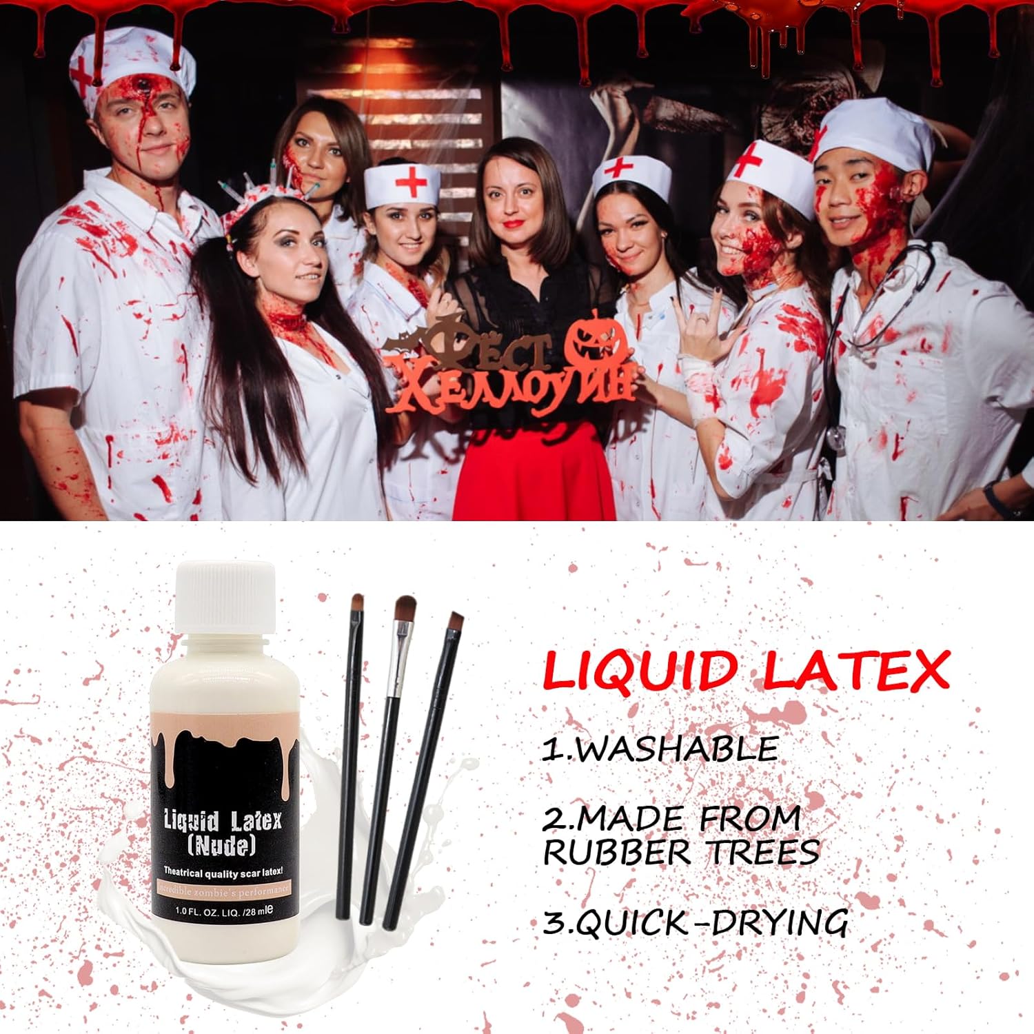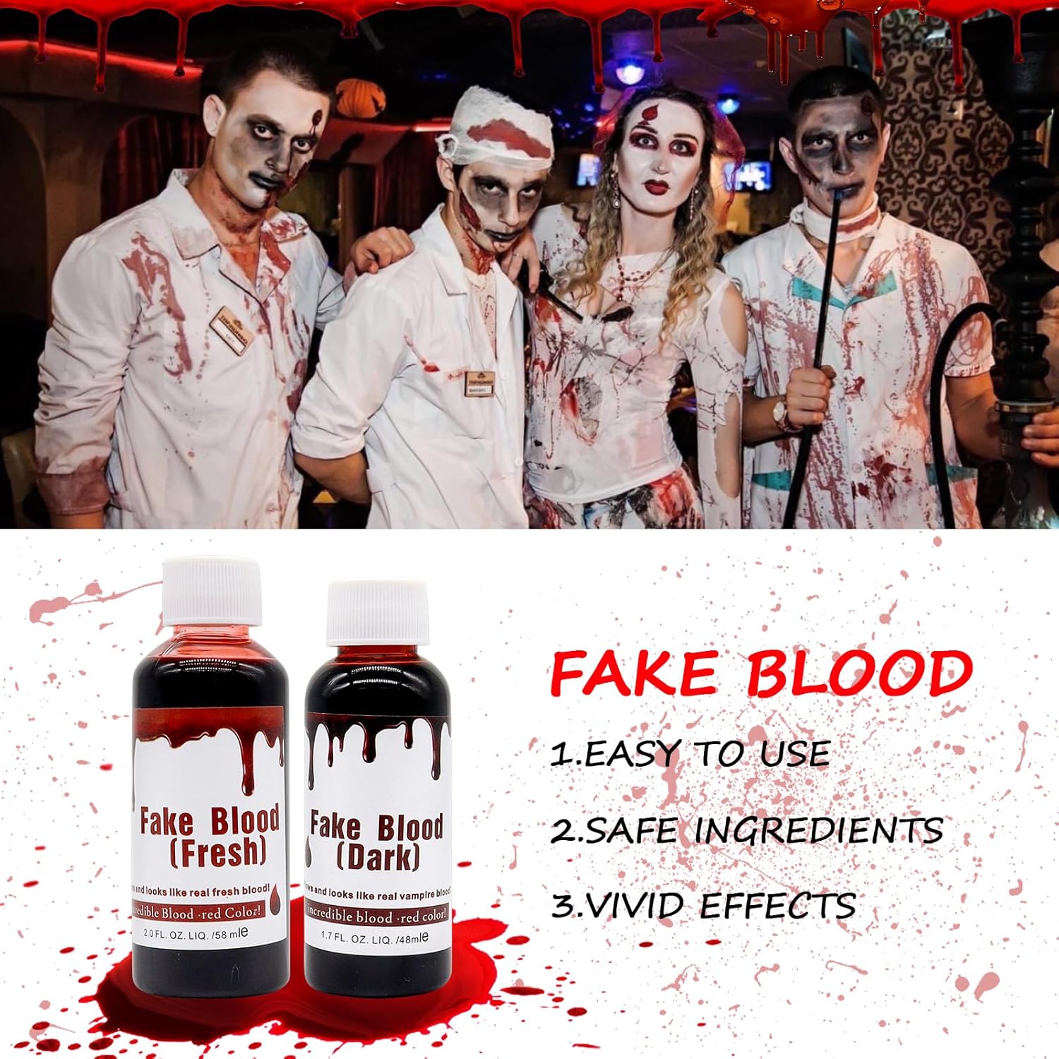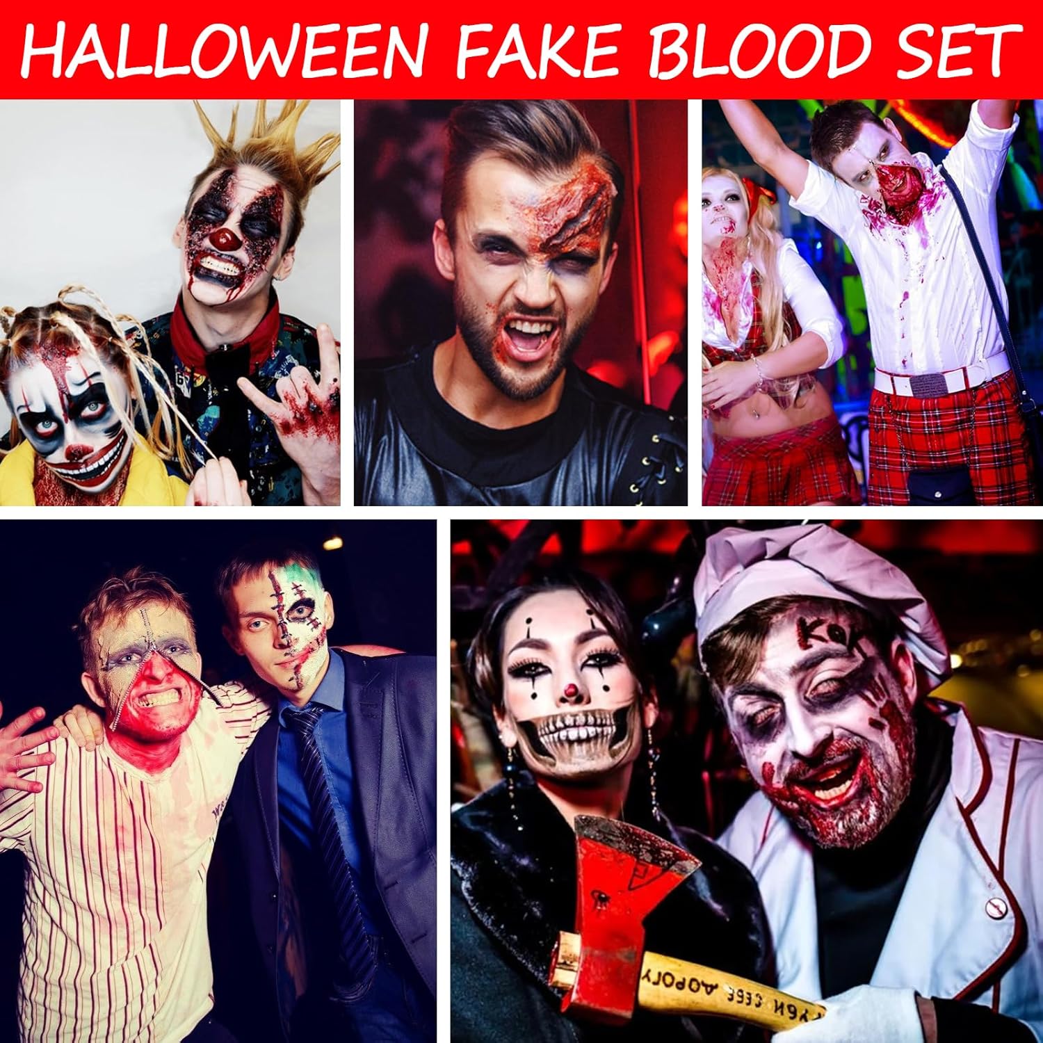 Set di sangue finto di Halloween: questo set include 1 flacone di sangue finto da 58 ml, 1 flacone di sangue finto rosso scuro da 48 ml, 1 tubo di lattice liquido da 28 ml, 3 pennelli per il trucco, 2 spugne e 20 tatuaggi di Halloween. Il colore e gli effetti del sangue finto sono molto realistici e si applicano facilmente alla pelle e ai tessuti. Qualità e sicurezza premium: il kit per il trucco di Halloween con sangue finto è realizzato con ingredienti di alta qualità, garantendo la loro sicurezza per la pelle. Il lattice è realizzato con materie prime rispettose dell'ambiente, è delicato sulla pelle, non irritante e non tossico e consente l'applicazione diretta sulla pelle. Così potrai goderti appieno il divertimento del trucco di Halloween senza preoccuparti degli effetti indesiderati. Effetti terrificanti e realistici: il nostro sangue finto per il trucco di Halloween ha un aspetto estremamente realistico, con un rosso sangue brillante. Scorre permettendo di creare ferite sanguinanti in modo autentico; un'ottima scelta per il trucco sanguinante e gli effetti terrificanti. Perfetto per creare look macabri e ottenere effetti inquietanti. Facile da usare: il nostro sangue finto può essere applicato direttamente senza aggiungere acqua. Basta usare un pennello o una spugna per il trucco, seguito da un'applicazione di lattice per ottenere transizioni perfette e scene horror realistiche. Il lattice liquido, mescolato con sangue finto, può simulare la pelle rugosa. Inoltre si pulisce facilmente dopo l'uso; Basta sciacquare con acqua tiepida e strofinare la pelle con sapone o detergente. Utilizzo per vari eventi: la pittura per il viso di Halloween è ideale per creare vari effetti di trucco, può essere utilizzata per mimetizzare sopracciglia, ferite e simulare graffi, tra gli altri. La spugnetta per il trucco è lo strumento perfetto che si combina con il lattice e il sangue finto. Questo kit è eccellente per creare il trucco da vampiro o zombie durante Halloween.