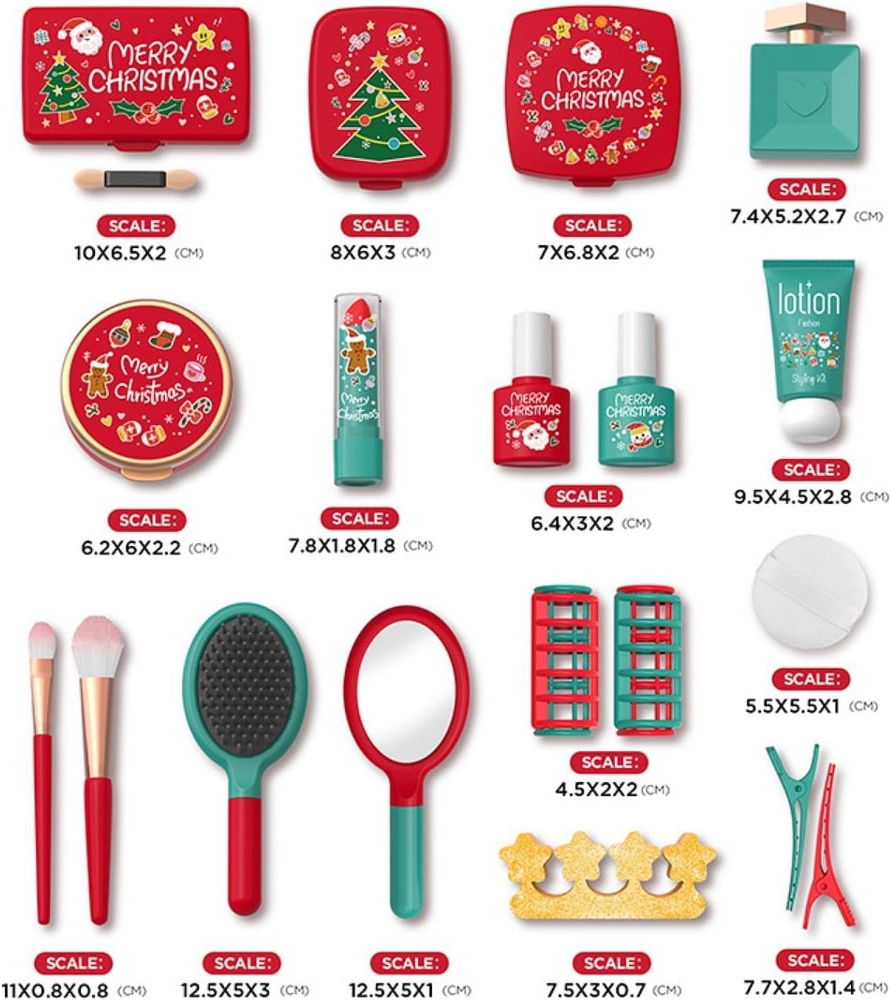 【Set di trucco natalizio festivo】: questo kit di trucco finto è progettato appositamente per i bambini, con un allegro tema natalizio e una confezione, ottimo come regalo per le vacanze e per il gioco festivo 【Design realistico】Progettato con dettagli vividi e realistici, il giocattolo per il trucco sembra un vero trucco, stimolando la creatività e l'immaginazione del tuo bambino 【Incoraggia la creatività】: giocare con kit cosmetici finti aiuta a sviluppare le capacità motorie fini, la coordinazione occhio-mano e le abilità sociali del tuo bambino attraverso giochi di ruolo e giochi interattivi 【Custodia portatile】: questo kit per il trucco finto è facile da riporre o da portare con sé per appuntamenti di gioco, viaggi o riunioni di famiglia 【Materiale】: Realizzato in PP di qualità, ogni pezzo è leggero e costruito per resistere al gioco entusiasta, garantendo durata per i bambini piccoli