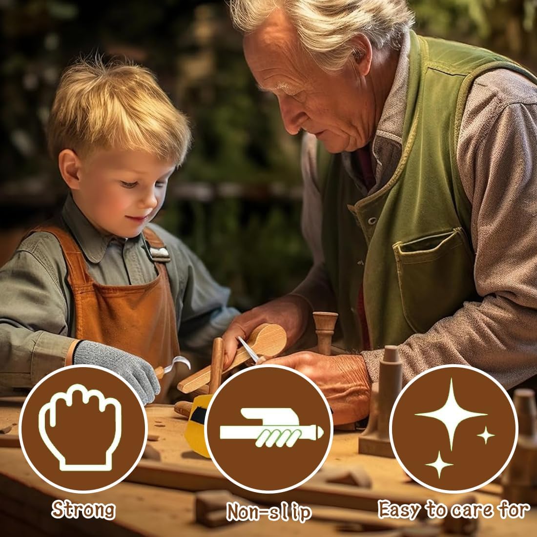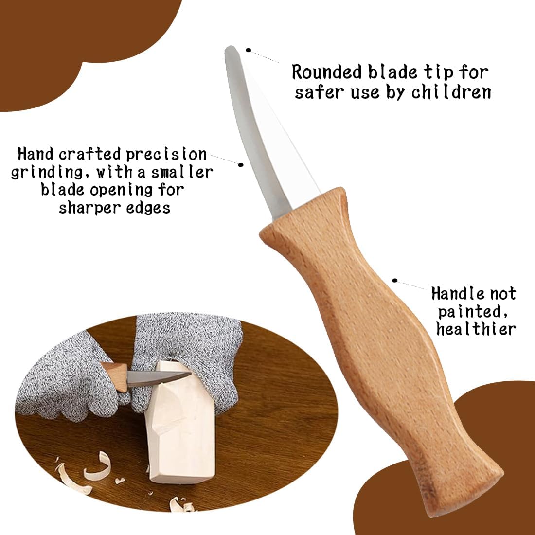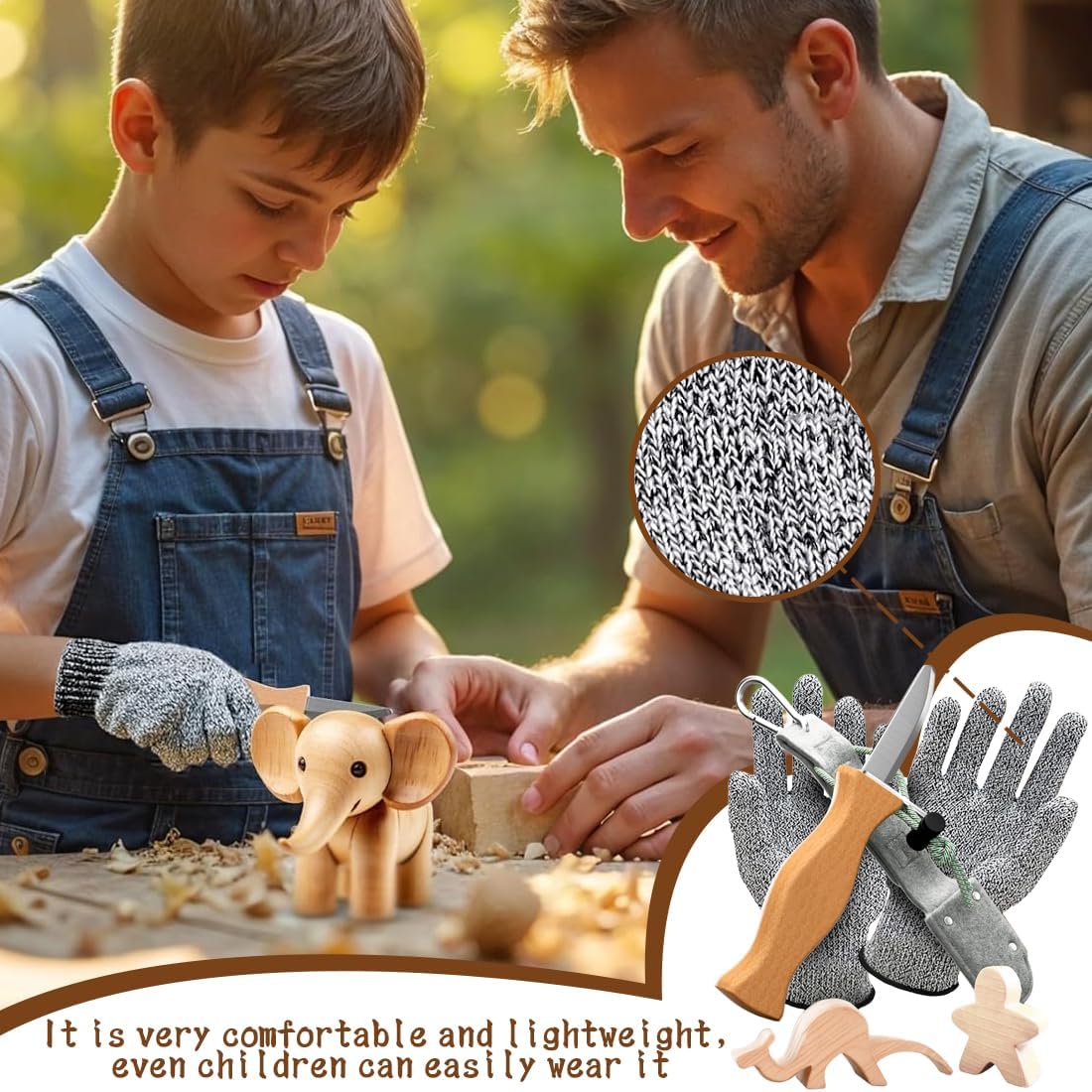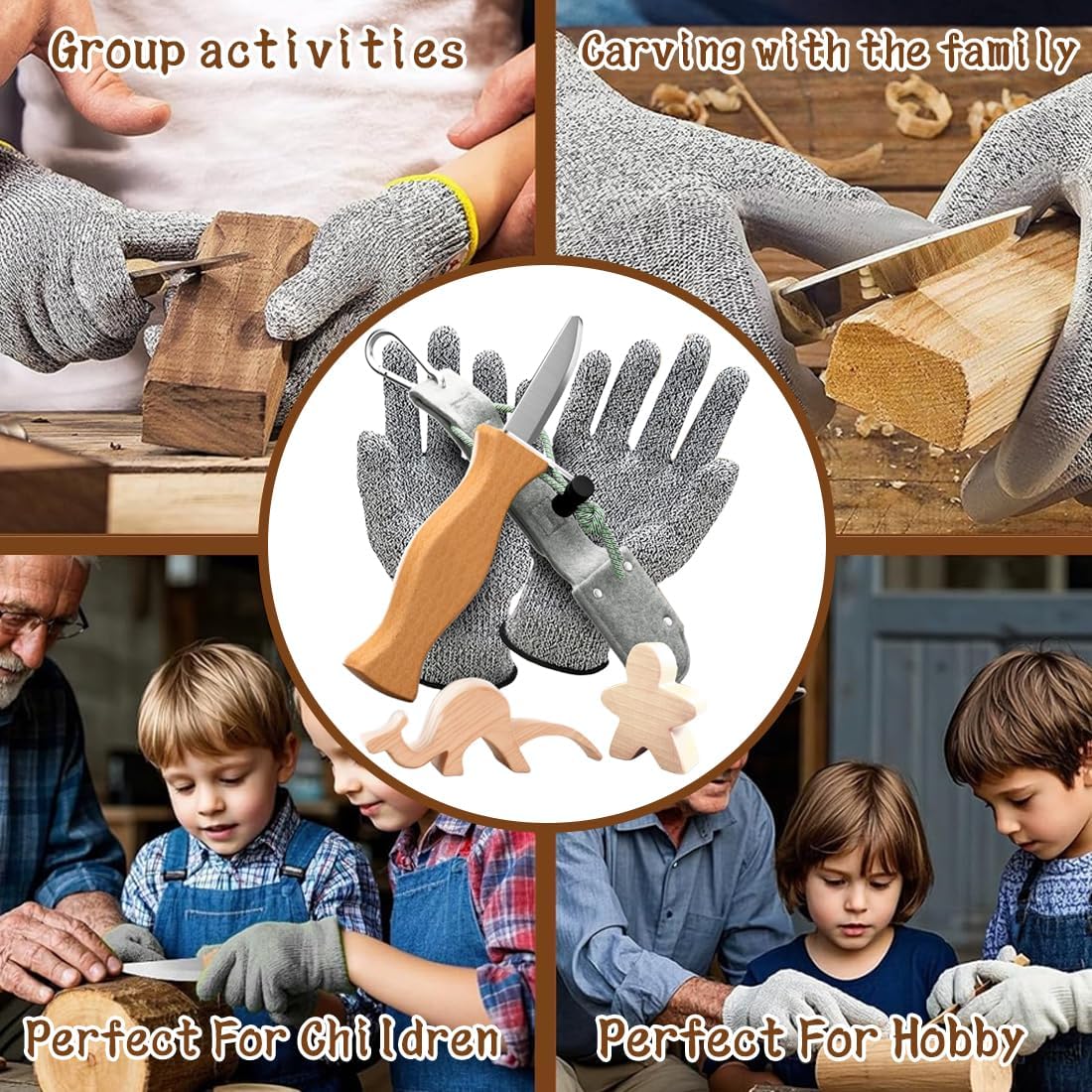 Set per intagliare il legno in tutta sicurezza per bambini: il set comprende un coltello per intagliare il legno con lama arrotondata per bambini, guanti protettivi, una fondina e figure in legno, ideali per intagliare in tutta sicurezza. Alta qualità e precisione: il coltello è dotato di un'affilatura precisa e realizzata a mano, con bordi affilati e un manico in legno sano e non macchiato. Comfort e sicurezza: i guanti protettivi sono resistenti, antiscivolo, comodi e leggeri, così i bambini possono indossarli facilmente e offrono una buona protezione. Promuove le capacità motorie: attraverso l'intaglio del legno, i bambini imparano giocando e migliorano le loro capacità motorie, ideale per attività familiari e di gruppo. Versatile: perfetto per bambini e intagliatori amatoriali, adatto a vari progetti di intaglio del legno e divertente per creare figure in legno.
