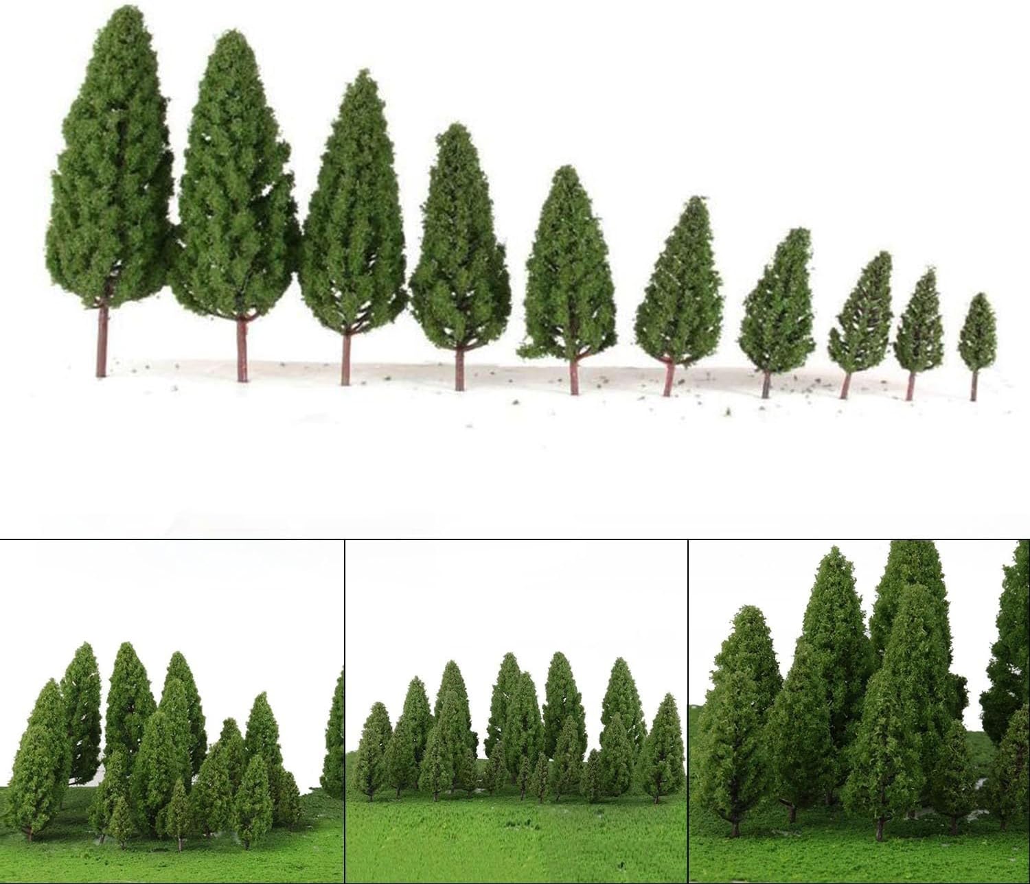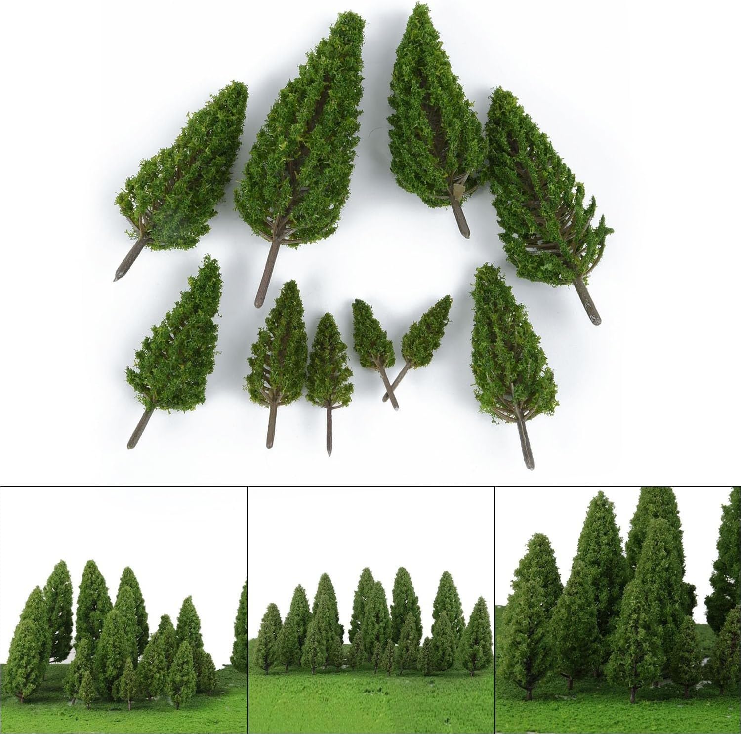 Alberi misti: questa confezione include 20 alberi modello a torre paesaggistica, perfetti per migliorare l'aspetto del tuo paesaggio modello con un tocco di verde. Scala: adatti per scale che vanno da 1/50 a 1/400, questi alberi sono versatili e possono essere utilizzati in vari layout di modelli. Altezza: gli alberi variano in altezza da circa 8 a 16 cm, fornendo opzioni per creare profondità e dimensione nel tuo paesaggio. Materiale: realizzati in plastica, questi alberi sono di lunga durata. Colore: gli alberi sono di colore verde, aggiungendo un aspetto vivace e realistico al tuo paesaggio ferroviario.
