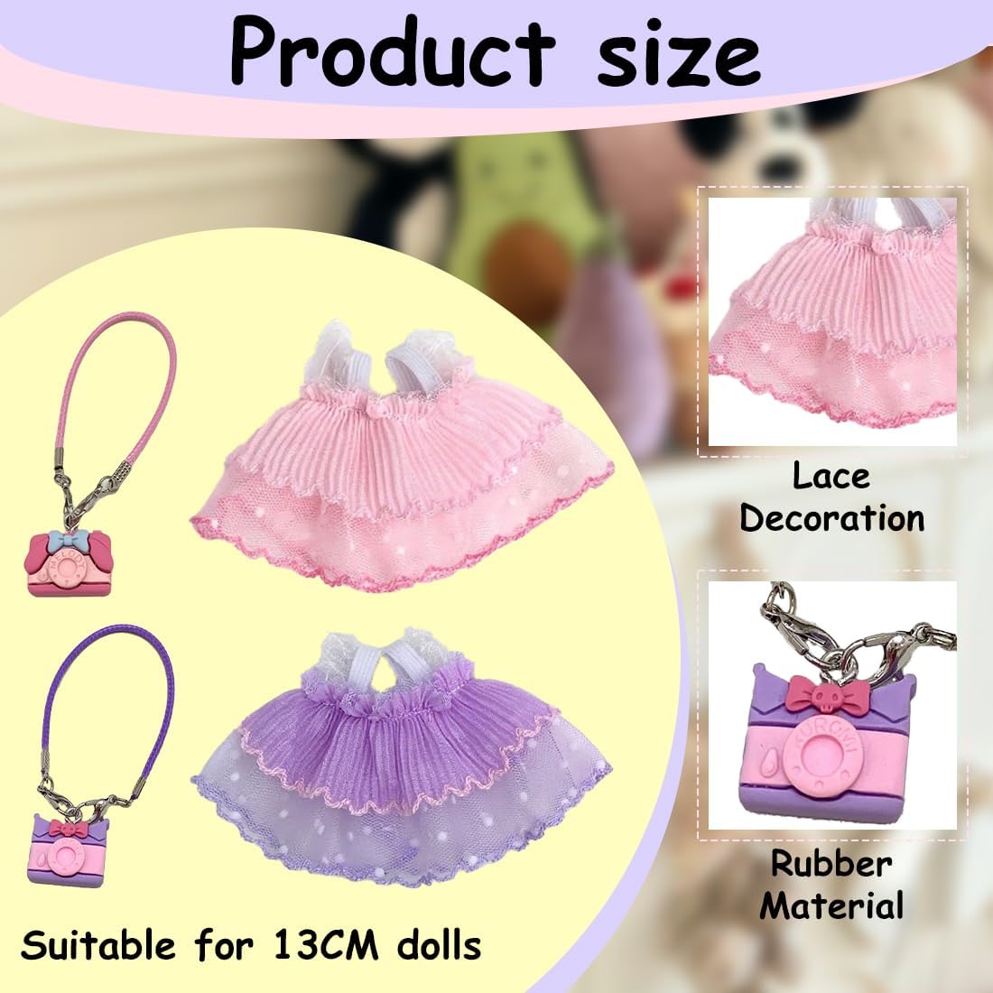 【Vestiti per bambole】 La gonna in pizzo è adatta per vestire bambole fino a 13-17 cm, rende la tua bambola più affascinante e bella e diventa un accessorio attraente. 2 abiti in pizzo: rosa e viola; 2 accessori per borsa: rosa e viola. 【Vestito per bambola】 I vestiti in peluche da 13 cm sono adatti per vestire la tua bambola e possono anche essere usati come ottimo accessorio per la bambola e adattarsi a diversi stili e scene. 【Materiali di alta qualità】 I vestiti per le bambole sono realizzati con materiali di alta qualità, sono morbidi e confortevoli e hanno un design unico e carino, offrendoti una buona esperienza tattile. 【Scelte multiple】 I vestiti sono disponibili in diversi stili e aggiungono un tocco di fascino alla tua bambola. È carino e pratico e molto adatto per le occasioni festive. 【Regalo ideale】 L'abbigliamento per bambole no solo è un ottimo accessorio per bambole, anche se è adatto anche come regalo per amici, bambini e amici in occasione di compleanni, Ringraziamento, Natale, Halloween.