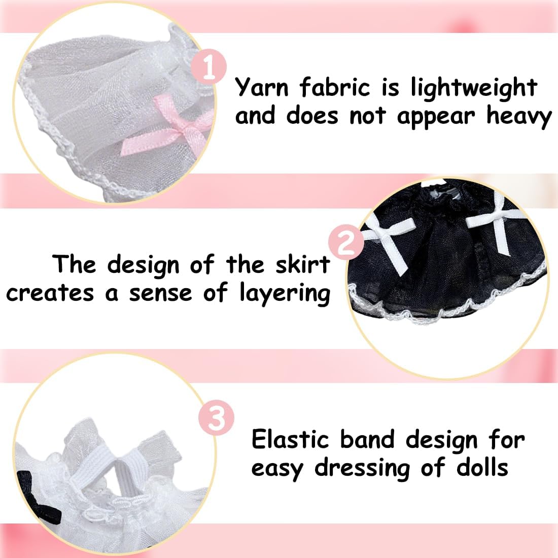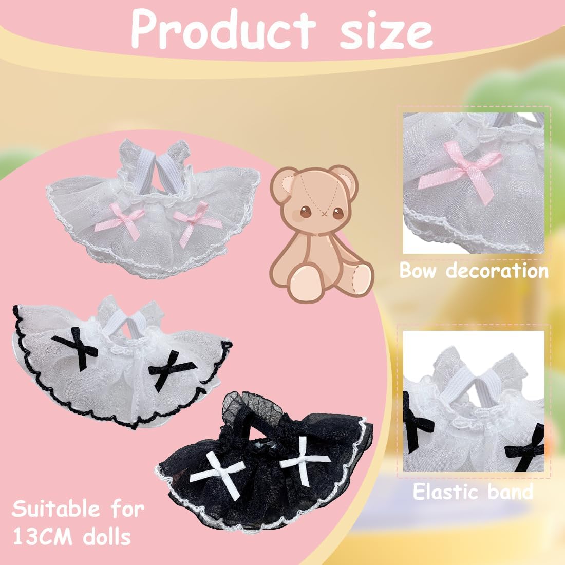 【Vestiti per bambole】 La gonna in pizzo è adatta per vestire bambole fino a 13-17 cm, rende la tua bambola più affascinante e bella e diventa un accessorio attraente. 3 pezzi: nero, rosa, bianco. 【Vestito per bambola】 I vestiti in peluche da 13 cm sono adatti per vestire la tua bambola e possono anche essere usati come ottimo accessorio per la bambola e adattarsi a diversi stili e scene. 【Materiali di alta qualità】 I vestiti per le bambole sono realizzati con materiali di alta qualità, sono morbidi e confortevoli e hanno un design unico e carino, offrendoti una buona esperienza tattile. 【Scelte multiple】 I vestiti sono disponibili in diversi stili e aggiungono un tocco di fascino alla tua bambola. È carino e pratico e molto adatto per le occasioni festive. 【Regalo ideale】 L'abbigliamento per bambole no solo è un ottimo accessorio per bambole, anche se è adatto anche come regalo per amici, bambini e amici in occasione di compleanni, Ringraziamento, Natale, Halloween.