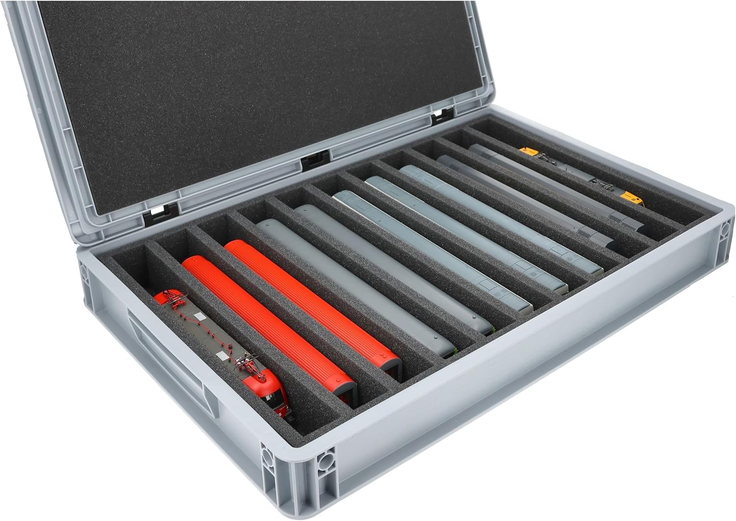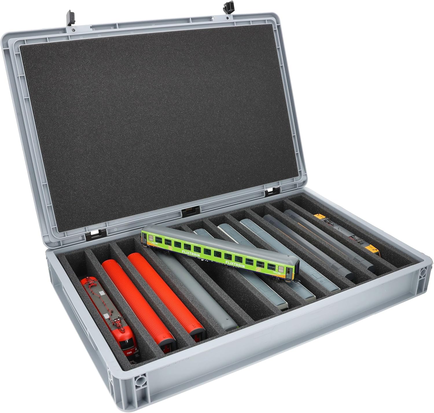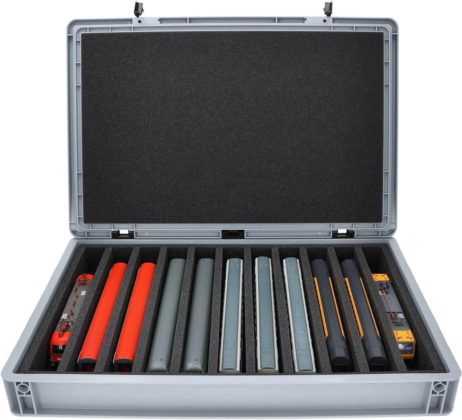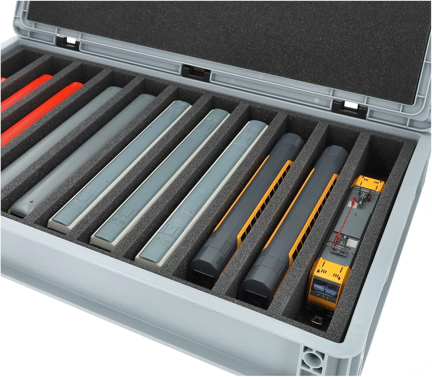 Set Feldherr Eurobox 60 x 40 cm per modellismo ferroviario - Scartamento H0 - Contenitore Euro compatto e robusto con inserto in schiuma con 11 scomparti per lo stoccaggio in piedi di locomotive, vagoni e veicoli Dimensioni del compartimento: ca. 340 x 38 x 55 mm - Inserto su misura per una presa sicura - possibili diversi modelli per scomparto Set composto da: Eurobox robusto e impilabile con coperchio incernierato, inserto in schiuma, copertura del coperchio - Ammortizzazione ottimale e protezione completa durante il trasporto Pratica maneggevolezza grazie alle dimensioni compatte (dimensioni esterne della scatola: 600 mm x 400 mm x 90 mm) e impugnature incassate - può essere impilato per risparmiare spazio sullo scaffale o utilizzato in viaggio 👉 Tutte le figure e i componenti del gioco mostrati servono per il confronto delle dimensioni e non sono inclusi. I modelli stampati in 3D possono presentare piccole imperfezioni. Le immagini del prodotto mostrano le possibili applicazioni, i colori possono variare.