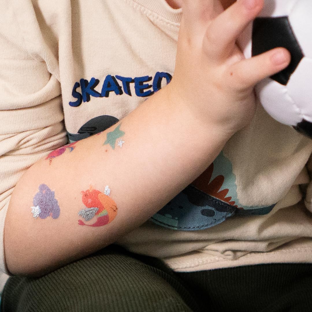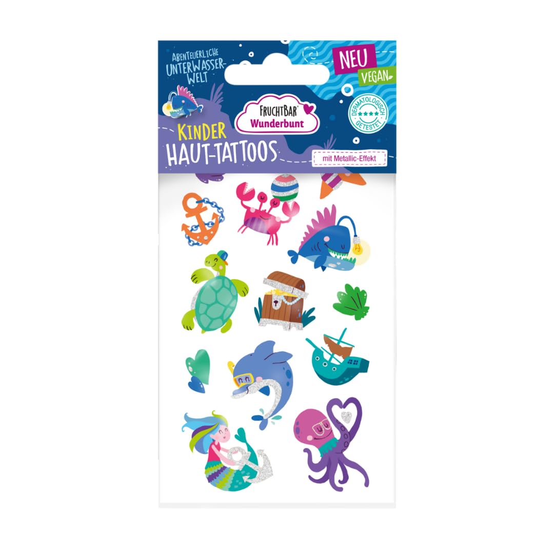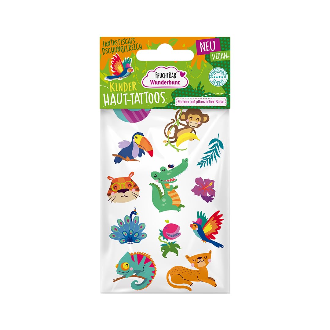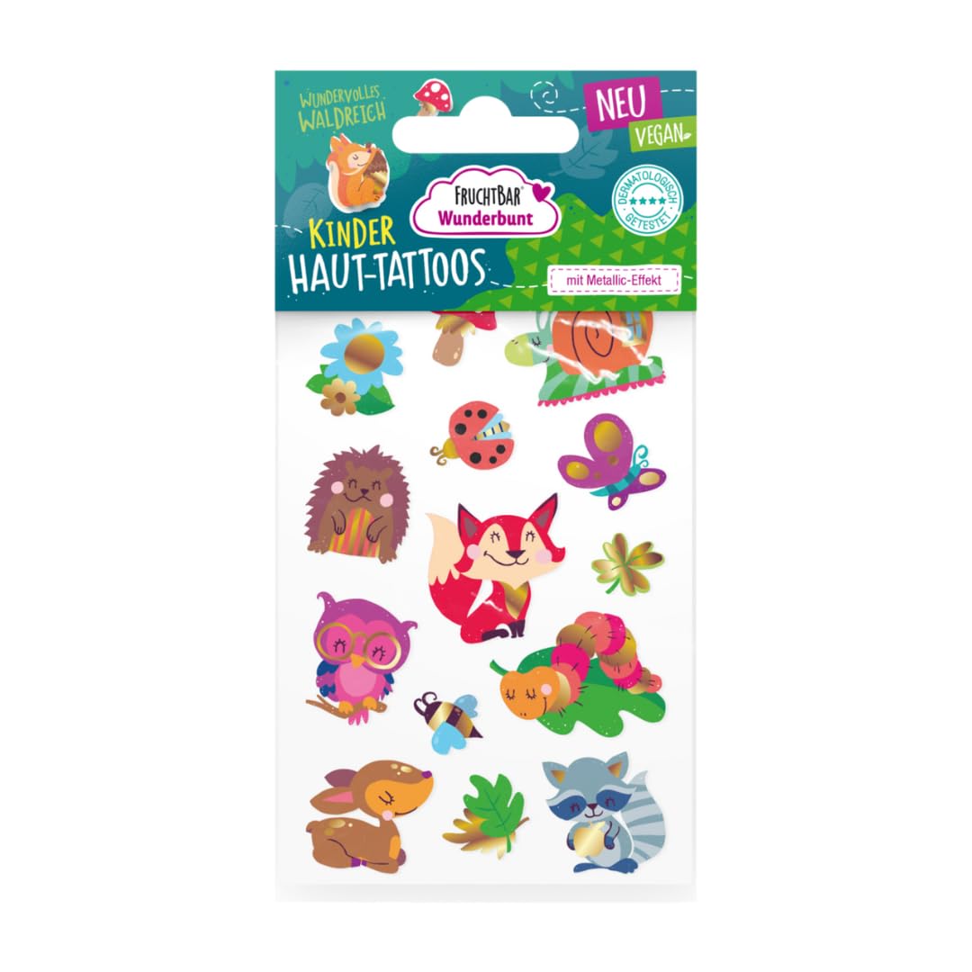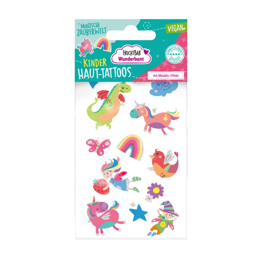 DERMATOLOGICAMENTE TESTATO: i tatuaggi adesivi Wunderbunt sono stati sviluppati appositamente per la pelle sensibile dei bambini, sono dermatologicamente testati e sono molto facili da applicare e lavare nuovamente. MONDI A TEMA COLORATI: i motivi e i temi dei tatuaggi per bambini sono ispirati e orientati agli interessi dei bambini e delle bambine - nel mondo Wunderbunt possono dare libero sfogo alla loro immaginazione. IMPARA GIOCANDO: i colori vivaci dei tatuaggi temporanei possono essere facilmente trasferiti sulla pelle e il fantastico effetto metallico dei tatuaggi adesivi fa sì che i motivi brillino e luccichino alla luce. Ciò significa che i tuoi piccoli non solo potranno godersi i loro colori e motivi preferiti, ma anche conoscere nuovi effetti. TATUAGGI SULLA PELLE DEI BAMBINI: Il set contiene anche un foglio di tatuaggi temporanei per bambini con motivi del mondo magico, del mondo sottomarino e del regno della foresta. 100% vegano e regolarmente dermatologicamente testato, prodotto in Austria. FACILE DA USARE E RIMUOVERE: Il trasferimento dalla pellicola alla pelle del bambino è estremamente rapido, tanto che anche i bambini più impazienti non si emozionano. Una volta applicato, il tatuaggio rimane sulla pelle per circa 2-6 giorni. Se cambi idea, il tatuaggio può essere facilmente rimosso anche con un po' di olio per bambini, acqua e sapone o con una crema nutriente. COSMETICI PER BAMBINI WONDERFUNTE: FruchtBar Wunderbunt offre cosmetici per bambini con ricette a misura di bambino: divertimento con i colori sicuro per i più piccoli e consigliato dai 3 anni in su