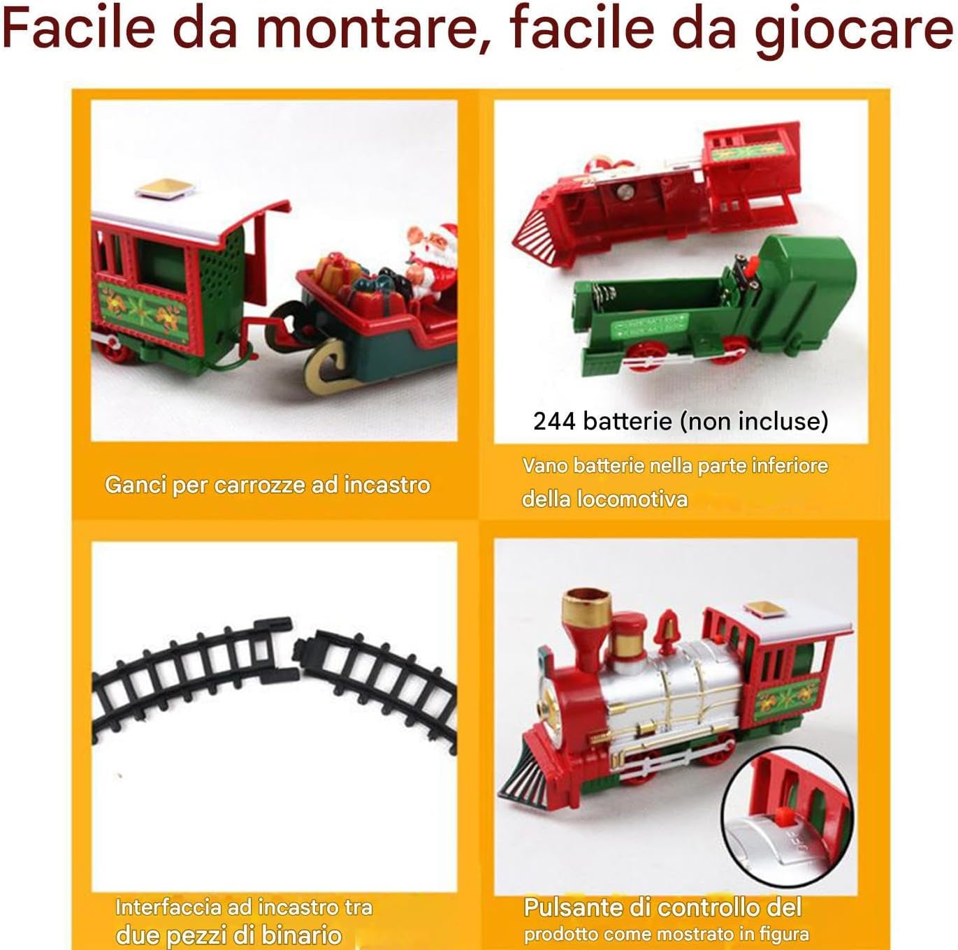 Regalo per Collezionisti: Questo giocattolo unisce il gioco divertente con il fascino 'esposizione, offrendo ai bambini ore di intrattenimento creativo mentre affascina i collezionisti alla ricerca di un regalo di Natale ideale. Arricchisce le collezioni con un pezzo unico e celebra lo spirito festivo in famiglia, condividendo momenti di allegria e . Il set di natalizio è progettato per ispirare passione e ricordi, per rendere le feste ancora più magiche e coinvolg Divertimento Familiare: Il elettrico natalizio crea momenti di gioia condivisa in famiglia con un assemblaggio semplice che coinvolge tutti, promuovendo la collaborazione tra genitori e figli e costruendo ricordi preziosi durante le feste e i weekend a casa. Questo gioco favorisce il familiare attraverso un'attività interattiva e educativa, ideale per sviluppare tradizioni natalizie indimenticabili in ogni occasione speciale e libero domestico. Esposizione Natalizia Classica: Il di Natale, abbellito con Babbo Natale e decorazioni per l'albero, esalta un'autentica scena natalizia che stimola l'immaginazione e completa il fascino senza del tema classico del Natale in qualsiasi ambiente domestico. Questo elemento decorativo aggiunge un tocco di eleganza e calore, ideale per ambienti living o aree festive durante il periodo natalizio. Configurazione Rapida per Tutte le Età: Dotato di connettori a scatto e binari modulari senza utensili, questo set di moo garantisce un assemblaggio veloce e intuitivo, offrendo un'esperienza user-friendly che incoraggia creatività e divertimento. È per famiglie o gruppi di amici che si riuniscono per costruire setup ferroviari elaborati in qualsiasi ambiente interno, stimolando il gioco collaborativo e l'immaginazione senza complicazioni. Esperienza Audiovisiva Coinvolgente: Questo natalizio con luci multicolore in movimento e suoni festivi garantisce un'esperienza audiovisiva coinvolgente, arricchendo le decorazioni stagionali con fascino ed eccitazione mentre allieta gli ospiti durante le feste o gli eventi familiari, creando un'ambiente gioioso e accogliente per momenti indimenticabili nel periodo natalizio con luci dinamiche e melodie festive.
