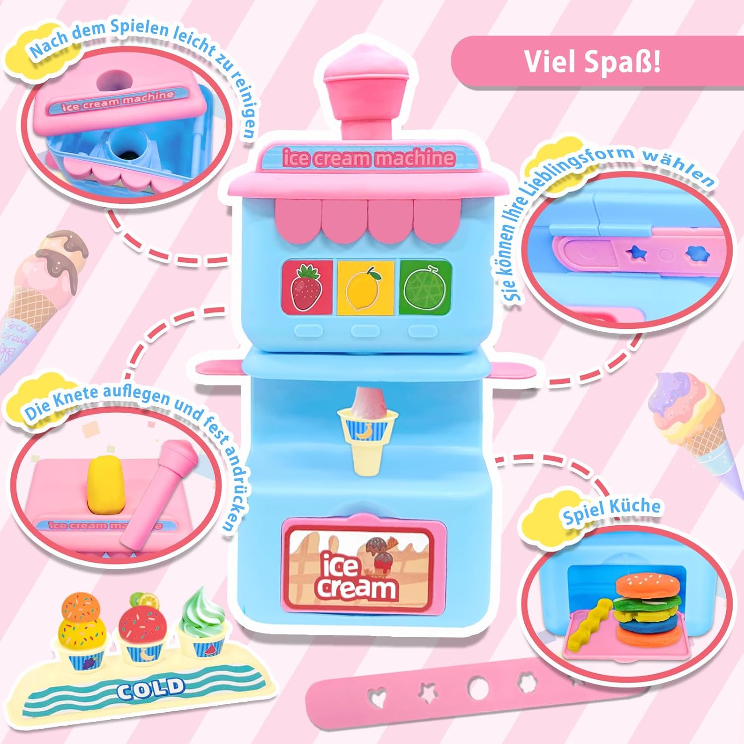 Ricco set per impasto: il set per impasto 3 in 1 contiene 71 pezzi di accessori per l'impasto, il set contiene: macchina per il gelato, 24 barattoli di impasto colorato e vari accessori come mattarello per bambini, cartello, adesivo, bilancia per impasto, spremitore, taglierina a rullo per impastare e altro ancora. I bambini possono utilizzare l'argilla per bambini per realizzare varie forme di bamboline, dolcetti, ecc., che stimolano la loro creatività e artigianato e lasciano correre la loro immaginazione. Set di pasta da gioco colorata: la pasta da gioco dei nostri bambini è composta da farina di frumento + acqua + sale. È sicuro e non tossico, quindi i genitori possono stare certi che i loro bambini potranno giocarci. L'impasto è morbido, facile da modellare, colorato e non si secca facilmente, così i bambini possono essere creativi e costruire ogni sorta di forme divertenti. Adatto come regalo per bambine 4 5 6 7 8 9 10 anni. Set per impasto colorato Set per gelatiera per impasto fai da te: metti l'impasto nella gelatiera e premi semplicemente la maniglia per creare un gelato con impasto colorato. I bambini possono dare libero sfogo alla loro fantasia e creare le proprie creazioni di gelato. Il gelato con la plastilina non è solo divertente, ma stimola anche l'interesse dei bambini per il cibo. DIVERTIMENTO SENZA MANI: Con la gelatiera, che prepara il gelato con l'utensile per impastare, i bambini non solo possono allenare le loro abilità pratiche, ma anche imparare a creare e sviluppare la loro immaginazione in modo giocoso. Con il set impasto gelatiera, preparare il gelato è facile e divertente! Con pochi semplici passaggi, puoi goderti il divertimento del fai-da-te e provare il senso di realizzazione nel realizzarlo. Condividilo con i tuoi amici, divertiti e crea il tuo festival del gelato! Plastilina è il miglior regalo per i bambini: plastilina regalo per ragazze e ragazzi dai 3 anni, la plastilina non è solo un giocattolo, ma anche un giocattolo educativo che promuove l'immaginazione e le abilità pratiche dei bambini. È il miglior regalo per i bambini che porterà loro gioia promuovendo al contempo la loro abilità pratica e creatività. Lascia che crescano felici e plasmino il futuro con un'immaginazione illimitata. Consigliato per la scuola di plastilina di 1a elementare