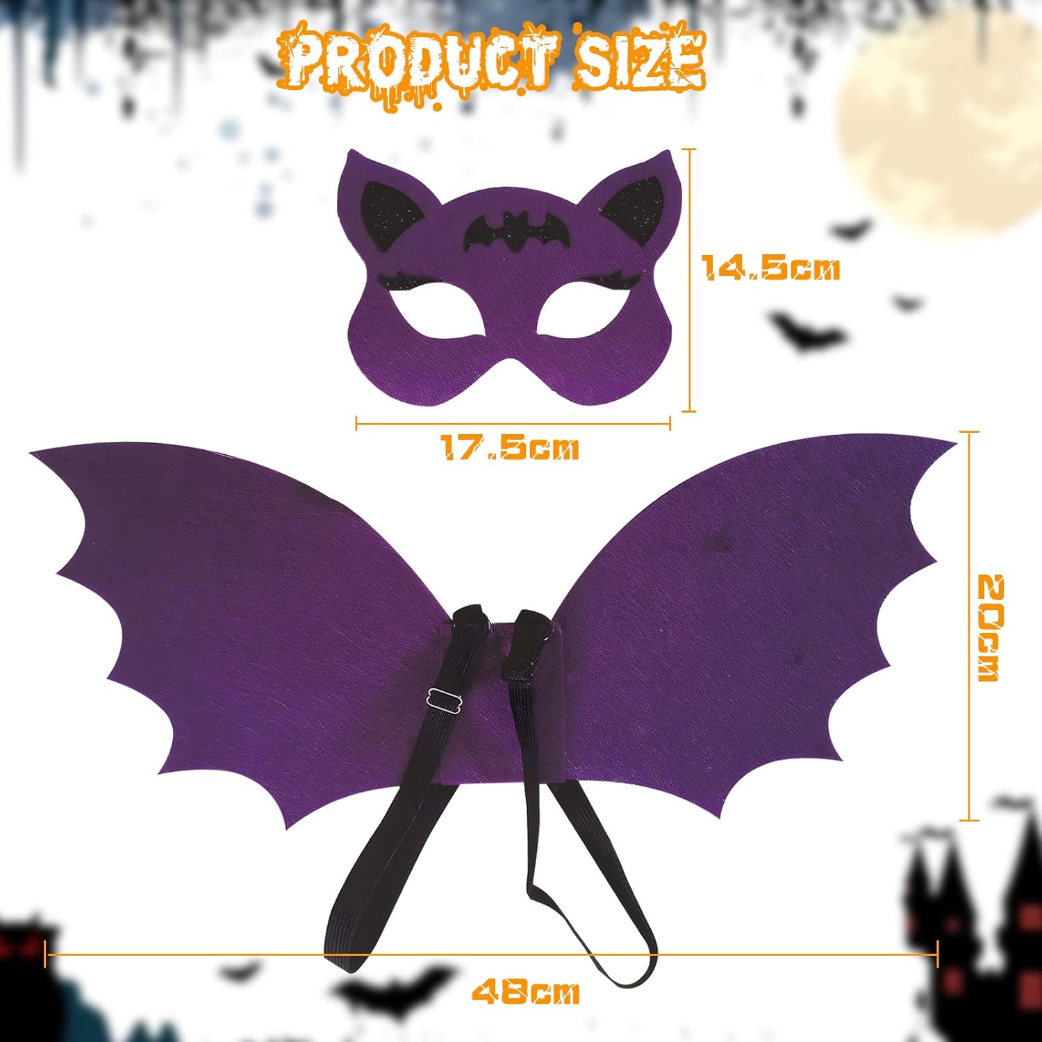 Caratteristiche del prodotto: 1. Tessuto non tessuto, leggero e resistente, adatto per un uso a lungo termine. 2. A forma di pipistrello, 48 x 20 cm, si trasforma istantaneamente in un personaggio misterioso. 3. Adatto a molteplici scenari, tra cui feste, riprese e Halloween. Specifiche di produzione: Materiale: tessuto non tessuto. Dimensioni del prodotto: 25 x 22 x 0,8 cm. Colore: nero, viola, arancione. Peso: 0,05kg. Contenuto della confezione: 1 maschera con ali di pipistrello.