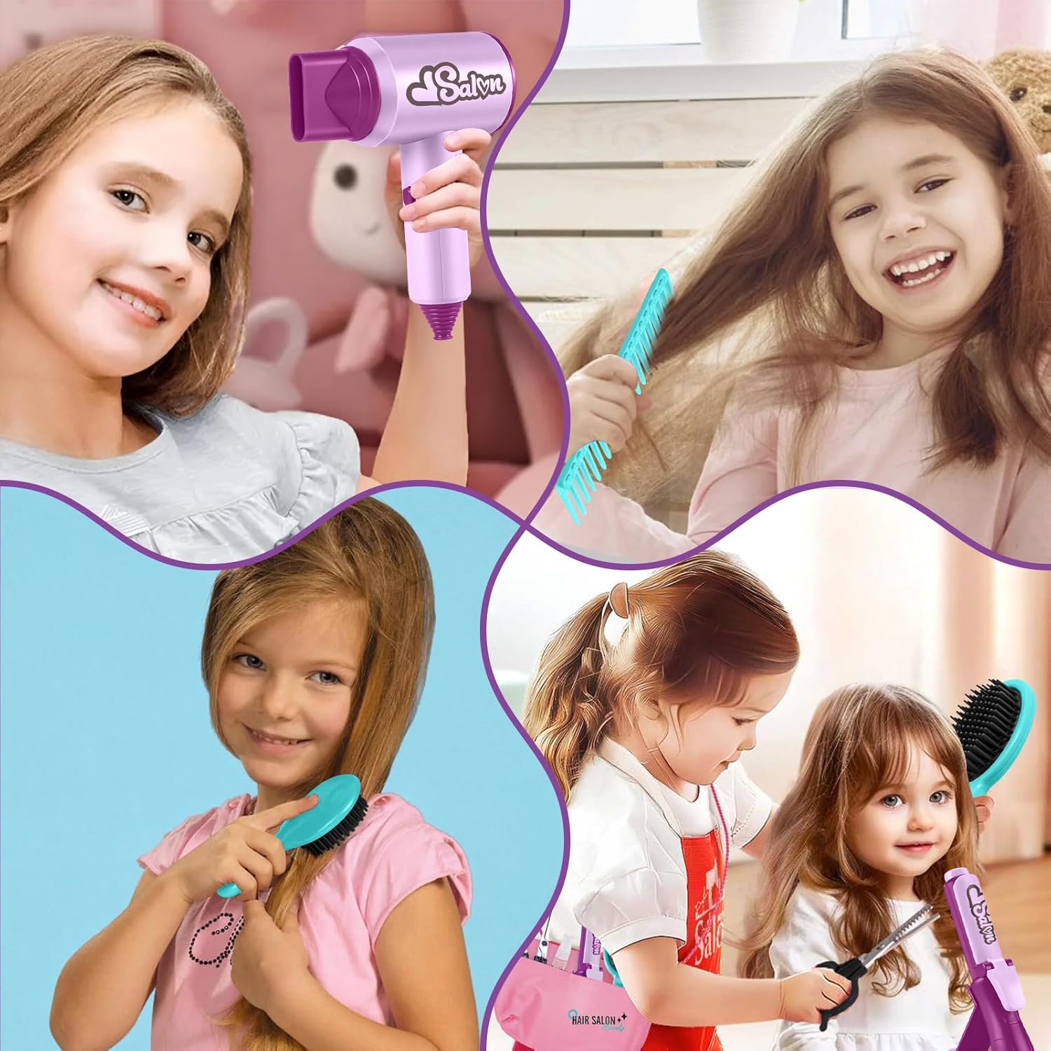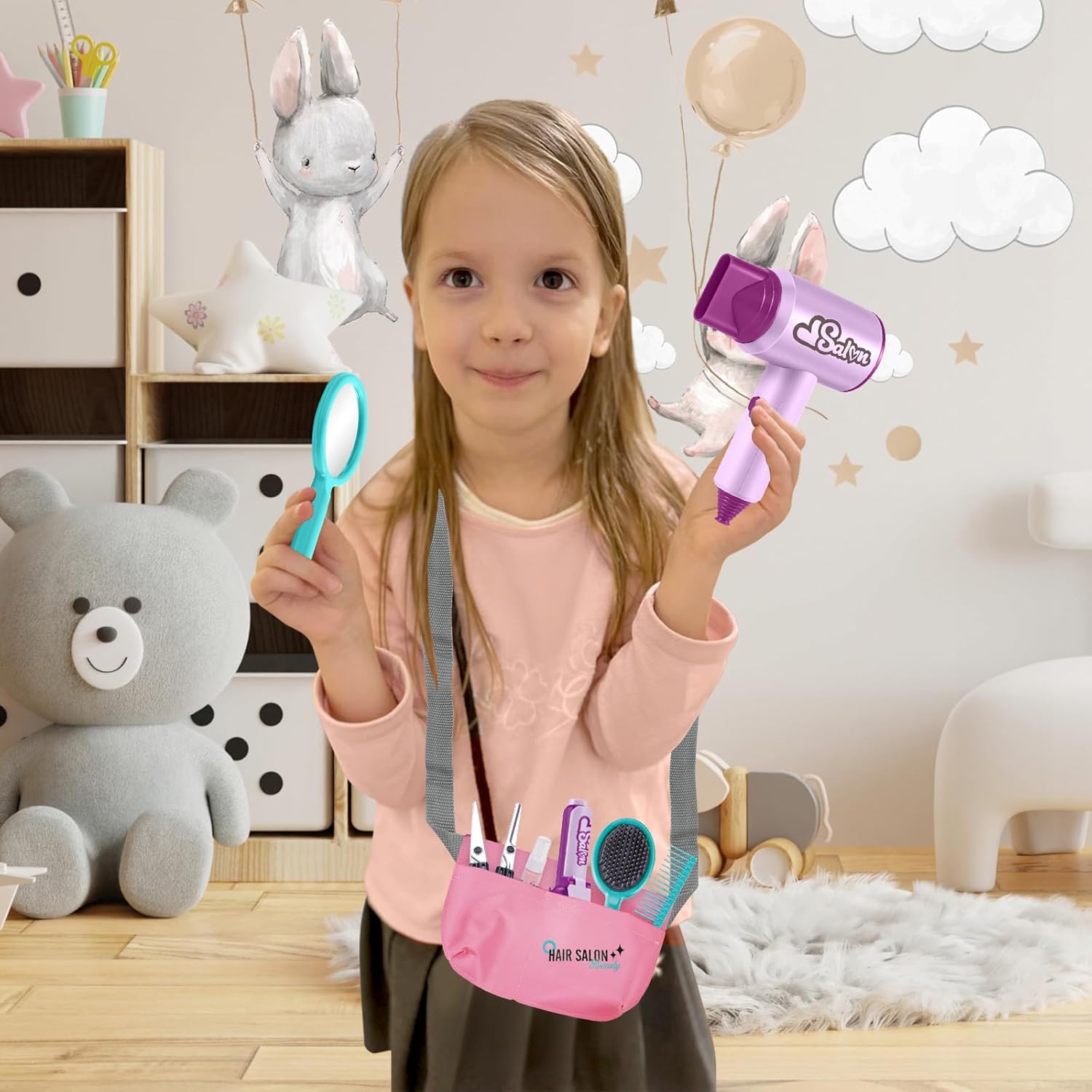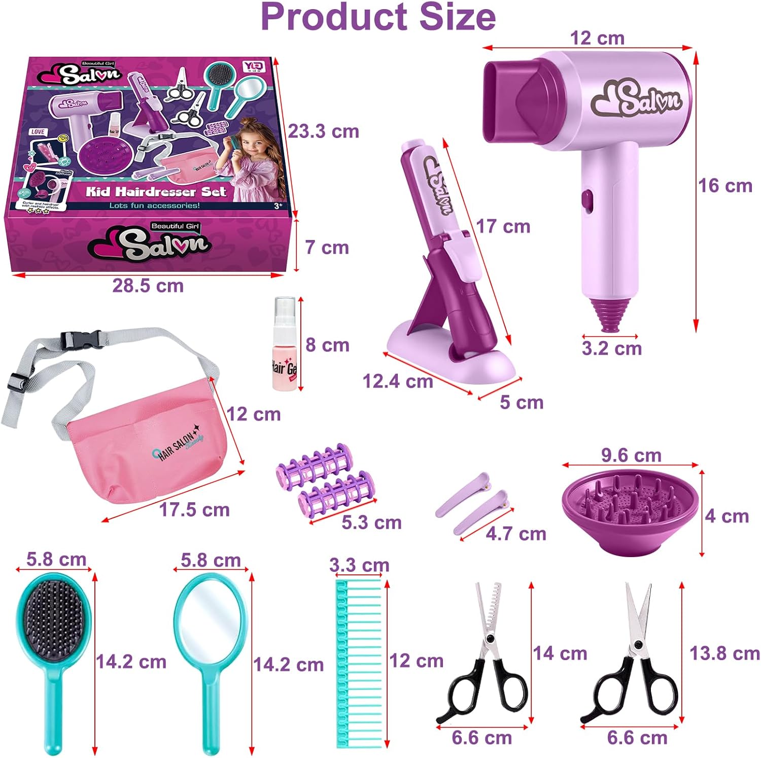 【16 Pezzi di Giocattoli da Parrucchiere】Il set da parrucchiere per bambini è dotato di 2* clip, 2* ferri arricciacapelli, 1* asciugacapelli, 2* testine per asciugacapelli, 1* flacone per lo styling, 1* borsa da barbiere, 1* clip lisciante, 1* supporto di base, 2* pettini, 2* forbici, 1* specchio. Una varietà di accessori per giocattoli da parrucchiere può soddisfare le esigenze del tuo bambino. 【Asciugacapelli e Piastra per Capelli Realistici】Questo asciugacapelli alimentato a batteria emette suoni e soffia come un vero asciugacapelli e può soffiare un po' di aria fredda(Nota: sono necessarie 2 batterie AAA. Non incluse). Due diverse testine per asciugacapelli aiutano i bambini a creare capelli lisci e ricci. La piastra per capelli può produrre effetti di luce, consentendo loro di avere un'esperienza di styling più realistica, aggiungendo più divertimento per le ragazze. 【Interazione con le Amiche】A ogni bambina piace imitare i travestimenti degli adulti e tutte vogliono avere il loro primo set per lo styling! Questo giocattolo educativo di finzione è perfetto per le tue bambine per invitare gli amici a giocare insieme, imparare a conoscere il salone di moda, migliorare le loro capacità sociali e comunicative attraverso i giochi, migliorare la coordinazione occhio-mano e stimolare l'immaginazione e la creatività dei bambini! 【Sicurezza e Qualità】Diamo priorità alla sicurezza dei tuoi bambini e questo set di giocattoli è realizzato in plastica ABS di alta qualità, che è sicura e leggera. I tuoi bambini possono giocare facilmente con questo set di giocattoli da barbiere. Il design leggero e la superficie facile da pulire promuovono l'igiene, mentre i suoi colori vivaci lo rendono più attraente visivamente 【Regalo Perfetto per le Bambine】Questo giocattolo è adatto alle bambine per fingere di giocare e soddisfare la loro curiosità ed è il miglior regalo per bambine di 3 4 5 6 7 8 anni. È perfetto per compleanni, giochi di novità, feste di principesse, appuntamenti di gioco, saloni di bellezza, attività di festival, attività di festa. Un ottimo regalo per compleanni, festival, Halloween, Capodanno, ecc.