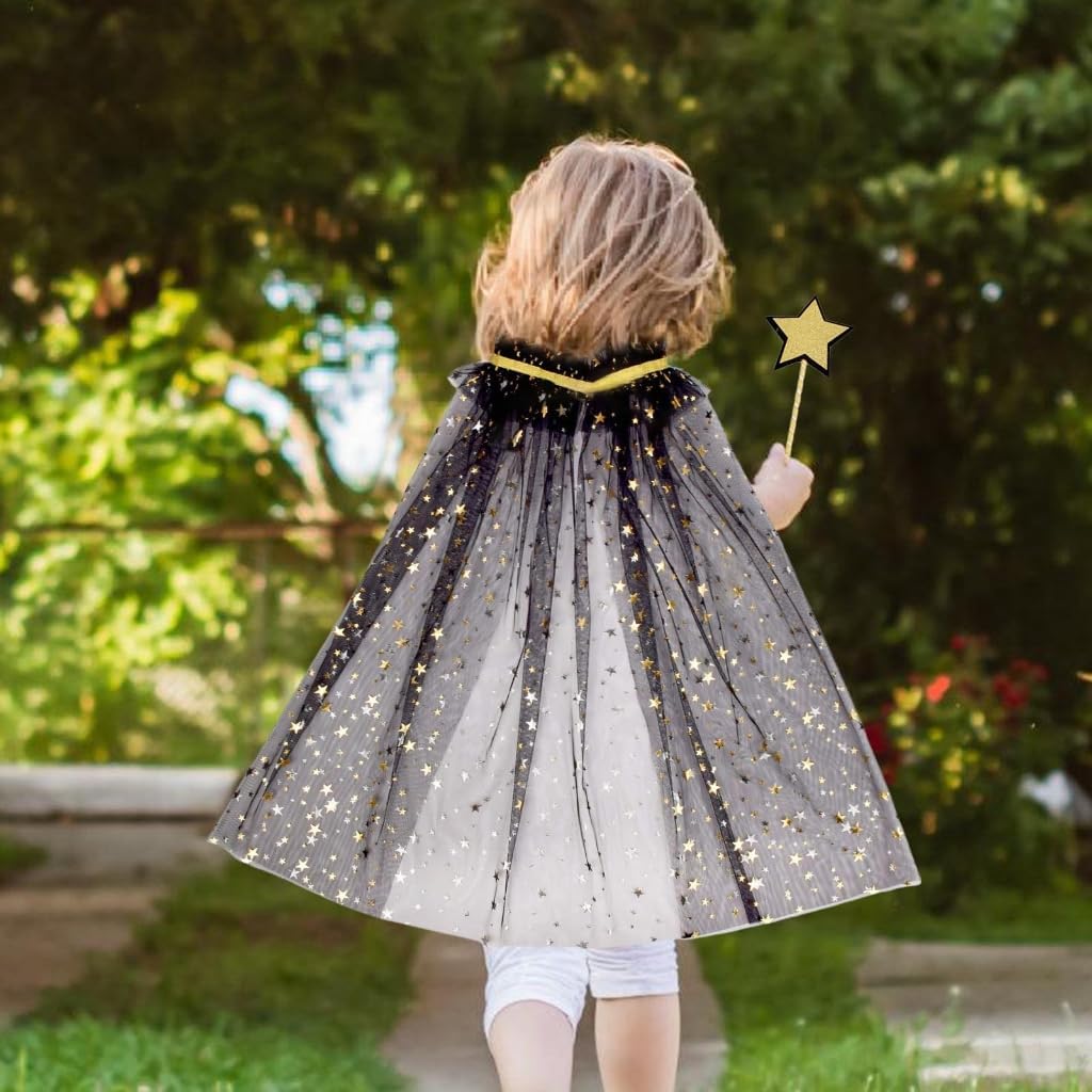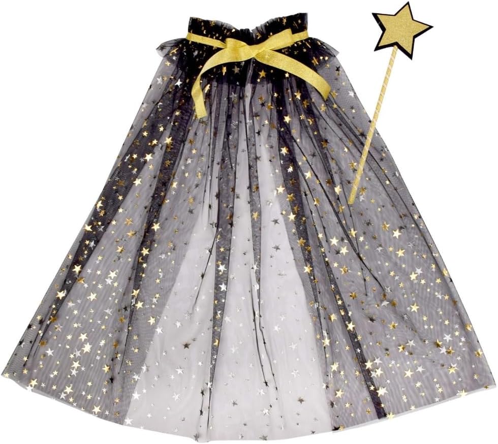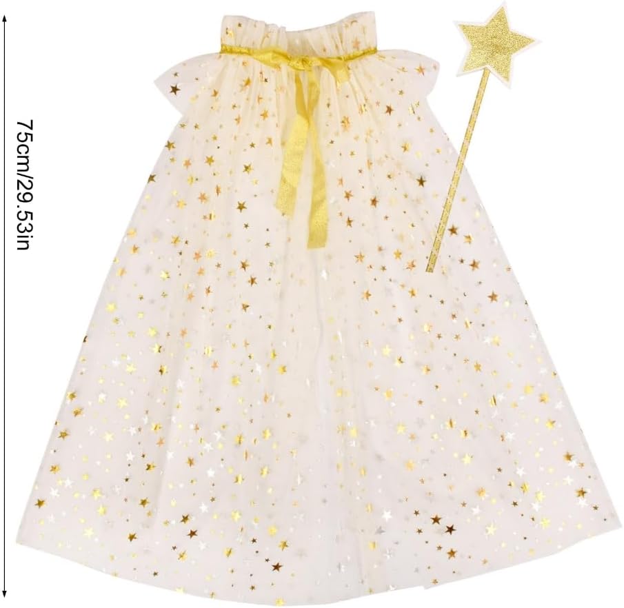 Set di 2 bacchette magiche a forma di stella per bambina e una mantella in tulle, per accendere la fantasia. Realizzata in tulle leggero e morbido, la mantella è decorata con stelle, mentre lo scollo regolabile assicura una vestibilità comoda. Progettato per i bambini, è ideale per i sognatori e le fate in erba. Ideale per feste di compleanno, cosplay, spettacoli teatrali o servizi fotografici, questo costume promette di creare ricordi indimenticabili e momenti affascinanti. Lancia un po' di magia con questo set di bacchetta magica e mantello, un accessorio indispensabile per la collezione fantasy di ogni bambino, assicurando che si distinguano tra la folla in ogni occasione festiva.