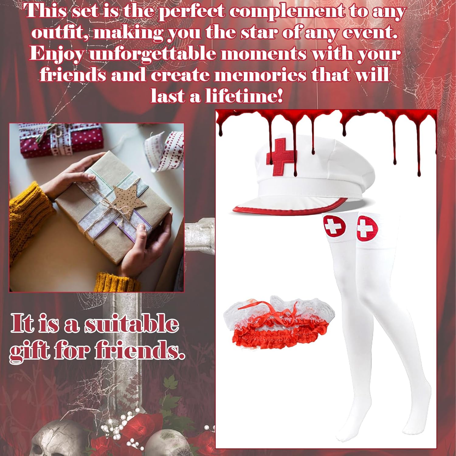 Das Kostüm an sich ist überhaupt nicht dabei, obwohl es selbst hier bei der Bewertung auf dem Foto gezeigt wird. Man erhält nur Strümpfe, Mütze und Strumpfband. Für den Preis wäre das normalerweise auch noch in Ordnung, aber man erwartet halt etwas anderes. Im Titel steht drin dass das "Nurse-Kostüm" nicht enthalten ist, aber so, dass es überlesen werden muss. Die Teile sind billig verarbeitet und ich empfehle das Set nicht weiter.