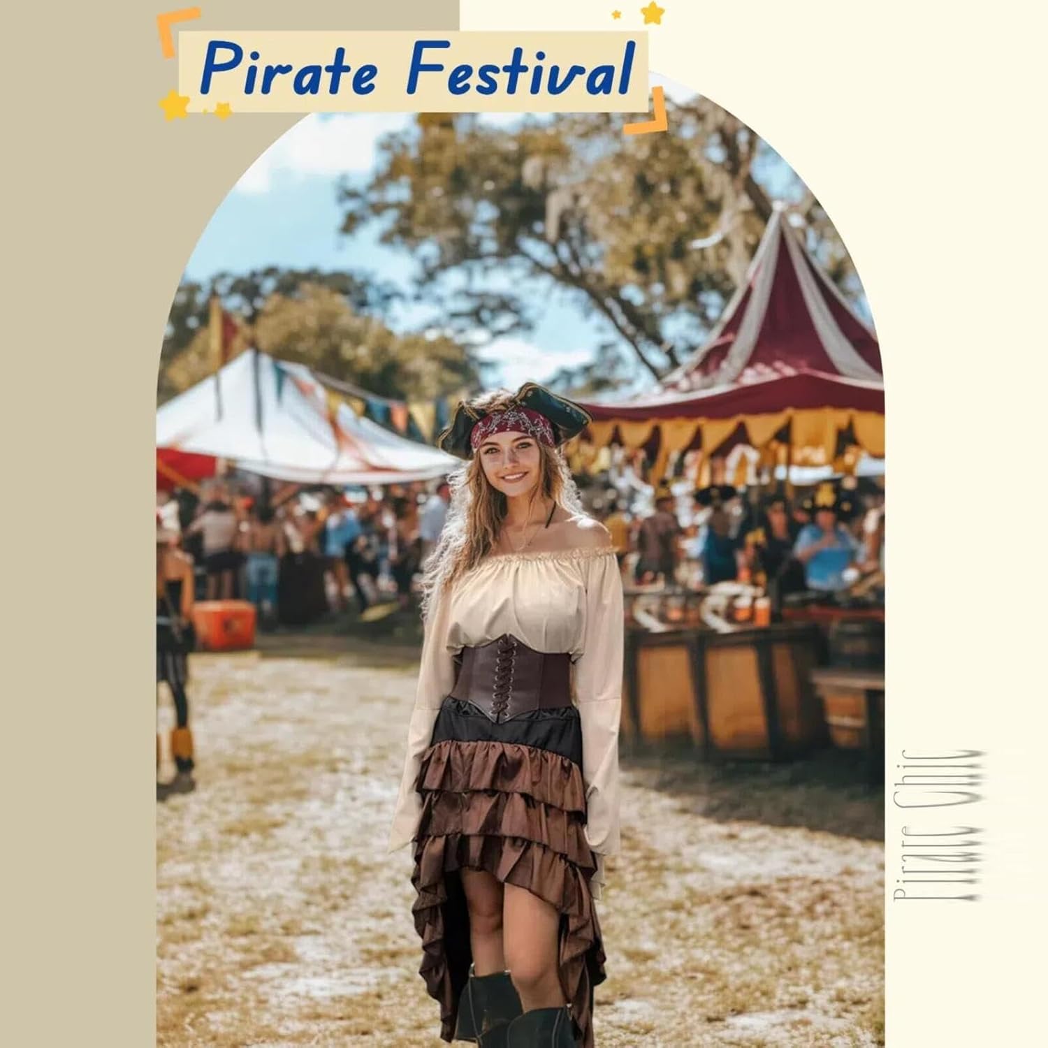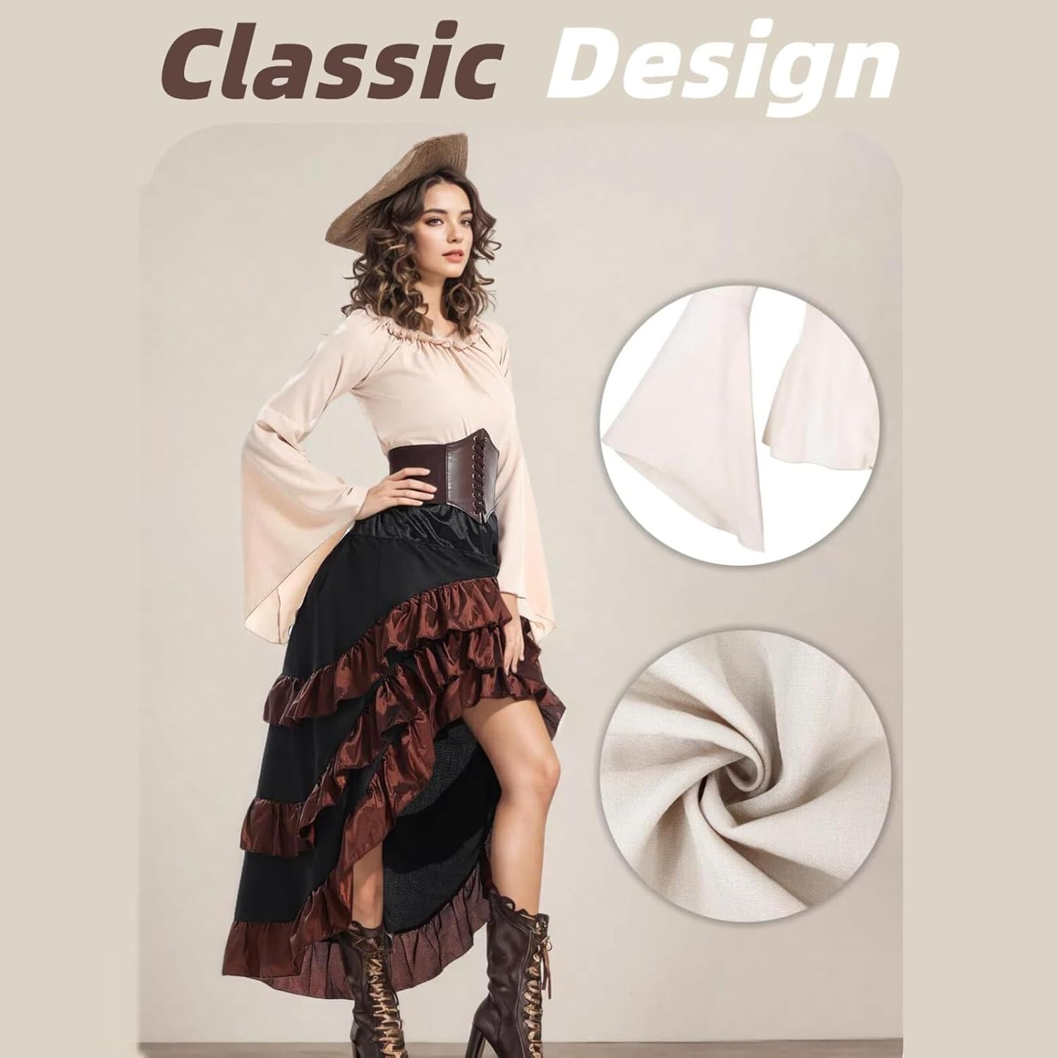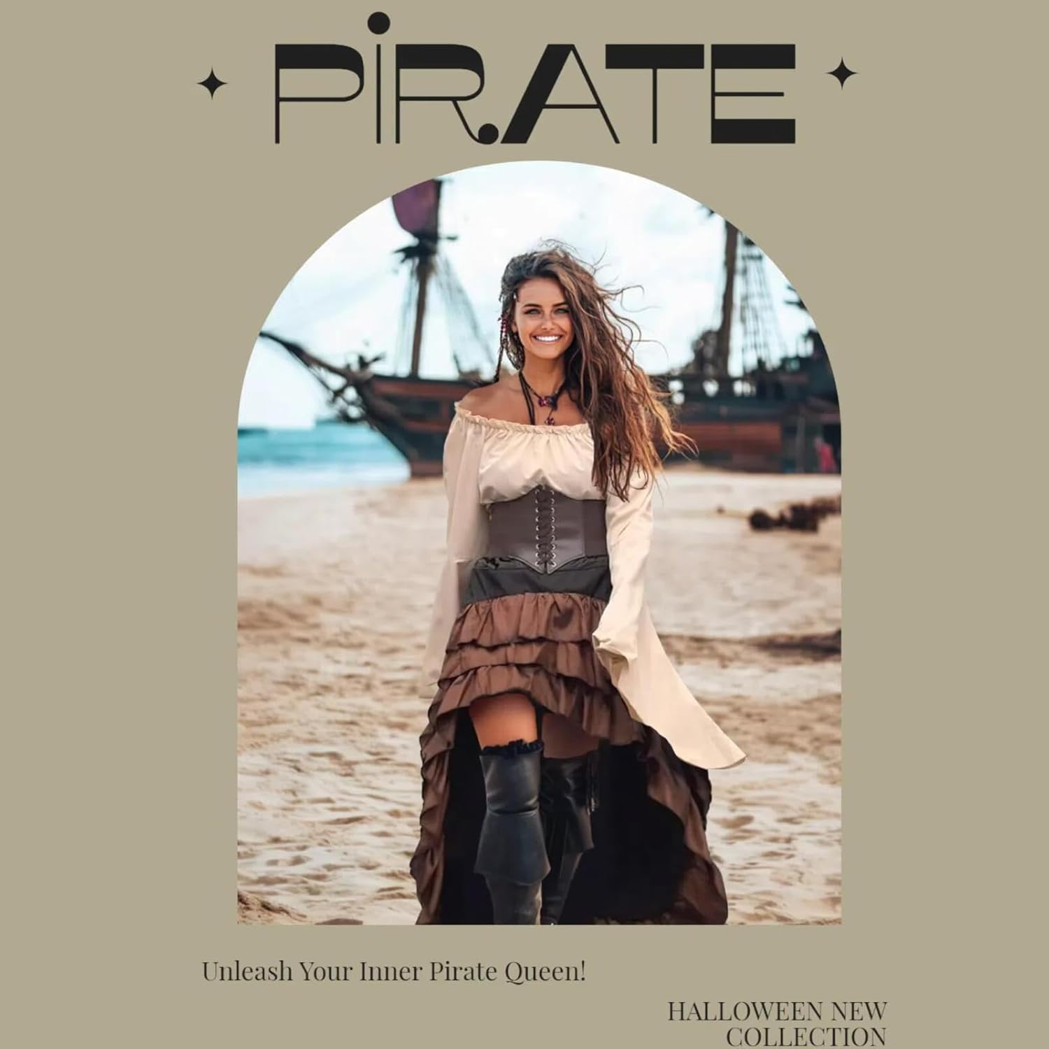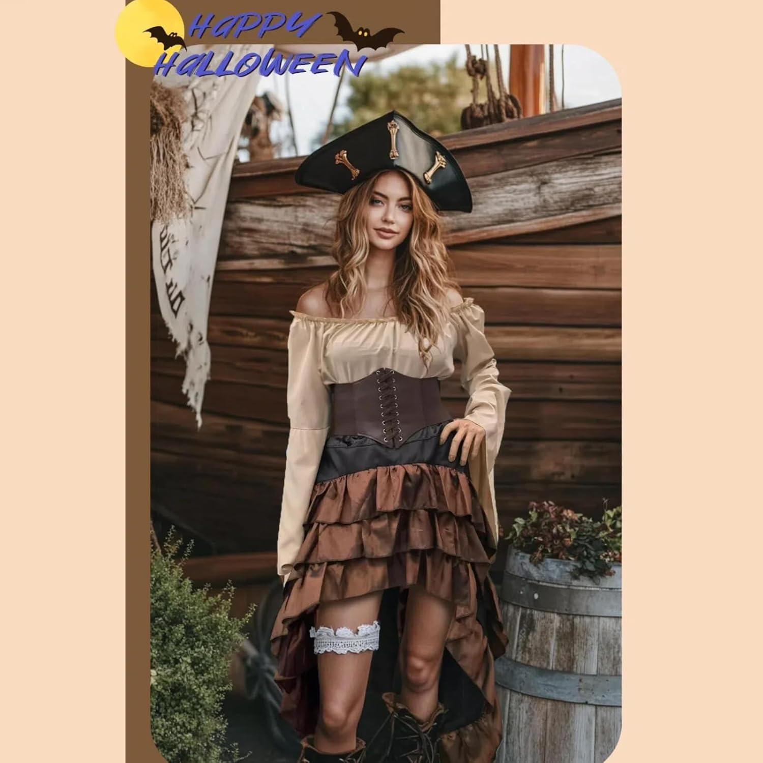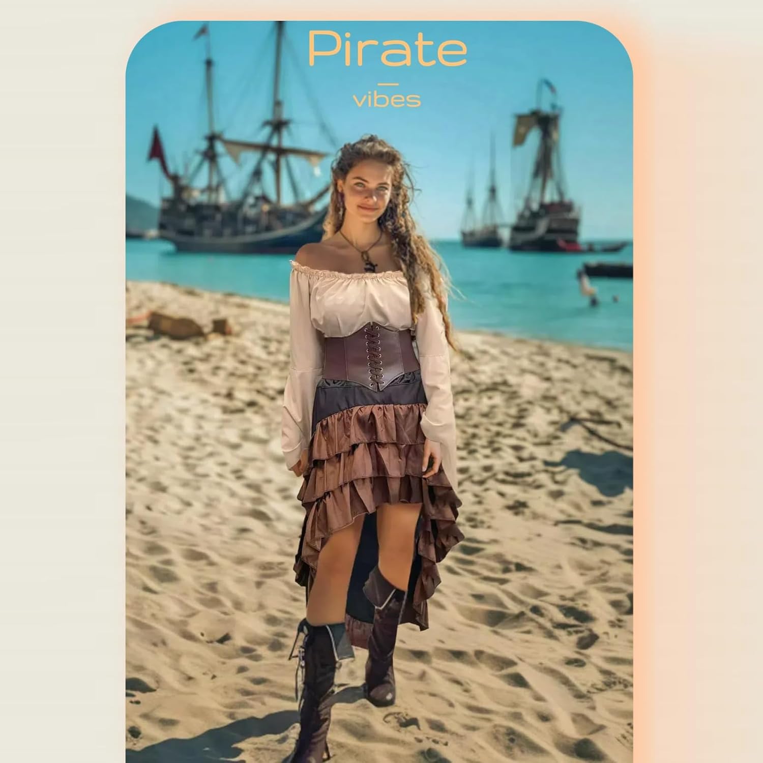 Descrizione prodotto Entra in un mondo di fascino spada con questo costume da pirata rinascimentale da donna. La camicia con spalle scoperte, in una morbida tonalità beige, presenta maniche a campana drammatiche che aggiungono un tocco di stile medievale. Si drappeggia comodamente, assicurandoti di poterti muovere liberamente mentre abbracci il tuo personaggio pirata. Accoppiato con la camicia è una sorprendente gonna alta - bassa arruffata in ricchi toni marroni e scuri. Le balze a cascata creano un look dinamico e accattivante, perfetto per distinguersi alle feste di Halloween o alle fiere rinascimentali. Una cintura in vita corsetto stringe la vita, migliorando la tua silhouette e dando una forma autentica ispirata ai pirati. Che tu stia partecipando a una festa di Halloween, a un evento cosplay o a una festa a tema, questo set di costumi ti ha coperto. La combinazione di camicia fluente, gonna drammatica e cintura corsetto modellante dà vita all'essenza di un pirata rinascimentale, permettendoti di immergerti completamente nel ruolo con stile e comfort. Avviso di sicurezza 1