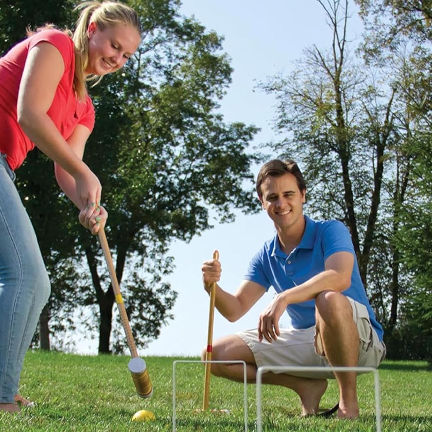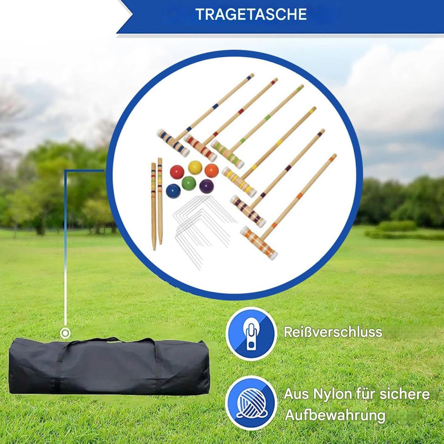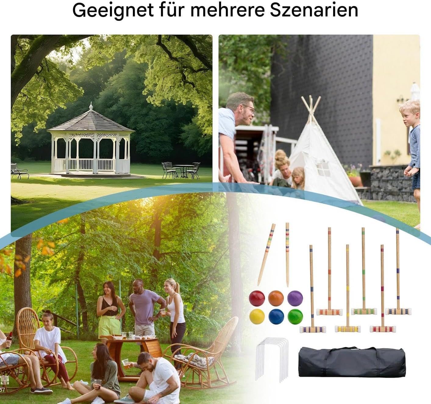 Gioco divertente: immergiti nella gioia di questo gioco senza tempo e umoristico diretto da 2 a 6 giocatori; scopri senza sforzo una varietà di tecniche di gioco e crea ricordi indimenticabili di famiglia Uso utilizzabile: il nostro set da croquet è realizzato in robusto materiale di legno per un uso prolungato, che promette una perfetta durata ed è resistente a rotture o deformazioni Comodo da trasportare: questo set da croquet che non occupa troppo spazio ed è comodo da trasportare con una borsetta, perfetto per l'intrattenimento all'aperto, facile da trasportare ovunque ti porti l'avventura Un set completo: con 6 palle, 6 racchette, 2 aste e 6 porte, raccogli 6 giocatori contemporaneamente e goditi più intrattenimento, tutto in un set compatto e portatile Adozione diffusa: porta gioia in ambienti esterni come prati, cortili e parchi, perfetto per vari eventi e raduni per garantire divertimento a tutti i soggetti coinvolti