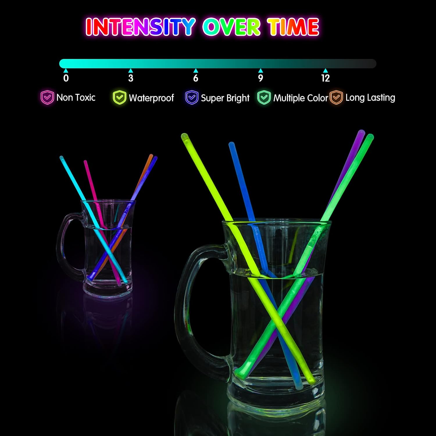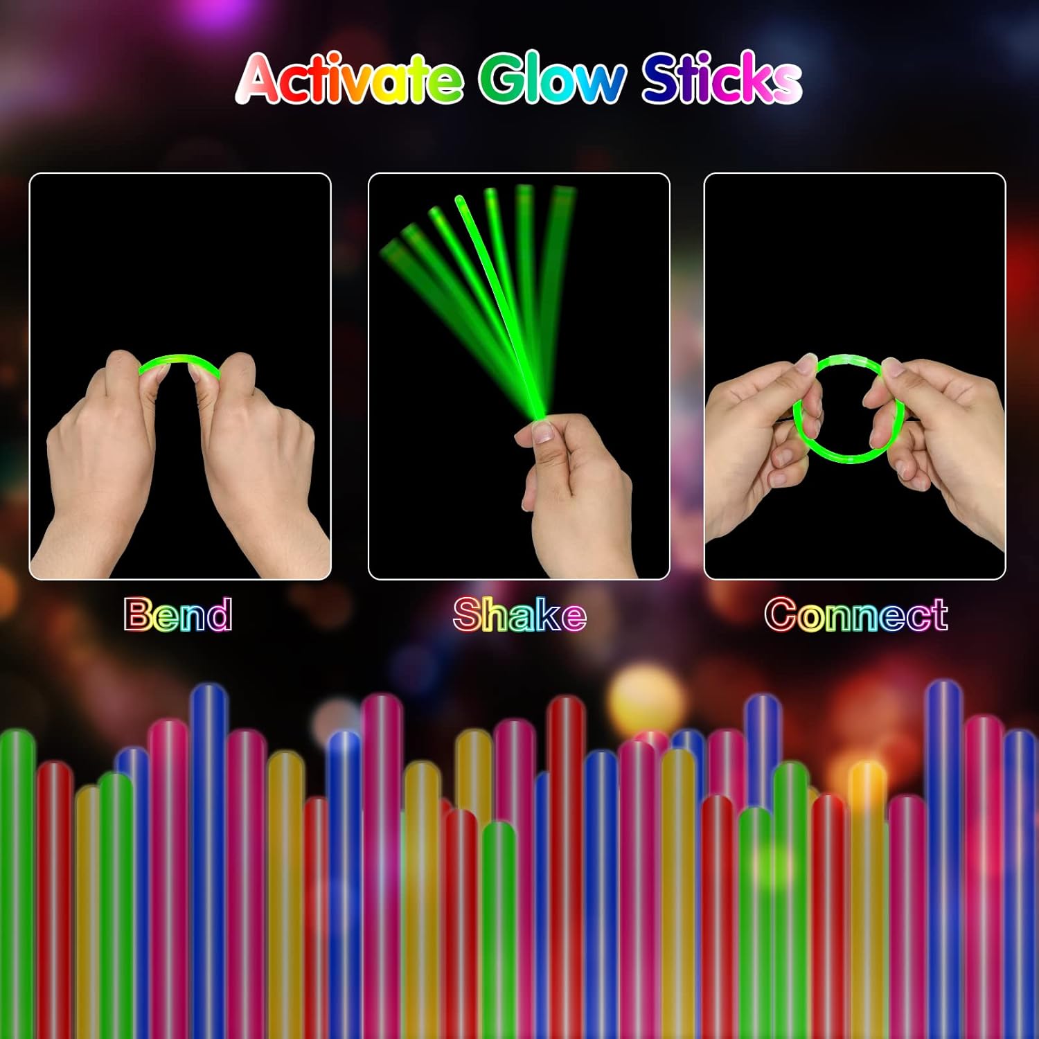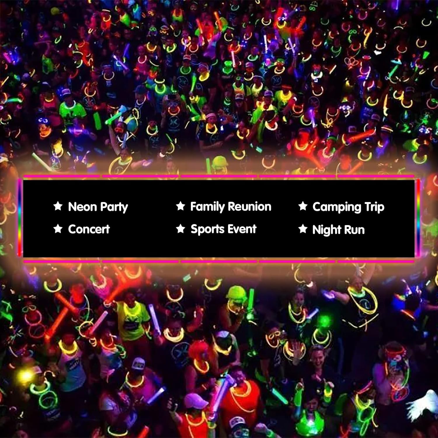 Pacchetto definitivo per il divertimento notturno: questo pacchetto contiene 100 bastoncini luminosi e 100 connettori. Puoi realizzare braccialetti e collane con bastoncini luminosi o incollarli ai vestiti per creare una danza con bastoncini luminosi. Lascia risplendere la tua creatività e rendi la tua festa davvero unica! 6 COLORI VIBRANTI PER OGNI UMORE: Scegli tra un arcobaleno di colori: rosso, arancione, giallo, verde, blu e viola. Mescola e abbina per creare l'atmosfera luminosa perfetta per la tua festa o occasione speciale. Che il divertimento abbia inizio! Accessori per feste al neon di lunga durata: i nostri set per feste con bastoncini luminosi sono semplicissimi da attivare: basta afferrarli e agitarli! Goditi un bagliore luminoso e fluorescente che dura 8-12 ore, rendendo ogni momento indimenticabile. Se le bacchette luminose non sono attivate, puoi conservarle abbastanza a lungo fino alla festa successiva. Giocattoli luminosi sicuri: realizzati con materiali di alta qualità, impermeabili, non tossici e non luminosi, i nostri bastoncini luminosi sono progettati per un divertimento senza preoccupazioni. Divertenti accessori per feste: bastoncini luminosi adatti per feste al neon, accessori per feste a luce nera, compleanni, feste in discoteca, concerti, spettacoli pirotecnici, premi per le classi scolastiche, carnevali. Che si tratti di una festa di compleanno, di una riunione di famiglia, di un viaggio in campeggio o di Pasqua, Halloween, Natale, Capodanno, i nostri bastoncini luminosi aggiungono un tocco divertente e colorato a qualsiasi evento. I bambini e gli adulti li adoreranno!