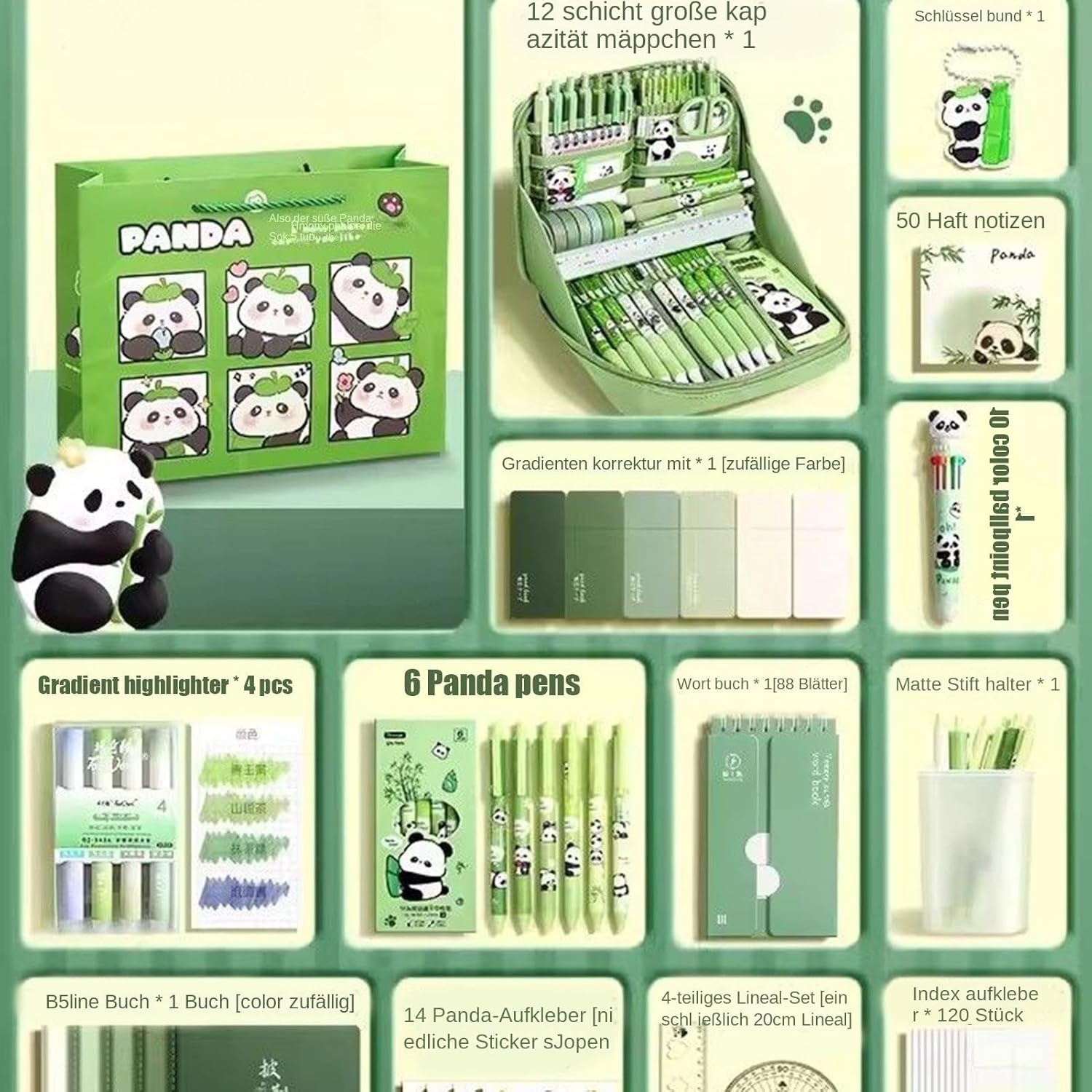 Divertimento da creare: divertenti adesivi con motivo panda trasformano i materiali scolastici in opere d'arte personali e promuovono l'espressione artistica giocosa Design funzionale: meccanismo ergonomico con cerniera con elementi in cotone resistente. L'astuccio a rete offre un accesso rapido e una visione costante, mantenendo un equilibrio perfetto tra praticità d'uso e attrattiva visiva. Set di scrittura multiuso: il set di forniture scolastiche Panda offre 12 pratici utensili come simpatici penne panda, nastri correttivi antiscivolo e accessori durevoli. Soluzioni organizzative elaborate supportano la vita scolastica e i progetti creativi, ideali per compiti, schizzi o organizzazioni da scrivania. Design funzionale: ideali per appunti, diari e progetti creativi. - Le penne panda con flusso d'inchiostro uniforme, evidenziatori e matite colorate garantiscono un lavoro produttivo e divertente a scuola, in ufficio e a casa Messaggio di felicità portatile: il set regalo moderno combina leggerezza infantile con estetica adulta. Il design speciale del packaging rende qualsiasi trasferimento all'evento festivo. Adatto sia per le ragazze che per le ragazze, sempre adatto alla stagione