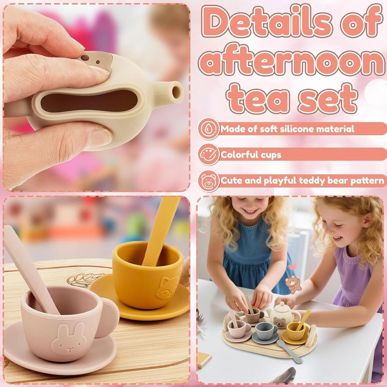 Gioco Sociale Coinvolgente: Sviluppa creatività situazionale con scenari di tè simulati, migliorando capacità sociali e coordinazione in modo spontaneo durante il gioco interattivo fra bambini Regalo Piacevole: Ideale per creare amicizie, si adatta versatile a diversi ambienti. Abilita esperienze significative di gioco simbolico che incoraggiano interazioni tra bambini in numerose occasioni memorabili. Prestazioni Durevoli: Silicone flessibile garantisce resistenza all'usura e capacità di recupero deformazioni, supporta la durata quotidiana con superfici lisce per facile pulizia, migliorando l'esperienza d'uso in modo naturale Apprendimento Giocoso: Stimola lo sviluppo cognitivo ed emotivo dei bambini dai tre ai sei anni attraverso il gioco di gruppo, promuovendo naturalmente empatia, collaborazione e momenti familiari preziosi Gioco immaginativo stimolante: La combinazione della teiera realistica, sottotazze creativi e accessori animali fantastici accende l'entusiasmo nel gioco simbolico, rendendo ogni momento del tè piacevole e ricco di scoperte per i piccoli.