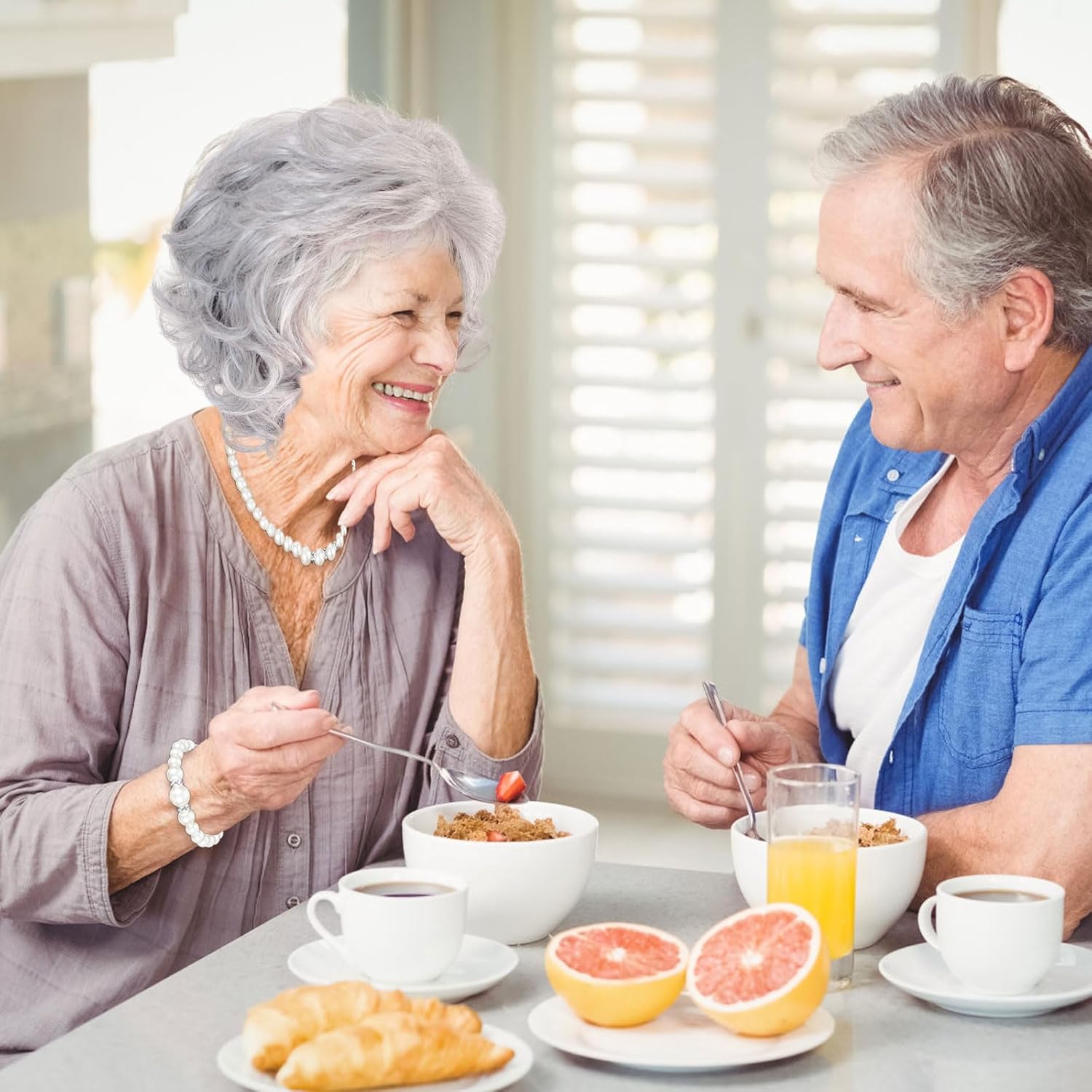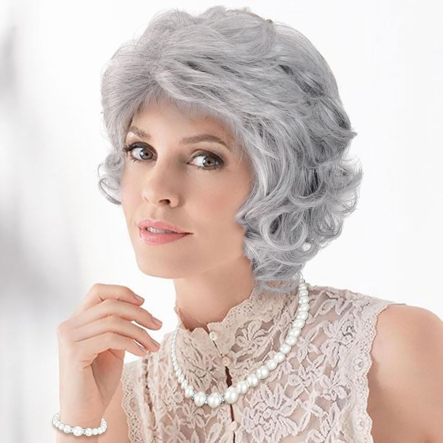 Set per travestimento da vecchia signora, set di parrucca grigia con parrucca da nonna, collana di perle finte, braccialetto, orecchini, cuffia per parrucca per Halloween, Giornata mondiale