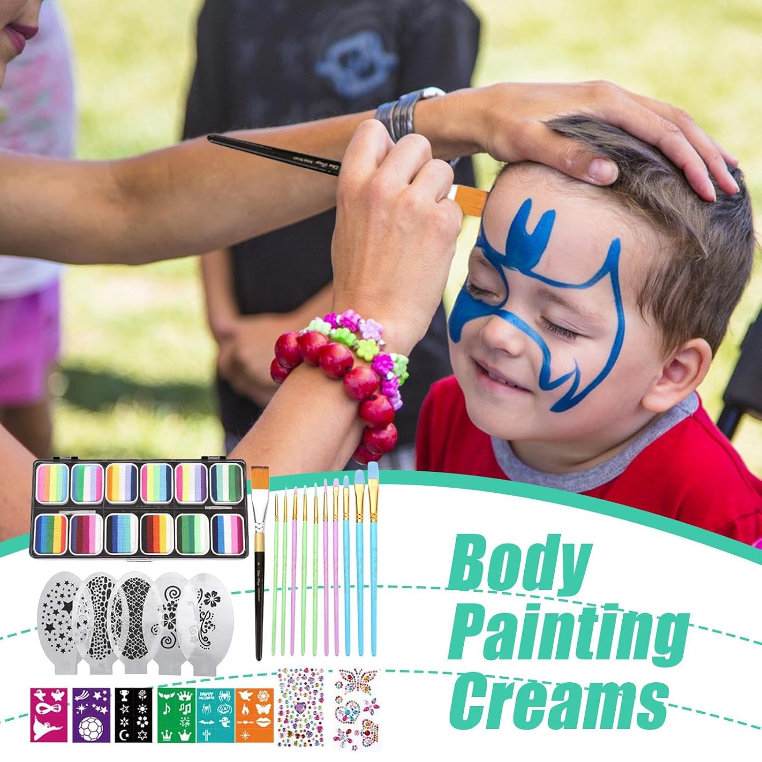Adatto per feste a tema: aggiunge stile con temi per Halloween, spettacoli teatrali e festival. Ideale per una varietà di eventi con colori del viso versatili. Comfort e facilità di pulizia: qualità comprovata per una sensazione delicata sulla pelle dei bambini, offre un elevato comfort e semplifica la pulizia grazie alla facile solubilità in acqua Tonalità altamente pigmentate: crea look impressionanti con sfumature brillanti e copertura completa per trucchi unici per costumi Set versatile per il trucco: questo kit completo per la pittura del viso contiene pennelli, stencil e strass per una varietà di applicazioni. Il design adatto ai principianti e il pacchetto pronto all'uso semplificano la creazione di design unici durante festival o feste. Versatilità artistica: la pittura liscia per il viso si adatta naturalmente a qualsiasi movimento del viso. La formula solubile in acqua offre un'eccellente spalmabilità e una finitura affidabile e resistente alle crepe durante l'uso per opere d'arte creative.