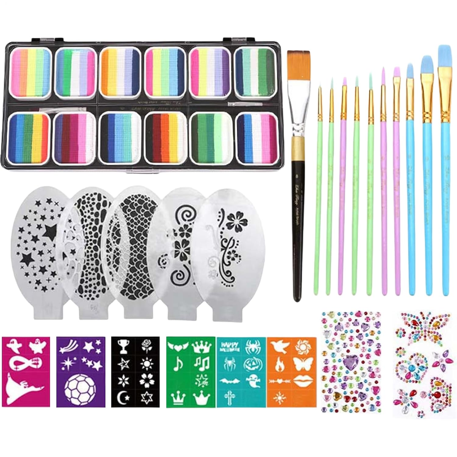 Set multi-evento creativo: promuove il fascino artistico in festival, spettacoli ed eventi di gruppo come Halloween. Consente un utilizzo flessibile per diversi tipi di eventi. Colori delicati: pittura per il viso delicata e delicata sulla pelle, sviluppata appositamente per i bambini, che è particolarmente delicata sulla pelle sensibile e può essere completamente rimossa con acqua dopo l'uso Intensità del colore brillante: fornisce colori altamente pigmentati, brillanti e brillanti per effetti accattivanti in tutte le idee di trucco Soluzione completa per l'arte del viso: set completo con strumenti come pennelli, stencil e strass per varie occasioni. Il design pronto all'uso semplifica le attività creative fin dal primo utilizzo. Colore affidabile: sperimenta la consistenza cremosa e l'elevata spalmabilità con la vernice per il viso idrosolubile. Si flette naturalmente con le espressioni facciali e garantisce una finitura resistente alle crepe per progetti creativi di lunga durata.