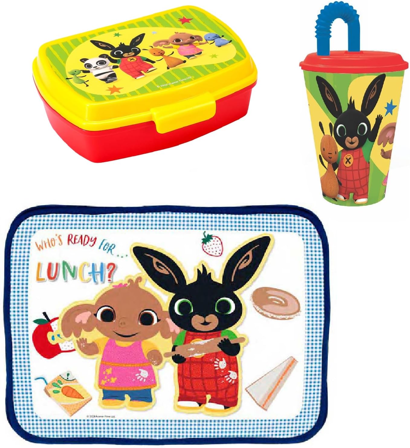 Set Pranzo bambini BING riutilizzabile composto da BOX MERENDA in plastica 5,5cm x 17cm x 12cm BICCHIERE 260ml di capienza TOVAGLIETTA 30 x 40cm. Nota Bene: l'immagine della tovaglietta potrebbe variare rispetto alla foto