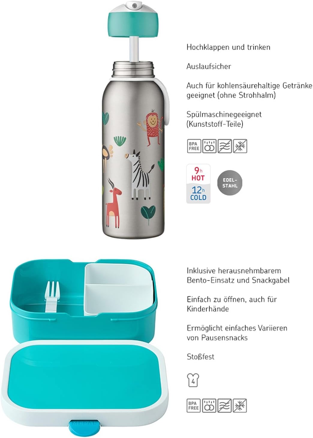 BOTTIGLIA ISOLATA: resta fresco nel parco giochi con questa bottiglia termica apribile di Mepal! La borraccia in acciaio inossidabile è ideale per i bambini per portare le bevande con sé a scuola. 9 ORE CALDE E 12 ORE FREDDE: La borraccia per bambini è realizzata in acciaio inossidabile isolato a doppia parete e mantiene le bevande calde fino a 9 ore e fredde fino a 12 ore ADATTA PER BEVANDE GASSATE: La bottiglia isolata è adatta anche per bevande gassate. Per le bevande gassate si consiglia di utilizzare la bottiglia senza cannuccia. BENTO LUNCHBOX: Con questo portapranzo la varietà diventa un gioco da ragazzi. Può contenere facilmente 4 panini nella scatola o usarlo per diversi tipi di cibo INCLUSA FORCHETTINA PICCOLA: Il contenitore per il pranzo scolastico contiene una piccola forchetta di plastica. Questo rende il portapranzo perfetto per un piccolo spuntino a base di frutta o verdura. Deliziosamente sano! ROBUSTO E LAVABILE IN LAVASTOVIGLIE: il contenitore per il pranzo scolastico è robusto e resiste molto. Buono per mamma e papà: l'intero contenitore per il pranzo bento può essere lavato in lavastoviglie