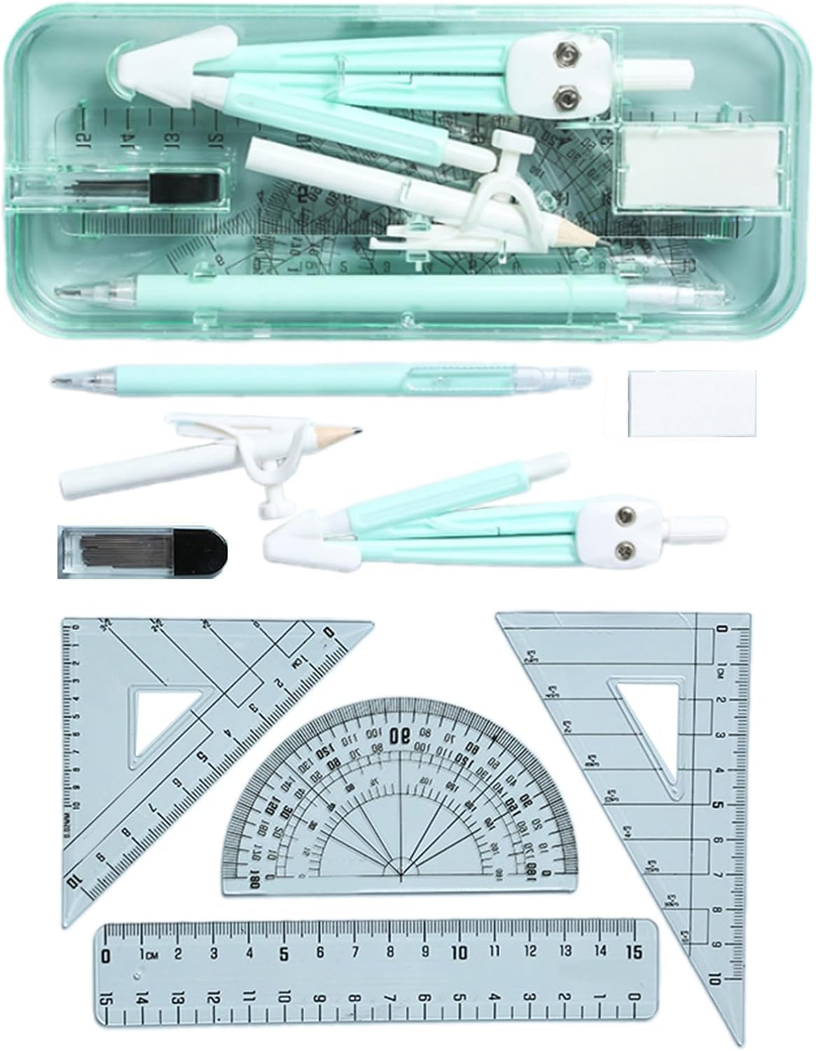 Perfetto per compiti in classe, progetti architettonici o esigenze di redazione, garantendo precisione in ambiente educativo e professionale per studenti, artisti, ingegneri e designer che cercano uno strumento multifunzionale per disegni tecnici, progetti scolastici o schizzi creativi Il set include bussole, righelli, goniometri e custodia, con bordi arrotondati per una portabilità organizzata Ogni strumento vanta marcature di misurazione incise per la precisione, mentre la custodia mantiene l'essenziale al sicuro durante il trasporto o lo stoccaggio Questo set di 9 compassi geometrici offre un disegno preciso con strumento, combinando la durata per un uso senza sforzo in aule o studi professionali