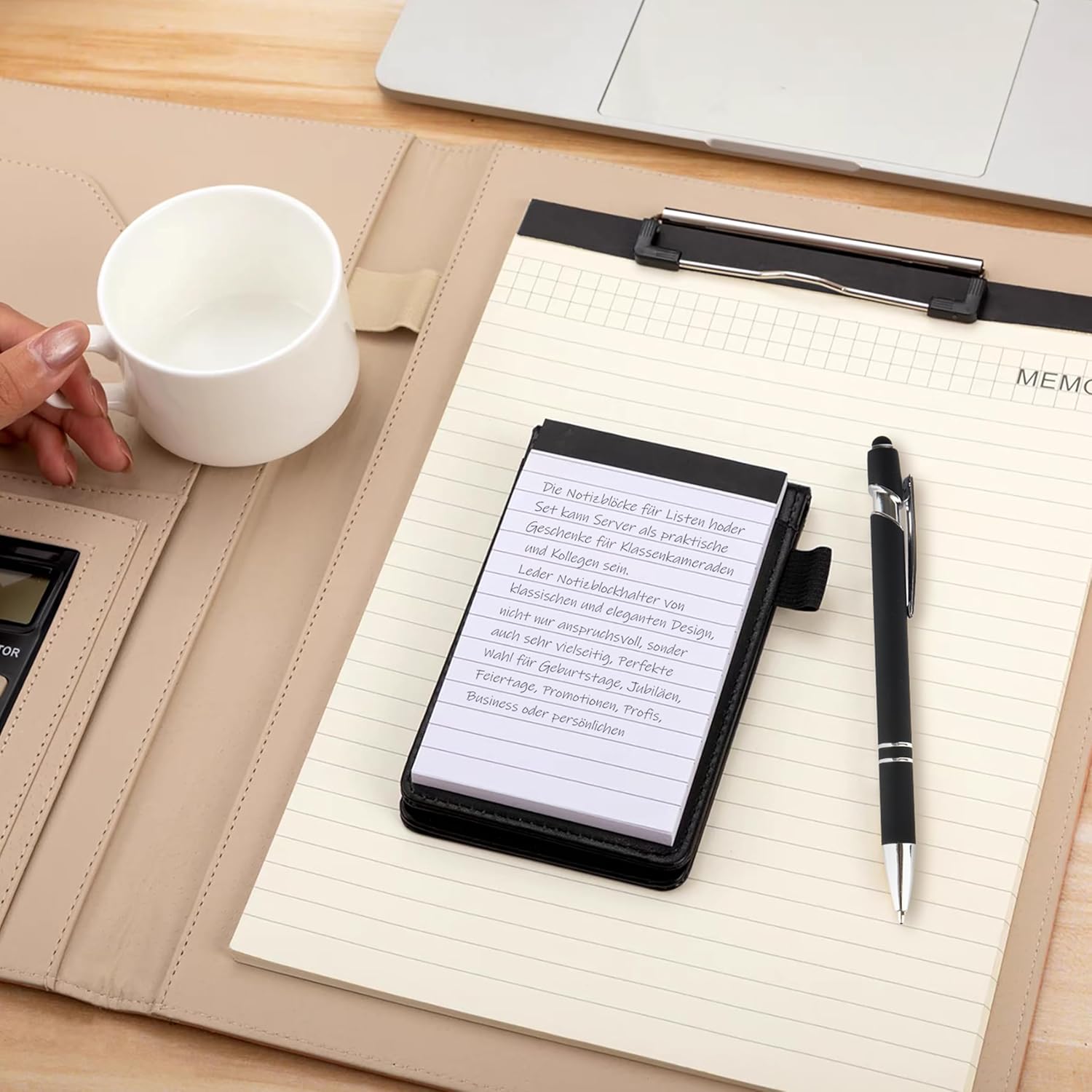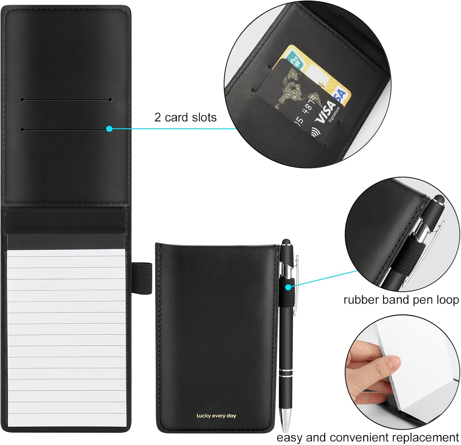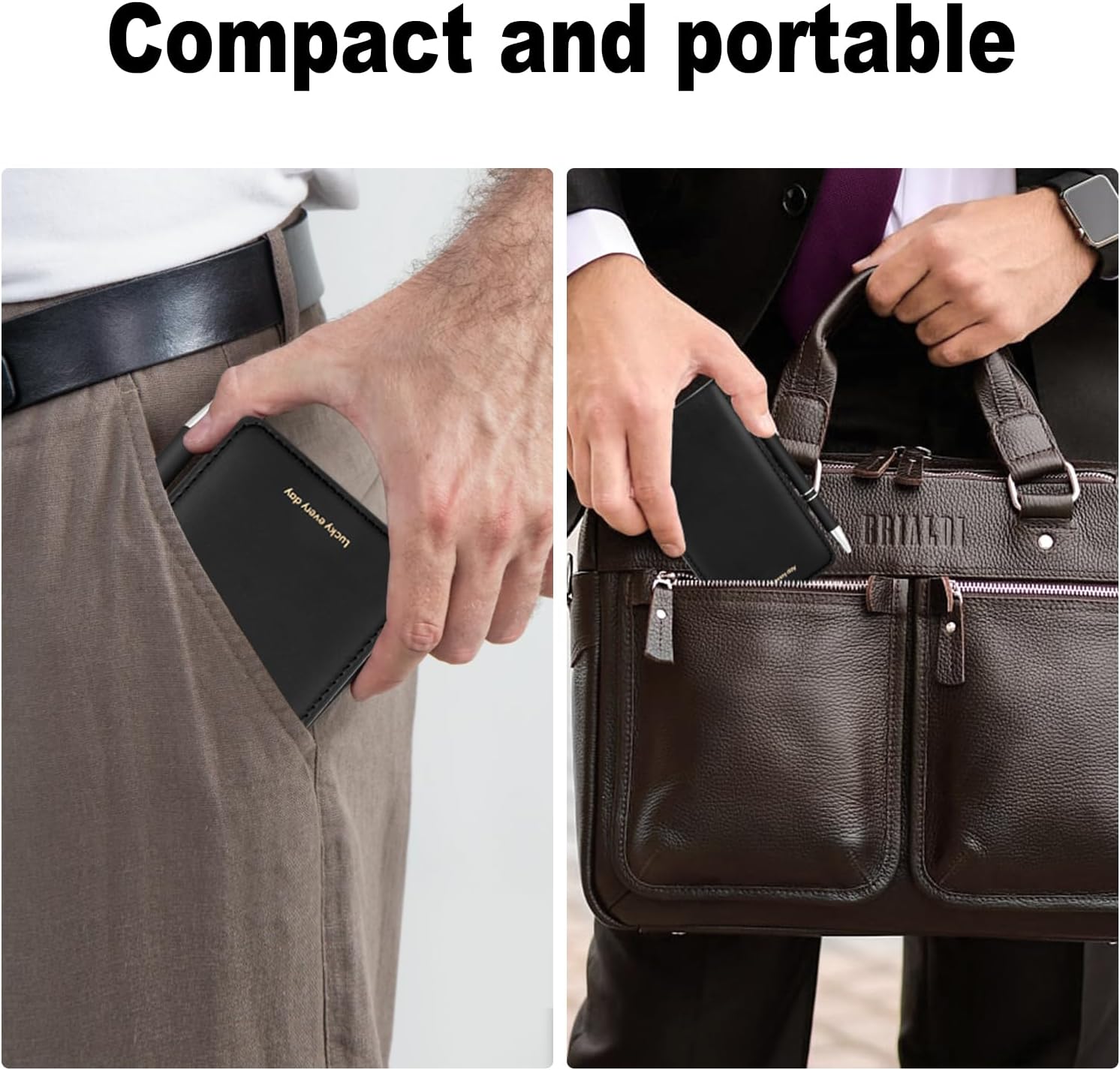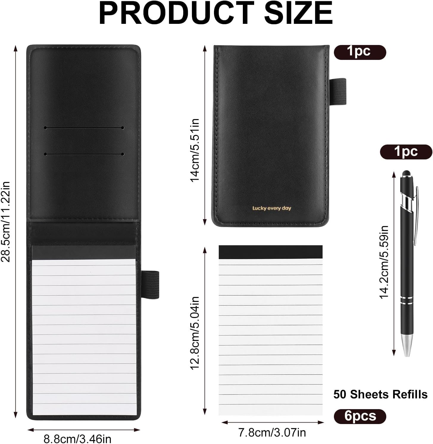 Materiali di qualità: questo piccolo taccuino in pelle PU è impermeabile, resistente e morbido al tatto. Le pagine del blocco note A7 sono realizzate con carta di qualità, offrendo una scrittura fluida senza sbavature o trasparenze, per un comfort ottimale. Design pratico: questo piccolo taccuino ha due slot per riporre biglietti da visita, carte bancarie o biglietti. Il suo blocco note è dotato di un portapenne, ideale per tenere una penna in metallo a portata di mano e annotare le tue idee in qualsiasi momento. Design compatto: questo mini notebook leggero e compatto si inserisce facilmente in una tasca o in una borsa. Perfetto per riunioni, studi, viaggi o per la vita di tutti i giorni, questo quaderno per appunti ti consente di catturare tutte le tue idee essenziali. Contenuto della confezione: 1 mini blocco note tascabile A7 (50 pagine, 14 x 8,8 cm), 6 mini blocchi note di ricambio (300 pagine, 12,8 x 7,8 cm) e 1 penna in metallo (14,2 cm). Il piccolo block notes è dotato di un anello elastico per evitare la perdita della penna in metallo. Uso versatile: ideale per riunioni, studi, diari di viaggio, quaderni di liste di cose da fare, promemoria o ufficio, questo taccuino A7 è un elemento essenziale quotidiano. Il suo design elegante rende questo mini notizblock un regalo perfetto per i tuoi colleghi, amici o persone care.