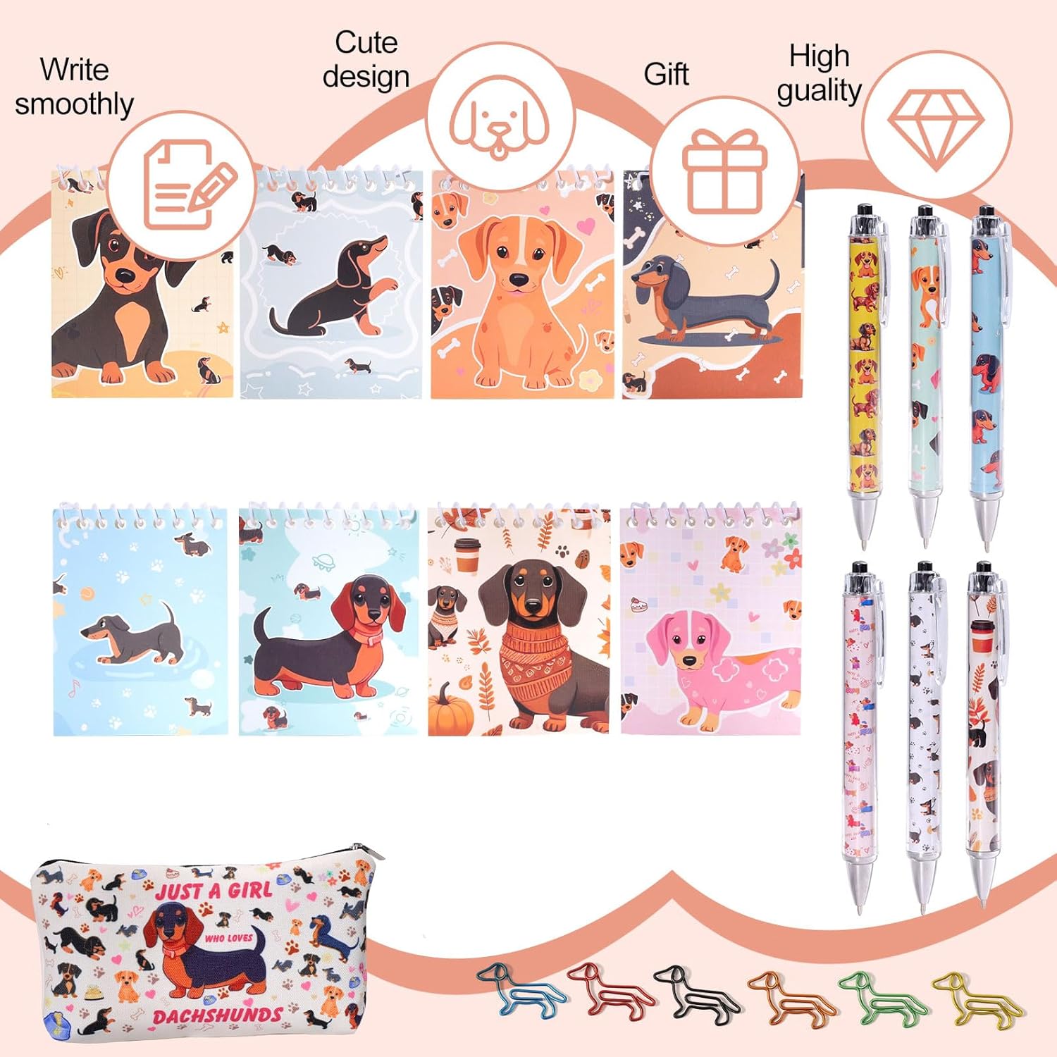 Regali per bassotti per ragazze: questo set contiene 8 quaderni per bassotti, 6 penne a sfera per bassotti, 1 astuccio per bassotti e 6 graffette per bassotti: ideali per chi ama i bassotti. DISEGNI DI BASSOTTO CARINI E DIVERTENTI: tutti i prodotti presentano graziosi disegni di bassotti, perfetti per i fan dei bassotti e gli amanti dei cani. MATERIALI DI ALTA QUALITÀ E DURATA: il robusto astuccio in tela con bassotto protegge i tuoi materiali di scrittura. I quaderni e le penne a sfera del bassotto sono particolarmente stabili e pratici. Regali perfetti per bassotti per donne, uomini e bambini: questo set è un regalo ideale per compleanni, Natale o come sorpresa per gli amanti dei bassotti di tutte le età. Pratici e compatti per l'uso quotidiano: i quaderni bassotto (8 x 10 cm) e l'astuccio bassotto (11 x 18 cm) sono perfetti per l'uso quotidiano e sono facili da riporre.