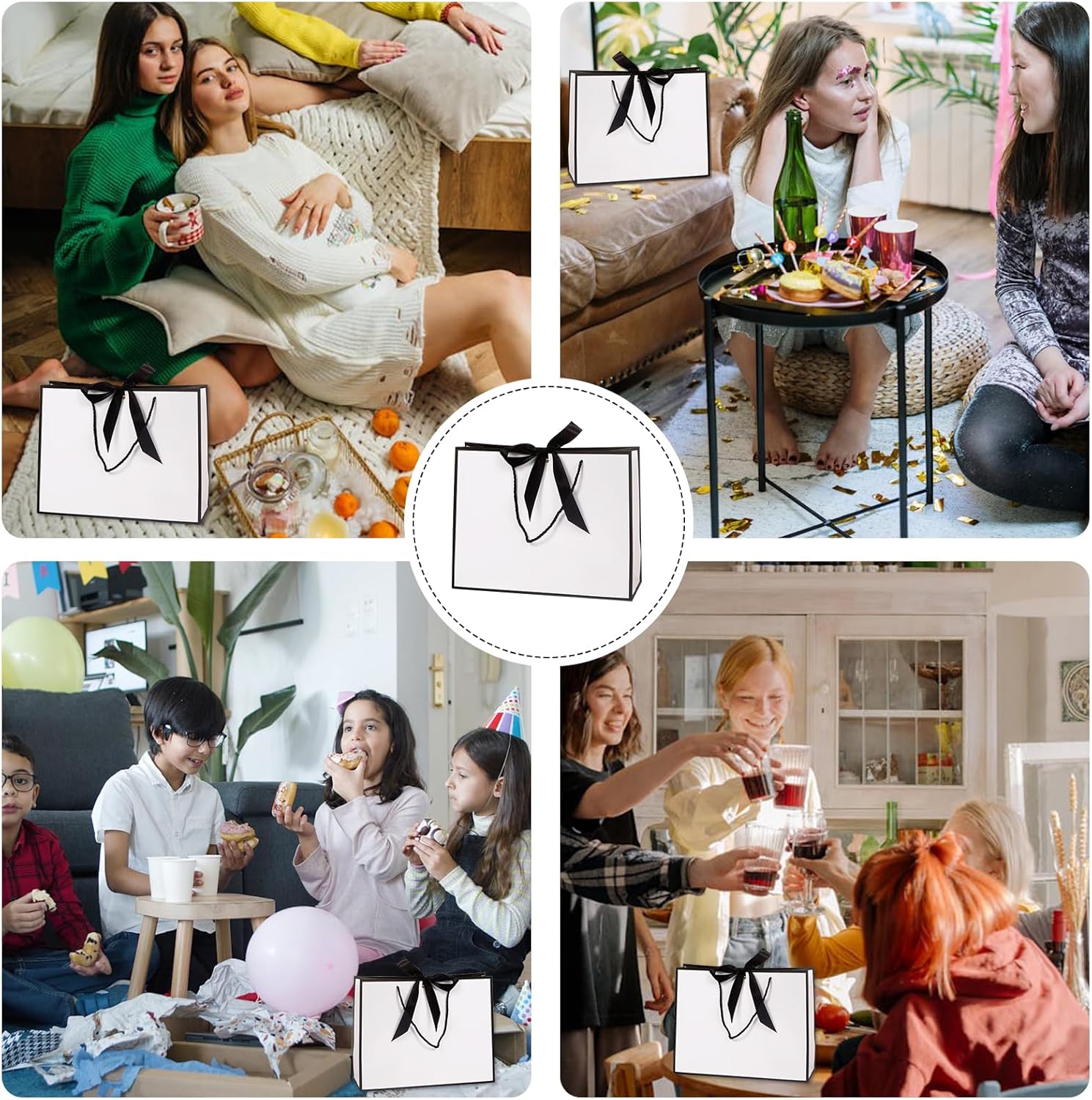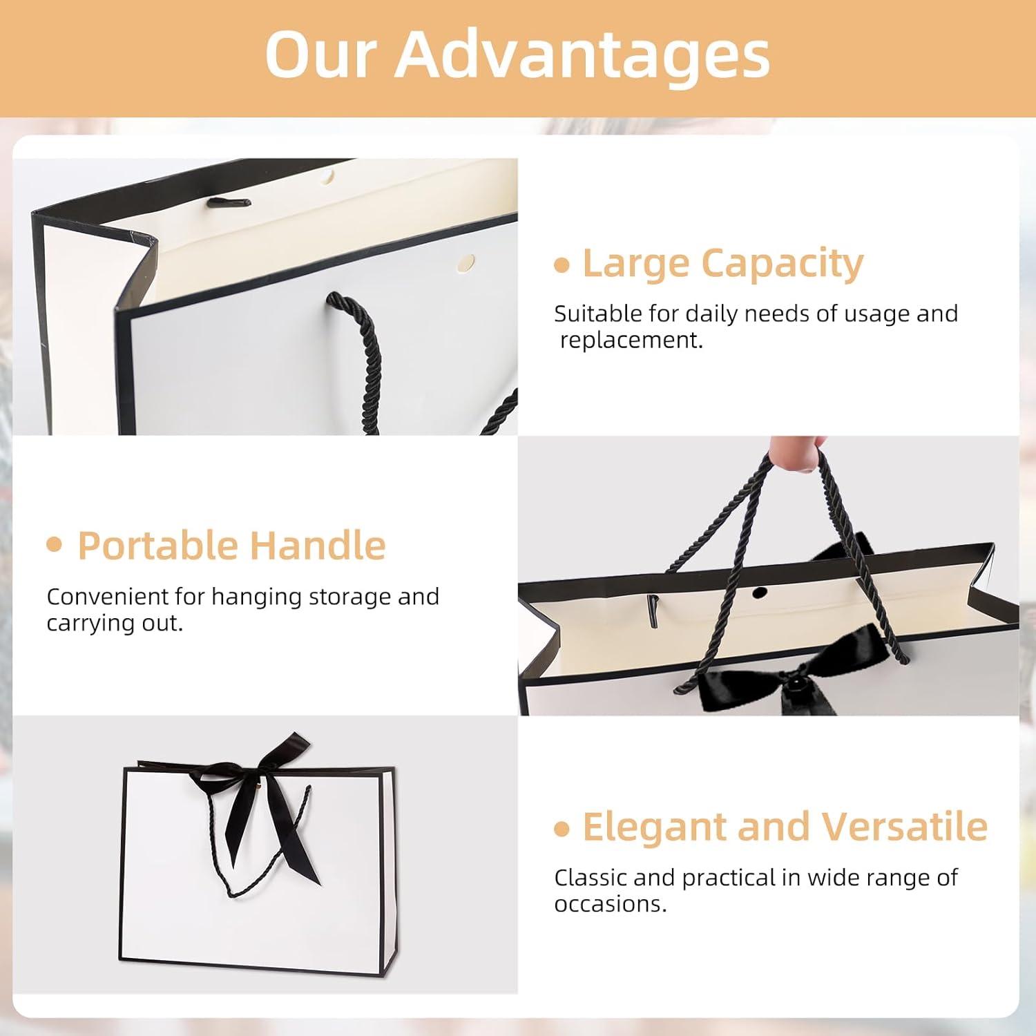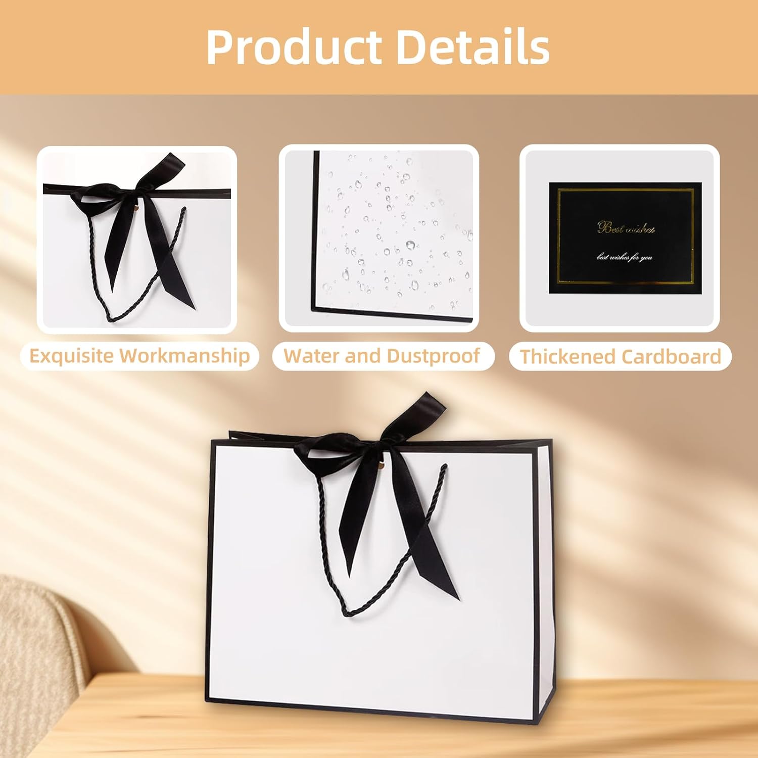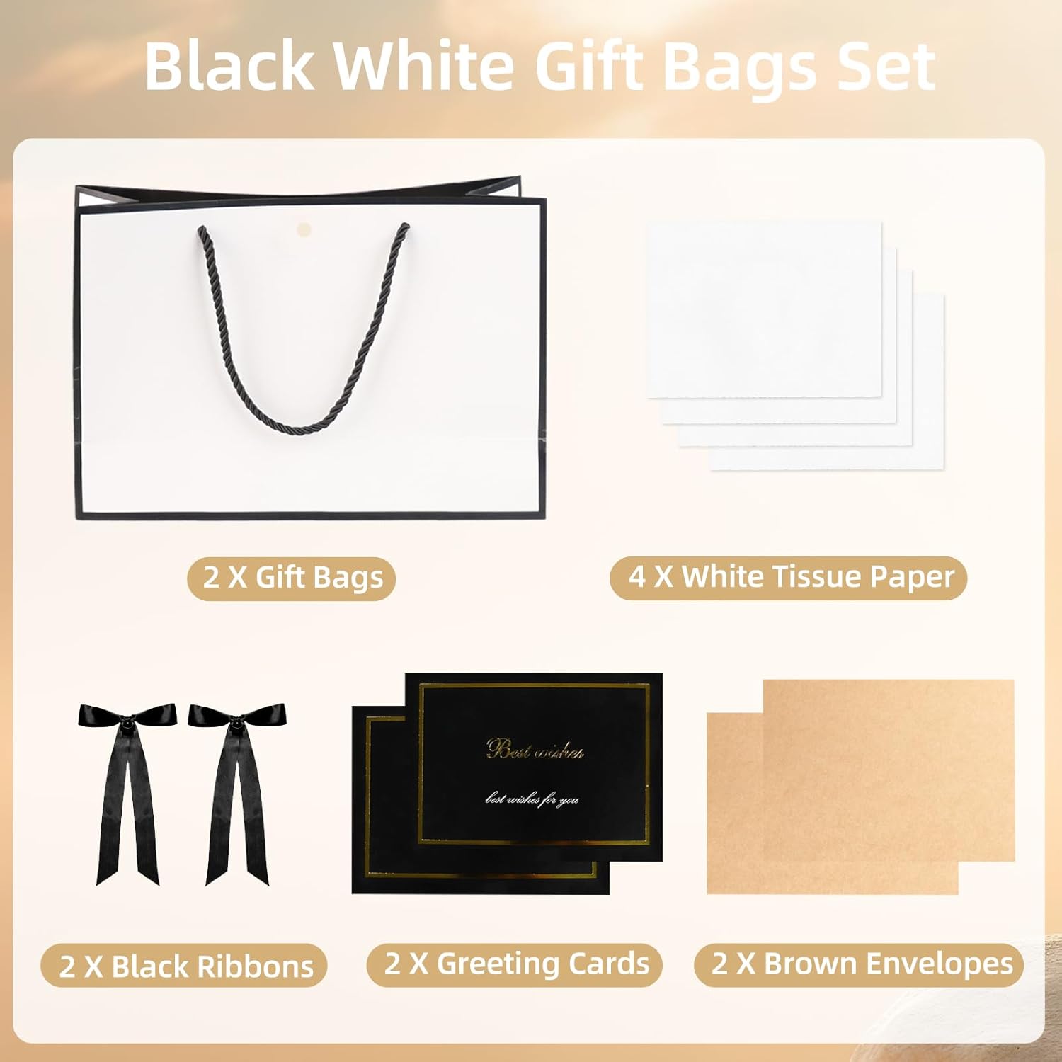 【Set squisito】 Riceverai 2 set di sacchetti regalo in bianco e nero, inclusi 2 sacchetti per bomboniere, 2 nastri neri, 2 biglietti di auguri, 2 buste marroni e 4 carta velina bianca. La borsa regalo Black White è elegante e sofisticata, solitamente utilizzata per trasportare vari festival o regali per occasioni di lavoro. 【Design elegante】Il sacchetto regalo Nero Bianco utilizza la tecnologia di stampa a caldo e goffratura per dare al tuo regalo un senso di nobiltà ed eleganza. Puoi scrivere gli auguri a parenti o amici sui biglietti di auguri in bianco e nero del sacchetto regalo per rendere questo regalo ancora più prezioso. 【Creatività fai da te】Le decorazioni nel sacchetto regalo in bianco e nero sono tutte indipendenti. Puoi decorare la confezione in base alle tue preferenze, questo rende la confezione regalo in bianco e nero unica e personalizzata, ma riflette anche il tuo rispetto e la tua attenzione verso il destinatario. 【Borse di medie dimensioni】 La dimensione della borsa regalo in bianco e nero è 28 × 21 × 17 cm (11 × 8 × 6,7 pollici), adatta per regali di piccole e medie dimensioni. La borsa regalo Nero Bianco presenta una base bianca trasparente con eleganti dettagli in nastro nero sui bordi. 【Cartone spesso】 La borsa regalo Nero Bianco è realizzata in cartone spesso di alta qualità, ben sagomato e non facile da danneggiare. La superficie del sacchetto regalo nero bianco è liscia e presenta determinate proprietà impermeabili, che possono proteggere efficacemente i regali dall'ambiente esterno.