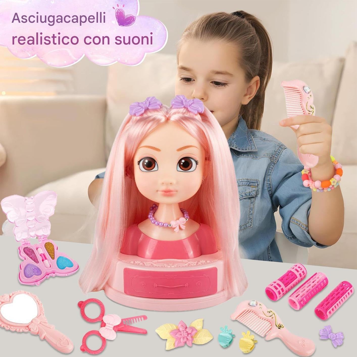 Esperienza Gioco Creativo: Stimola la creatività infantile attraverso attività di parrucchiera, esplorando acconciature e coinvolgendo le bambine in scenari di gioco di ruolo del salone di bellezza, sviluppando immaginazione divertendosi Divertimento Styling: Capelli ricci biondi pettinabili e attorcigliabili ispirano creatività, con opzioni versatili di gioco beauty salon per più intrattenimento e scoperta Regalo Bambini: Set salone parrucchiere che ispira l'immaginazione consentendo di praticare styling capelli e makeup, ideale per compleanni, feste di Natale o occasioni speciali, migliorando il gioco di finzione con accessori colorati e attività creative stimolanti. Bordi Arrotondati: Phon con superfici lisce e bordi arrotondati in ABS sicuro, elimina odori sgradevoli garantendo comfort durante il gioco per bambini. (: 196) : 6"superfici lisce e bordi arrotondati" Gioco Beauty Salon Ispiratore: Completo di testina per acconciature, piastra e fermagli decorativi, incoraggia l'esplorazione di acconciature e attività di design per giovani stiliste