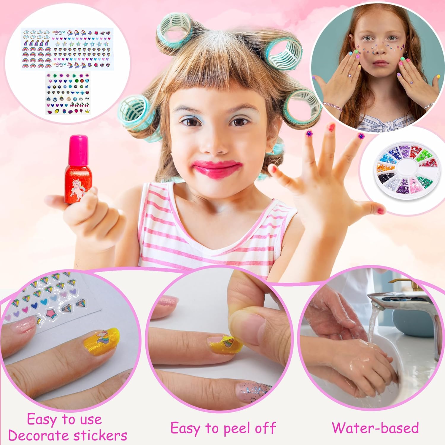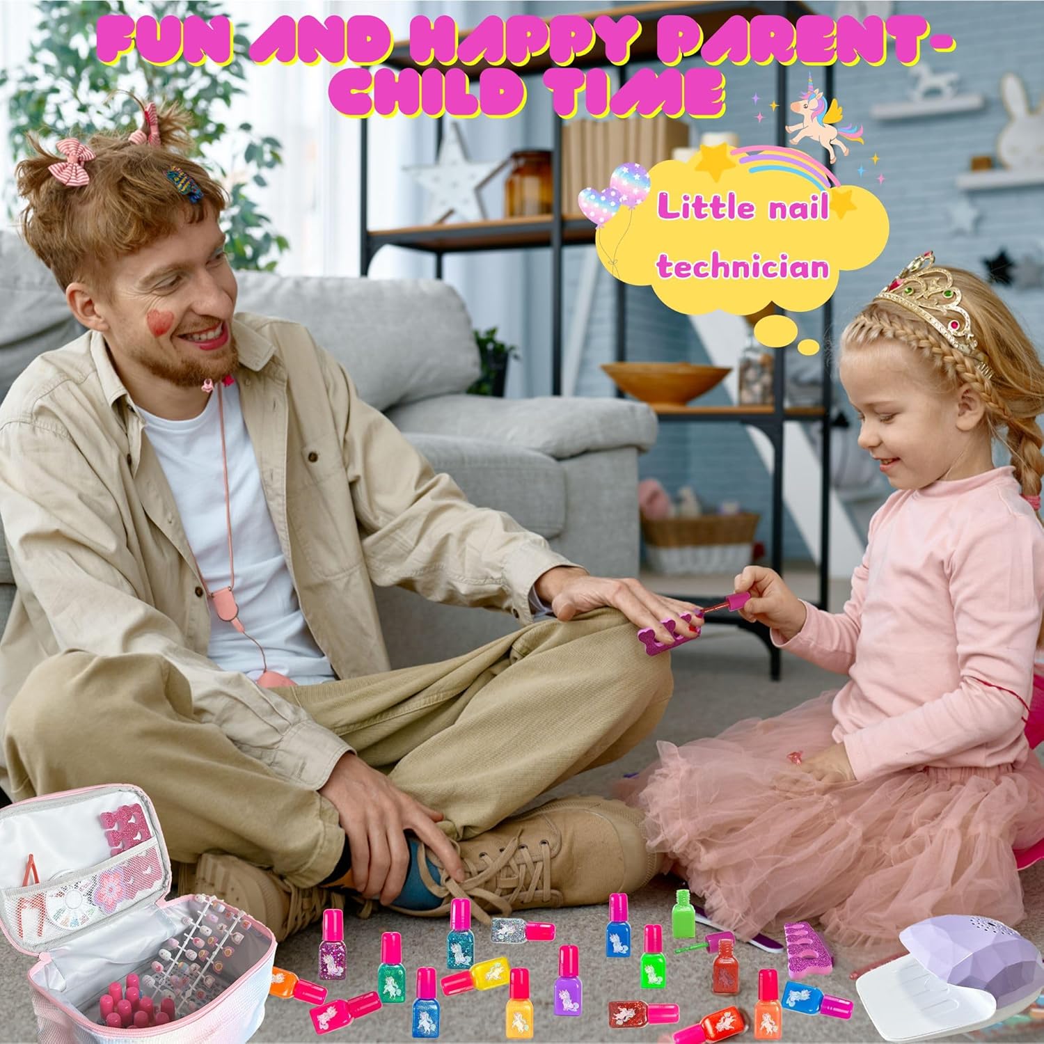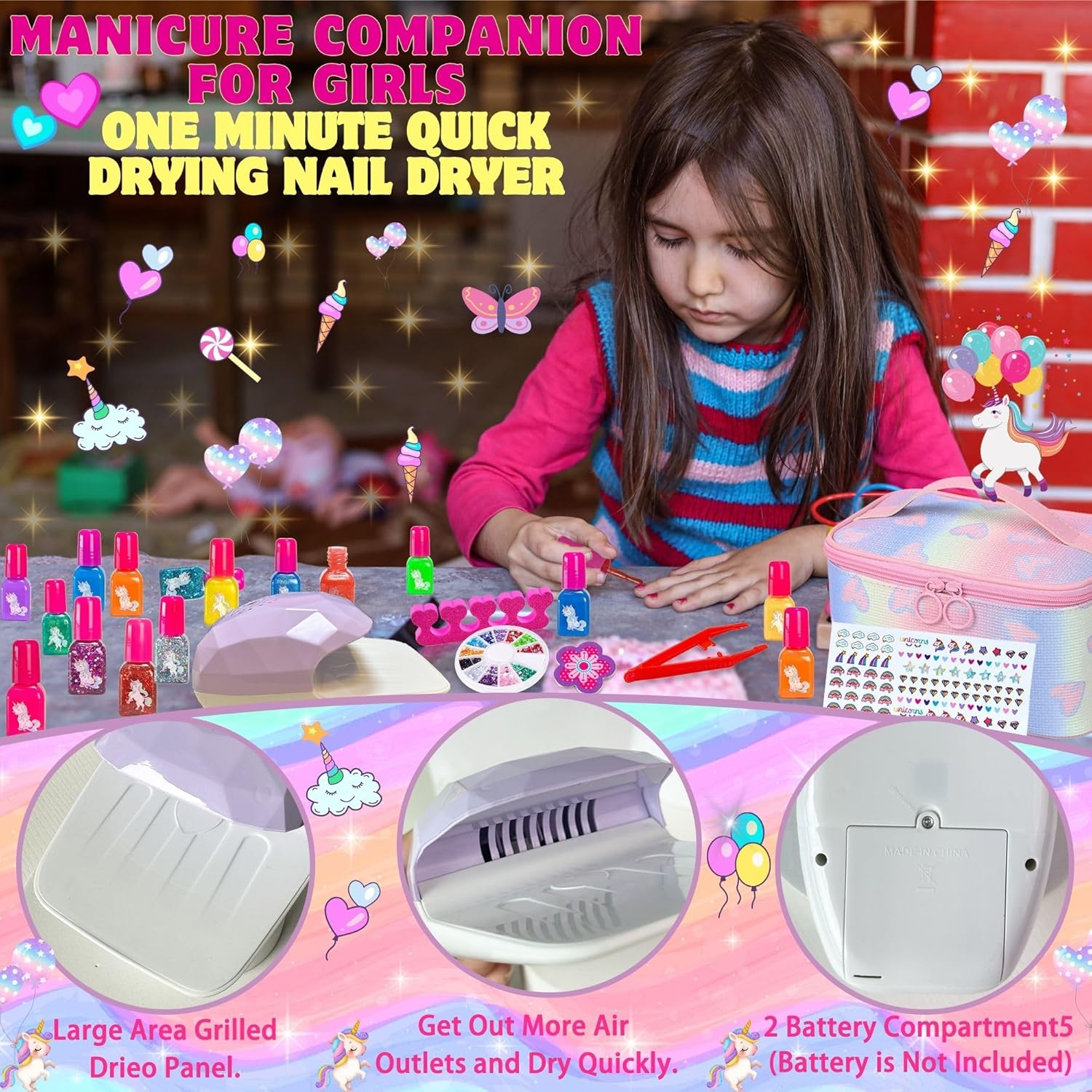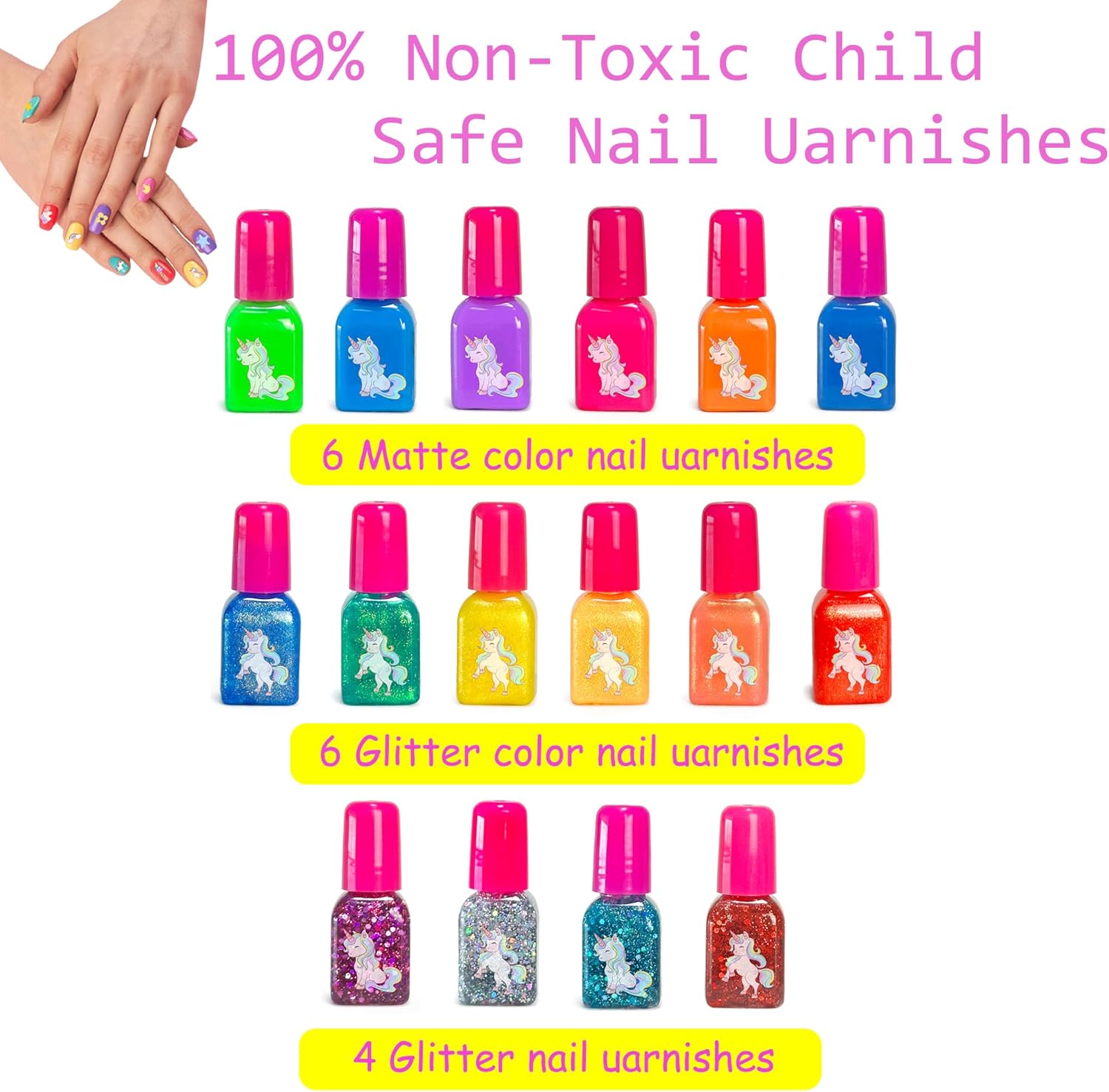 【Set di smalti per ragazze per bambini】 Questo set di giocattoli per nail art per ragazze include asciuga unghie (batterie non incluse), smalto per unghie * 16, lima per unghie * 1, separatore per dita dei piedi * 2, pinzette * 1, vassoio per nail art con strass colorati * 1, adesivi colorati per unghie per bambini * 2, adesivi per nail art * 2 e borsa per il trucco * 1. Questo fantastico set per nail art contiene tutto il necessario per una manicure straordinaria. 【Asciuga unghie sicuro e conveniente】 Posiziona le dita dipinte sul cuscinetto per asciuga unghie sotto l'asciugacapelli e premi verso il basso per asciugarle rapidamente. Questo asciuga unghie si asciuga con un ventilatore, quindi non devi preoccuparti dei raggi UV, delle ustioni, del dolore o delle mani abbronzate. Il pratico e sicuro asciuga unghie protegge la salute e la sicurezza della pelle e delle unghie delle principesse. 【Simpatici adesivi per unghie dipinti】 Gli adesivi per unghie sono realizzati con un effetto artigianale unico, che fornisce un effetto 3D accentuato con colori colorati e vibranti per migliorare ulteriormente l'effetto visivo delle piccole unghie. Pieno di adesivi per unghie dipinti carini e divertenti che non necessitano di colla, basta premere per farli attaccare. 【Smalto per unghie atossico, impermeabile e rimovibile】 Il nostro smalto per unghie è realizzato con una formula a base d'acqua non tossica e non irritante appositamente progettata per i bambini. Il nostro smalto per unghie non necessita di solvente per unghie per essere rimosso, ma può essere semplicemente rimosso dall'unghia. Il tuo bambino non deve essere esposto ai fumi nocivi e alle sostanze chimiche presenti nei tradizionali solventi per smalto. 【Regalo per ragazze dai 3 ai 12 anni】 Questo è un set regalo perfetto per le principesse, allena le abilità artigianali di tuo figlio, coltiva il senso di bellezza delle ragazze e libera la loro immaginazione e creatività. Perfetto per regali di compleanno, regali di Natale per ragazze di 3, 4, 5, 6, 7, 8, 9, 10, 11, 12 anni, anche una buona scelta per i giocattoli per ragazze!