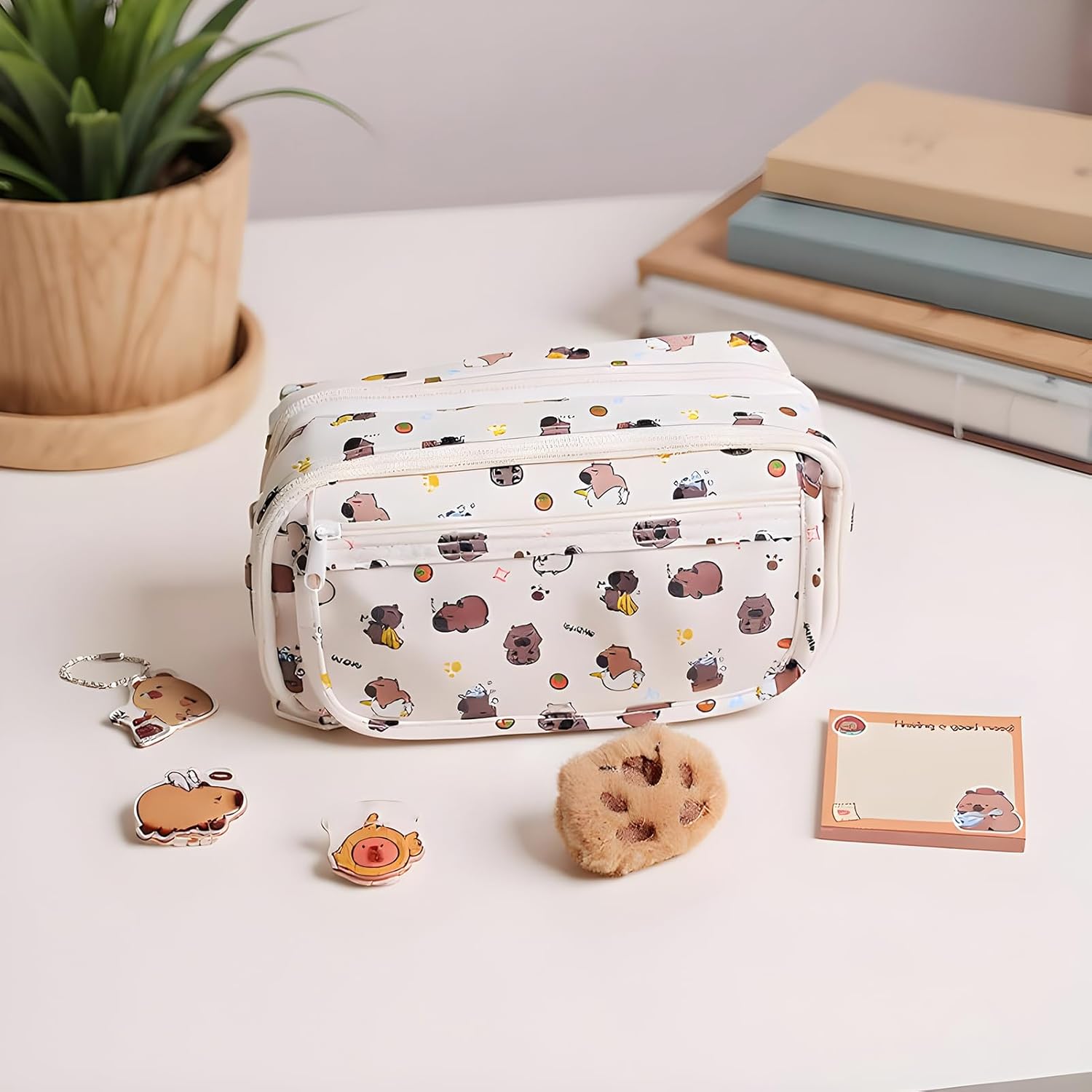 Design Efficiente: ad accesso facilitato con apertura spaziosa per prelievo rapido, migliora l'efficacia nel riordinare articoli personali con praticità d'uso Organizzatore Multiuso: Soluzione pratica e accessorio raffinato, questo astuccio capibara offre un design elegante, per organizzare oggetti durante viaggi o routine giornaliere mantenendo l'ordine essenziale Design Appendibile: Combina manico superiore, trasporto pratico e struttura appendibile per scrivanie, zaini e altri spazi, offrendo adattabilità affidabile per diverse esigenze quotidiane Tessuto Flessibile Innovativo: Enfasi su materiale anti-graffio e morbido al , assicura flessibilità e funzionalità duratura senza compromettere lo stile Ottimizzazione spazio intelligente: Dotato di tasche a rete e porte penne, gli scomparti multilivello garantiscono una conservazione organizzata mantenendo la cancelleria ordinata per un accesso immediato e senza