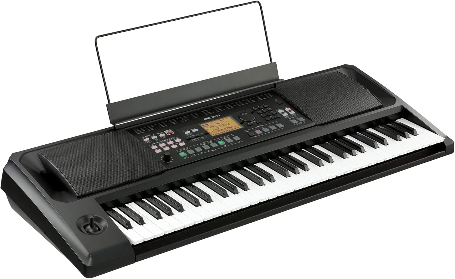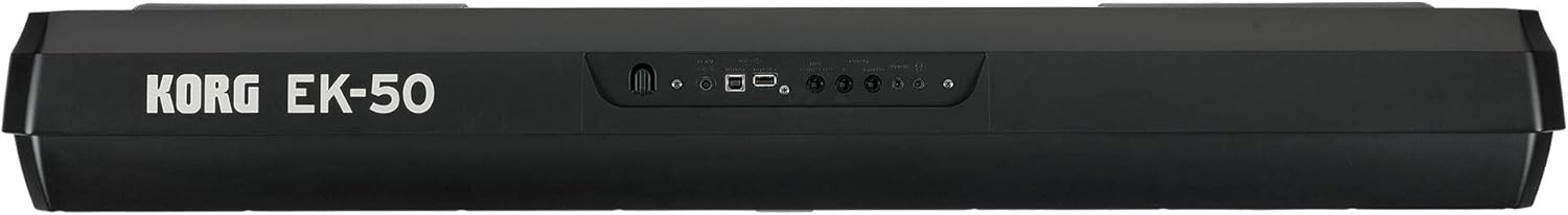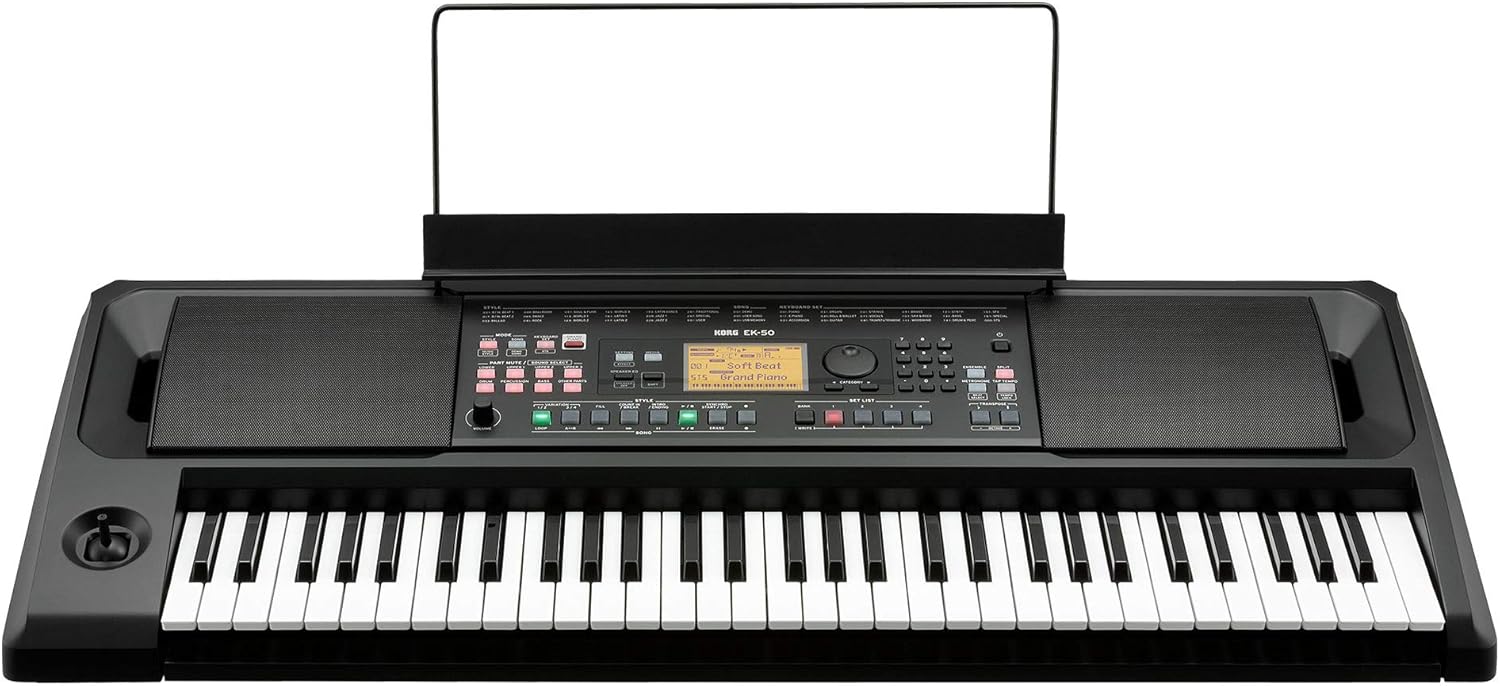 TASTIERA KORG EK-50: 61 tasti con risposta al tocco, controlli illuminati, oltre 700 suoni (256 STS), 280 stili + oltre 16 stili musicali (4 variazioni), riproduttore di brani flessibile (formato MIDI, MP3 e WAV), potente sistema di altoparlanti (2x 10 watt), set list programmabile (4x 10 banchi) 64 voci polifoniche, joystick a 4 vie, connessioni: Line OUT, USB, pedale, cuffie, ingresso audio (smartphone), funzionamento a batteria possibile per uso mobile (7 ore), registratore di brani, sistema operativo aggiornabile, dimensioni: 994 x 392 x 132 mm (altezza con leggio: 329 mm), peso: 7,5 kg, colore: nero pieghevole, verniciatura a polvere nera, polsini in gomma antiscivolo, regolazione in altezza da 62 a 100 cm, profondità del supporto: 33,5 cm, peso: 3 kg, colore: nero, incl. supporto per fascette CUFFIE: dinamiche, , altoparlanti: ø 40 mm, campo di trasmissione: da 20 a 20.000 Hz, sensibilità: 110 db SPL (a 1 kHz), guscio circumaurale imbottito e tracolla larga, regolabile in 12 livelli per lato, bassi attivi integrati, controllo del volume integrato nel cavo, peso lordo: 283 g, colore: nero SCUOLA DI TASTIERA: Scuola di tastiera per principianti, autore: Michael Christoph, adatto anche per lo studio individuale per principianti, spiegazioni di base di tastiera, note, scale e accordi, con melodie conosciute (ad esempio "Morning has Broken"), funzioni tipiche della tastiera come accompagnamento automatico e funzione di trasposizione, volume: 32 pagine, formato: DIN A4, inclusi 21 video e 18 playalong da scaricare